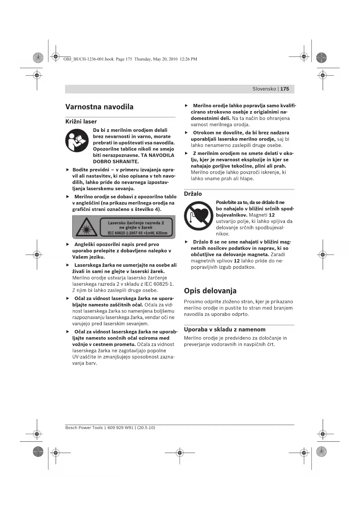 Varnostna navodila Križni laser Da bi z merilnim orodjem delali brez nevarnosti in varno, morate prebrati in upoštevati vsa navodila. Opozorilne tablice nikoli ne smejo biti nerazpoznavne. TA NAVODILA DOBRO SHRANITE. f Bodite previdni – v primeru izvajanja opra- vil ali nastavitev, ki niso opisana v teh navo- dilih, lahko pride do nevarnega izpostav- ljanja laserskemu sevanju. f Merilno orodje se dobavi z opozorilno tablo v angleščini (na prikazu merilnega orodja na grafični strani označeno s številko 4). f Angleški opozorilni napis pred prvo uporabo prelepite z dobavljeno nalepko v Vašem jeziku. f Laserskega žarka ne usmerjajte na osebe ali živali in sami ne glejte v laserski žarek. Merilno orodje ustvarja lasersko žarčenje laserskega razreda 2 v skladu z IEC 60825-1. Z njim bi lahko zaslepili druge osebe. f Očal za vidnost laserskega žarka ne upora- bljajte namesto zaščitnih očal. Očala za vid- nost laserskega žarka so namenjena boljšemu razpoznavanju laserskega žarka, vendar oči ne varujejo pred laserskim sevanjem. f Očal za vidnost laserskega žarka ne uporab- ljajte namesto sončnih očal oziroma med vožnjo v cestnem prometu. Očala za vidnost laserskega žarka ne zagotavljajo popolne UV-zaščite in zmanjšujejo sposobnost zazna- vanja barv. f Merilno orodje lahko popravlja samo kvalifi- cirano strokovno osebje z origialnimi na- domestnimi deli. Na ta način bo ohranjena varnost merilnega orodja. f Otrokom ne dovolite, da bi brez nadzora uporabljali lasersko merilno orodje, saj bi lahko nenamerno zaslepili druge osebe. f Z merilnim orodjem ne smete delati v oko- lju, kjer je nevarnost eksplozije in kjer se nahajajo gorljive tekočine, plini ali prah. Merilno orodje lahko povzroči iskrenje, ki lahko vname prah ali hlape. Držalo Poskrbite za to, da se držalo 8 ne bo nahajalo v bližini srčnih spod- bujevalnikov. Magneti 12 ustvarijo polje, ki lahko vpljiva da delovanje srčnih spodbujeval- nikov. f Držalo 8 se ne sme nahajati v bližini mag- netnih nosilcev podatkov in naprav, ki so občutljive na delovanje magneta. Zaradi magnetnih vplivov 12 lahko pride do ne- popravljivih izgub podatkov. Opis delovanja Prosimo odprite zloženo stran, kjer je prikazano merilno orodje in pustite to stran med branjem navodila za uporabo odprto. Uporaba v skladu z namenom Merilno orodje je predvideno za določanje in preverjanje vodoravnih in navpičnih črt. OBJ_BUCH-1236-001.book Page 175 Thursday, May 20, 2010 12:26 PM176 | Slovensko 1 609 929 W91 | (20.5.10) Bosch Power Tools Tehnični podatki Komponente na sliki Oštevilčenje naslikanih komponent se nanaša na prikaz merilnega orodja na strani z grafiko. 1 Izstopna odprtina laserskega žarka 2 Prijemalo za stativ 1/4" 3 Vklopno/izklopno stikalo 4 Opozorilna ploščica laserja 5 Serijska številka 6 Aretiranje pokrova predalčka za baterije 7 Pokrov predalčka za baterije 8 Držalo 9 Fiksirni fijak držala 10 Vijačne luknje držala 11 Vodilo pasu 12 Magneti 13 Prijemalo stativa 1/4" na držalu 14 Prijemalo stativa 5/8" na držalu 15 Zaščitna torba 16 Očala za vidnost laserskega žarka* 17 Merilna plošča s podnožjem* 18 Stativ*