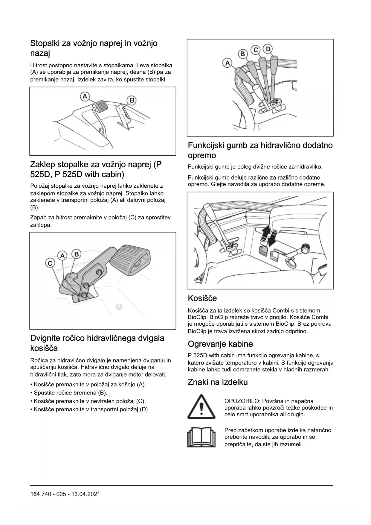 Funkcijski gumb za hidravlično dodatno opremo Funkcijski gumb je poleg dvižne ročice za hidravliko. Funkcijski gumb deluje različno za različno dodatno opremo. Glejte navodila za uporabo dodatne opreme. Kosišče Kosišča za ta izdelek so kosišča Combi s sistemom BioClip. BioClip razreže travo v gnojilo. Kosišče Combi je mogoče uporabljati s sistemom BioClip. Brez pokrova BioClip je trava izvržena skozi zadnjo odprtino. Ogrevanje kabine P 525D with cabin ima funkcijo ogrevanja kabine, s katero zvišate temperaturo v kabini. S funkcijo ogrevanja kabine lahko tudi odmrznete stekla v hladnih razmerah. Znaki na izdelku OPOZORILO: Površna in napačna uporaba lahko povzroči težke poškodbe in celo smrt uporabnika ali drugih. Pred začetkom uporabe izdelka natančno preberite navodila za uporabo in se prepričajte, da ste jih razumeli. 164 740 - 005 - 13.04.2021Vrtljiva rezila. Ko je motor vklopljen, se izogibajte stiku s pokrovom. Opozorilo: vrtljivi deli. Izogibajte se stiku z njimi. Opozorilo: vrteča jermenica. Ko je motor vklopljen, se izogibajte stiku s telesom. Opozorilo: nevarnost poškodb zaradi stisnjenja. Opozorilo: nevarnost poškodb zaradi stisnjenja. Dvižne ročice se bodo premaknile z veliko silo, zato se izogibajte stiku s telesom. Pazite na leteče in odbite predmete. Vroča površina. Izdelka nikoli ne uporabljajte, če so v bližini druge osebe, še posebej otroci, in živali. Pred in med vzvratno vožnjo z izdelkom glejte nazaj. Nikoli ne kosite trave po vzpetinah z naklonom. Izdelka ne uporabljajte na pobočjih z naklonom, večjim od 10°. Glejte Košnja na klančinah na strani 169