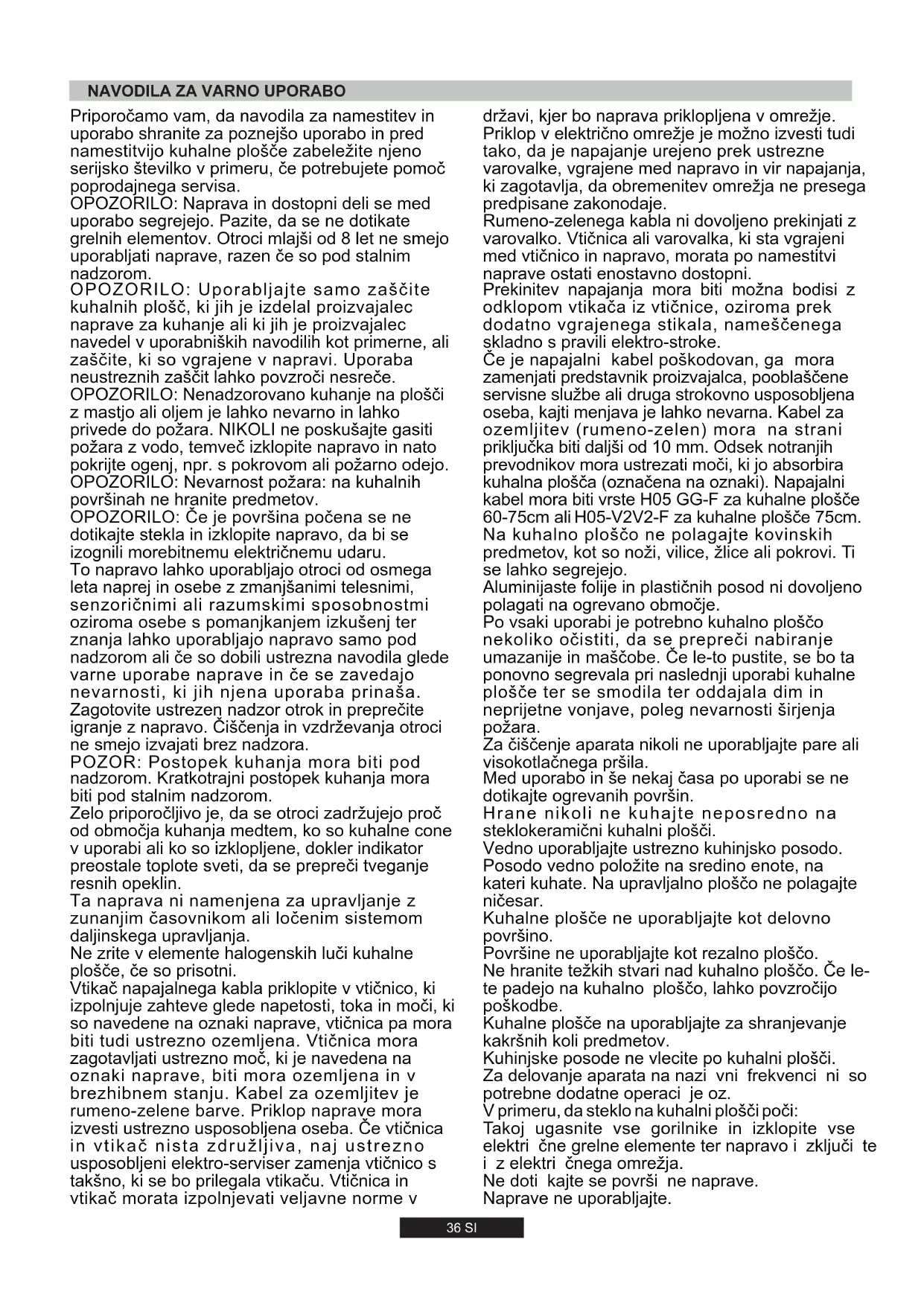 ZA UPORABNIKA Dovoljena je samo namenska uporaba kuhalne plošče, tj. za kuhanje v gospodinjstvih. Drugačna uporaba ni dovoljena in predstavlja tveganje za uporabnika. Proizvajalec ne prevzema odgovornosti za poškodbe ali škodo zaradi nenamenske uporabe.