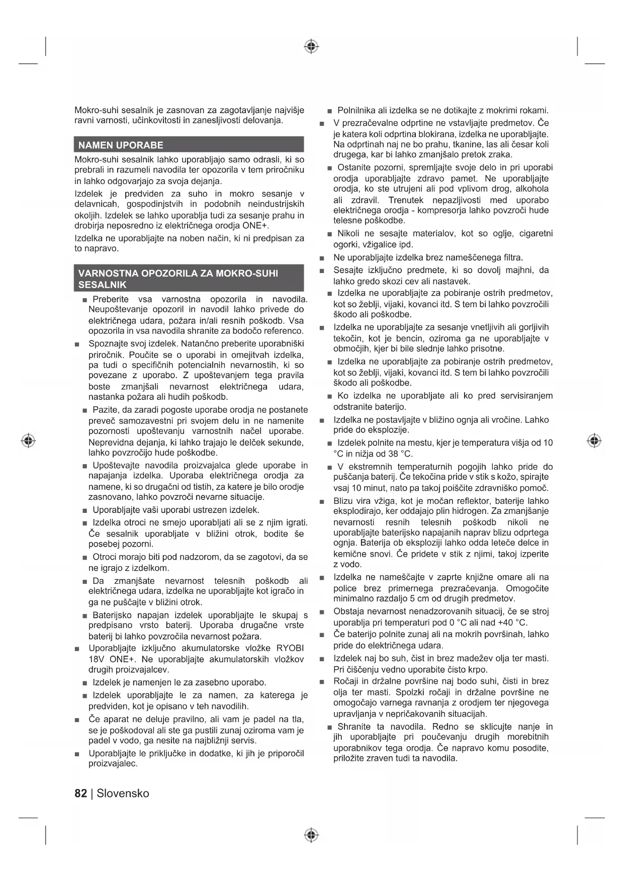 SESALNIK ■ Preberite vsa varnostna opozorila in navodila. Neupoštevanje opozoril in navodil lahko privede do električnega udara, požara in/ali resnih poškodb. Vsa opozorila in vsa navodila shranite za bodočo referenco. ■ Spoznajte svoj izdelek. Natančno preberite uporabniški priročnik. Poučite se o uporabi in omejitvah izdelka, pa tudi o specifičnih potencialnih nevarnostih, ki so povezane z uporabo. Z upoštevanjem tega pravila boste zmanjšali nevarnost električnega udara, nastanka požara ali hudih poškodb. ■ Pazite, da zaradi pogoste uporabe orodja ne postanete preveč samozavestni pri svojem delu in ne namenite pozornosti upoštevanju varnostnih načel uporabe. Neprevidna dejanja, ki lahko trajajo le delček sekunde, lahko povzročijo hude poškodbe. ■ Upoštevajte navodila proizvajalca glede uporabe in napajanja izdelka. Uporaba električnega orodja za namene, ki so drugačni od tistih, za katere je bilo orodje zasnovano, lahko povzroči nevarne situacije. ■ Uporabljajte vaši uporabi ustrezen izdelek. ■ Izdelka otroci ne smejo uporabljati ali se z njim igrati. Če sesalnik uporabljate v bližini otrok, bodite še posebej pozorni. ■ Otroci morajo biti pod nadzorom, da se zagotovi, da se ne igrajo z izdelkom. ■ Da zmanjšate nevarnost telesnih poškodb ali električnega udara, izdelka ne uporabljajte kot igračo in ga ne puščajte v bližini otrok. ■ Baterijsko napajan izdelek uporabljajte le skupaj s predpisano vrsto baterij. Uporaba drugačne vrste baterij bi lahko povzročila nevarnost požara. ■ Uporabljajte izključno akumulatorske vložke RYOBI 18V ONE+. Ne uporabljajte akumulatorskih vložkov drugih proizvajalcev. ■ Izdelek je namenjen le za zasebno uporabo. ■ Izdelek uporabljajte le za namen, za katerega je predviden, kot je opisano v teh navodilih. ■ Če aparat ne deluje pravilno, ali vam je padel na tla, se je poškodoval ali ste ga pustili zunaj oziroma vam je padel v vodo, ga nesite na najbližnji servis. ■ Uporabljajte le priključke in dodatke, ki jih je priporočil proizvajalec. ■ Polnilnika ali izdelka se ne dotikajte z mokrimi rokami. ■ V prezračevalne odprtine ne vstavljajte predmetov. Če je katera koli odprtina blokirana, izdelka ne uporabljajte. Na odprtinah naj ne bo prahu, tkanine, las ali česar koli drugega, kar bi lahko zmanjšalo pretok zraka. ■ Ostanite pozorni, spremljajte svoje delo in pri uporabi orodja uporabljajte zdravo pamet. Ne uporabljajte orodja, ko ste utrujeni ali pod vplivom drog, alkohola ali zdravil. Trenutek nepazljivosti med uporabo električnega orodja - kompresorja lahko povzroči hude telesne poškodbe. ■ Nikoli ne sesajte materialov, kot so oglje, cigaretni ogorki, vžigalice ipd. ■ Ne uporabljajte izdelka brez nameščenega filtra. ■ Sesajte izključno predmete, ki so dovolj majhni, da lahko gredo skozi cev ali nastavek. ■ Izdelka ne uporabljajte za pobiranje ostrih predmetov, kot so žeblji, vijaki, kovanci itd. S tem bi lahko povzročili škodo ali poškodbe. ■ Izdelka ne uporabljajte za sesanje vnetljivih ali gorljivih tekočin, kot je bencin, oziroma ga ne uporabljajte v območjih, kjer bi bile slednje lahko prisotne. ■ Izdelka ne uporabljajte za pobiranje ostrih predmetov, kot so žeblji, vijaki, kovanci itd. S tem bi lahko povzročili škodo ali poškodbe. ■ Ko izdelka ne uporabljate ali ko pred servisiranjem odstranite baterijo. ■ Izdelka ne postavljajte v bližino ognja ali vročine. Lahko pride do eksplozije. ■ Izdelek polnite na mestu, kjer je temperatura višja od 10 °C in nižja od 38 °C. ■ V ekstremnih temperaturnih pogojih lahko pride do puščanja baterij. Če tekočina pride v stik s kožo, spirajte vsaj 10 minut, nato pa takoj poiščite zdravniško pomoč. ■ Blizu vira vžiga, kot je močan reflektor, baterije lahko eksplodirajo, ker oddajajo plin hidrogen. Za zmanjšanje nevarnosti resnih telesnih poškodb nikoli ne uporabljajte baterijsko napajanih naprav blizu odprtega ognja. Baterija ob eksploziji lahko odda leteče delce in kemične snovi. Če pridete v stik z njimi, takoj izperite z vodo. ■ Izdelka ne nameščajte v zaprte knjižne omare ali na police brez primernega prezračevanja. Omogočite minimalno razdaljo 5 cm od drugih predmetov. ■ Obstaja nevarnost nenadzorovanih situacij, če se stroj uporablja pri temperaturi pod 0 °C ali nad +40 °C. ■ Če baterijo polnite zunaj ali na mokrih površinah, lahko pride do električnega udara. ■ Izdelek naj bo suh, čist in brez madežev olja ter masti. Pri čiščenju vedno uporabite čisto krpo. ■ Ročaji in držalne površine naj bodo suhi, čisti in brez olja ter masti. Spolzki ročaji in držalne površine ne omogočajo varnega ravnanja z orodjem ter njegovega upravljanja v nepričakovanih situacijah. ■ Shranite ta navodila. Redno se sklicujte nanje in jih uporabljajte pri poučevanju drugih morebitnih uporabnikov tega orodja. Če napravo komu posodite, priložite zraven tudi ta navodila.83 Slovensko |