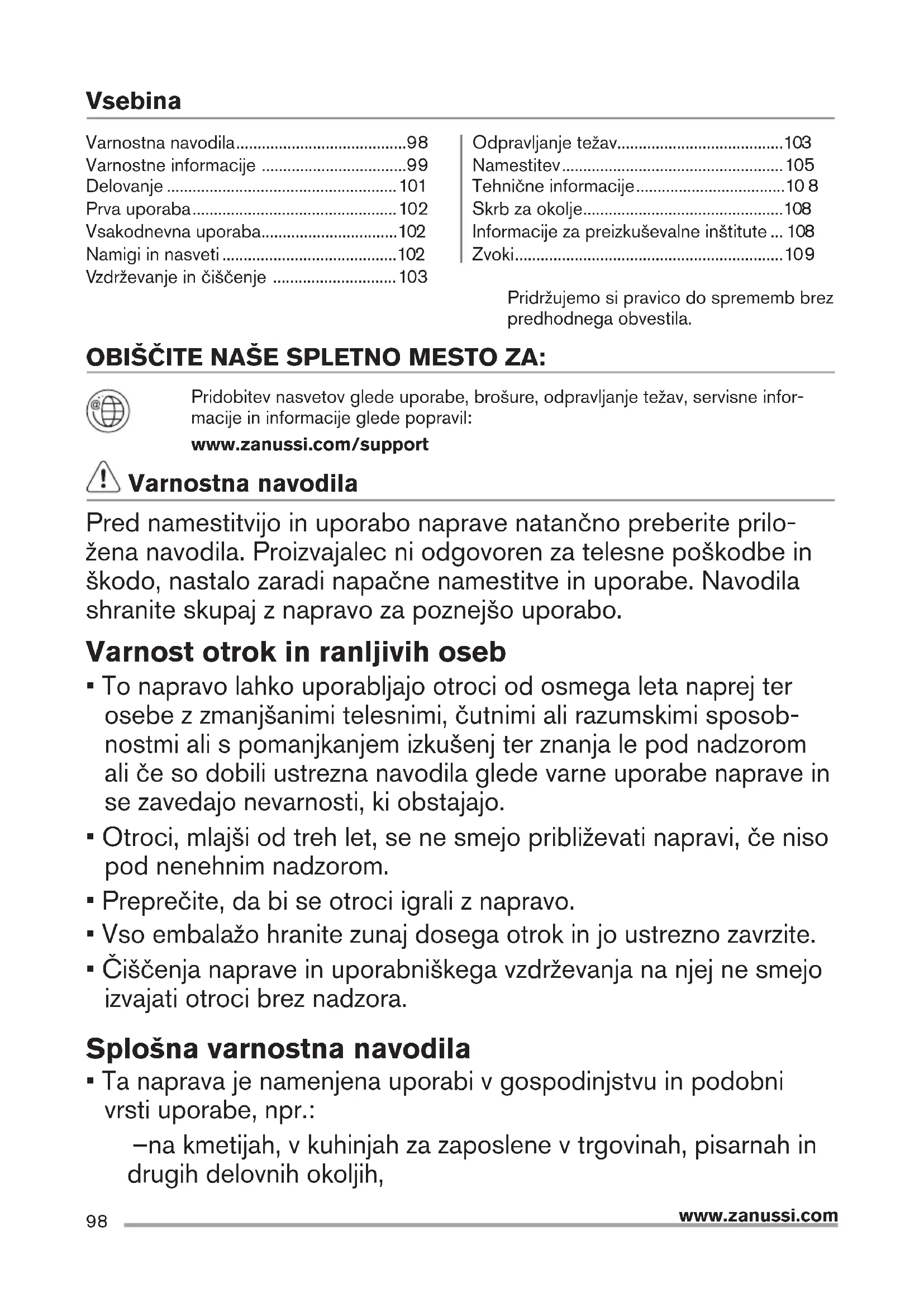 - Ta naprava je namenjena uporabi v gospodinjstvu in podobni vrsti uporabe, npr.: –na kmetijah, v kuhinjah za zaposlene v trgovinah, pisarnah in drugih delovnih okoljih, Varnostna navodila ........................................98 Varnostne informacije ..................................99 Delovanje ......................................................101 Prva uporaba ................................................ 102 Vsakodnevna uporaba ................................102 Namigi in nasveti .........................................102 Vzdrževanje in čiščenje ............................. 103 Odpravljanje težav.......................................103 Namestitev .................................................... 105 Tehnične informacije ...................................10 8 Skrb za okolje ...............................................108 Informacije za preizkuševalne inštitute ... 108 Zvoki ............................................................... 10999 www.zanussi.com –s strani gostov v hotelih, motelih, prenočiščih z zajtrkom in drugih stanovanjskih okoljih.