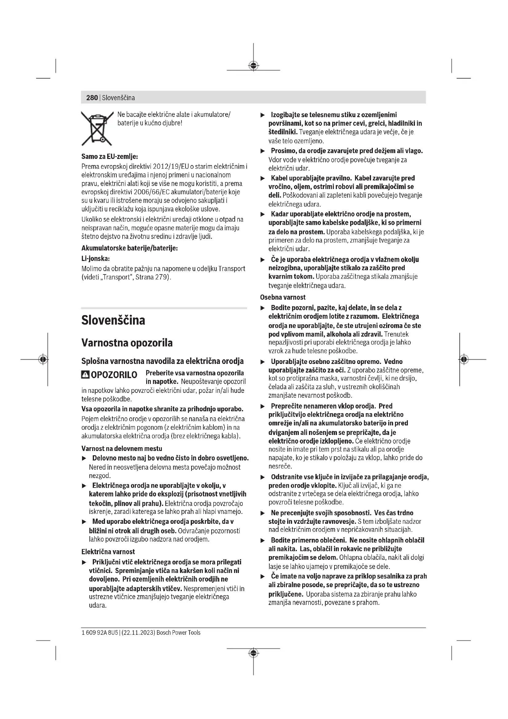 1,5 1,5 1,5 Vrednosti nivoja tresljajev in hrupa, podane v teh navodilih, so bile izmerjene v skladu s standardiziranim merilnim postopkom in se lahko uporabljajo za medsebojno primerjavo električnih orodij. Primerne so tudi za začasno oceno oddajanja tresljajev in hrupa. Naveden nivo tresljajev in hrupa je določen na osnovi glavnih načinov uporabe električnega orodja. Pri uporabi orodja v drugačne namene, z drugačnimi nastavki ali pri nezadostnem vzdrževanju lahko nivo hrupa in tresljajev odstopa. To lahko obremenjenost s hrupom in tresljaji v celotnem obdobju uporabe občutno poveča. Za natančnejšo oceno obremenjenosti s hrupom in tresljaji morate upoštevati tudi čas, ko je orodje izklopljeno, in čas, ko orodje deluje, vendar dejansko ni v uporabi. To lahko občutno zmanjša obremenjenost s hrupom in tresljaji, ki je razporejena na celotno obdobje uporabe. Določite dodatne varnostne ukrepe za zaščito uporabnika pred vplivi tresljajev, npr. vzdrževanje električnega orodja in nastavkov, segrevanje rok, organizacija delovnih postopkov. Akumulatorska baterija u Pred začetkom kakršnihkoli del na električnem orodju (na primer vzdrževanje, zamenjava orodja in podobno) kakor tudi med transportiranjem in shranjevanjem je treba iz električnega orodja odstraniti akumulatorsko baterijo. Prinenamernem aktiviranju vklopno/izklopnega stikala obstaja nevarnost telesnih poškodb. PodjetjeBosch prodaja akumulatorska električna orodja tudi brez priložene akumulatorske baterije. Ali je v obseg dobave vključena tudi akumulatorska baterija, je navedeno na embalaži. Polnjenje akumulatorske baterije u Uporabljajte samo polnilnike, ki so navedeni v tehničnih podatkih. Samo ti polnilniki so usklajeni z litij- ionsko akumulatorsko baterijo, ki je nameščena v električnem orodju. Opomba: litij-ionske akumulatorske baterije se zaradi mednarodnih transportnih predpisov dobavljajo delno napolnjene. Da zagotovite polno zmogljivost akumulatorske baterije, jo pred prvo uporabo popolnoma napolnite. Namestitev akumulatorske baterije Napolnjeno akumulatorsko baterijo vstavite v ležišče za akumulatorsko baterijo, da se zaskoči. Odstranitev akumulatorske baterije Akumulatorsko baterijo odstranite tako, da pritisnete tipko za sprostitev akumulatorske baterije in izvlečete akumulatorsko baterijo. Pri tem ne uporabljajte sile. Akumulatorska baterijaima 2 ravni zapore, ki preprečujeta, da bi akumulatorska baterija ob nenamernem pritisku tipke za sprostitev akumulatorske baterijeizpadla. Ko je akumulatorska baterija vstavljena v električno orodje, jo varuje vzmet. Prikaz stanja napolnjenosti akumulatorske baterije Opomba: nekatere vrste akumulatorskih baterij morda niso opremljene s prikazom stanja napolnjenosti. Tri zelene LED-lučke prikaza stanja napolnjenosti akumulatorske baterije prikazujejo stanje napolnjenosti akumulatorske baterije. Iz varnostnih razlogov je stanje napolnjenosti mogoče prikazati le, ko je električno orodje izklopljeno. Za prikaz stanja napolnjenosti pritisnite tipko ali na prikazu stanja napolnjenosti. To je mogoče tudi takrat, ko akumulatorska baterija ni vstavljena. Če po pritisku tipke za prikaz stanja napolnjenosti LED-diode ne zasvetijo, je akumulatorska baterija okvarjena in jo je treba zamenjati. Stanje napolnjenosti akumulatorske baterije je prikazano tudi na uporabniškem vmesniku(glejte „Prikazi stanja“, Stran286). Vrsta akumulatorske baterije GBA 18V... LED-dioda Napolnjenost 3zelene LED-diode neprekinjeno svetijo 60–100% 2zeleni LED-diodi neprekinjeno svetita 30–60% 1zelena LED-dioda neprekinjeno sveti 5–30% 1zelena LED-dioda utripa 0–5% Vrsta akumulatorske baterije ProCORE18V... LED-dioda Napolnjenost 5zelenih LED-diod neprekinjeno sveti 80–100% 4zelene LED-diode neprekinjeno svetijo 60–80% 3zelene LED-diode neprekinjeno svetijo 40–60% 2zeleni LED-diodi neprekinjeno svetita 20–40% 1zelena LED-dioda neprekinjeno sveti 5–20% 1zelena LED-dioda utripa 0–5% Navodila za optimalno uporabo akumulatorske baterije Akumulatorsko baterijo zavarujte pred vlago in vodo. 1 609 92A 8U5 | (22.11.2023) Bosch Power ToolsSlovenščina | 285 Akumulatorsko baterijo skladiščite samo v temperaturnem območju od –20 °C do 50 °C. Poleti ne dovolite, da bi akumulatorska baterija obležala v avtomobilu. Prezračevalne reže akumulatorske baterije občasno očistite z mehkim, čistim in suhim čopičem. Bistveno krajši čas delovanja po polnjenju pomeni, da je akumulatorska baterija izrabljena in da jo je treba zamenjati. Upoštevajte navodila za odstranjevanje. Namestitev u Pred začetkom kakršnihkoli del na električnem orodju (na primer vzdrževanje, zamenjava orodja in podobno) kakor tudi med transportiranjem in shranjevanjem je treba iz električnega orodja odstraniti akumulatorsko baterijo. Prinenamernem aktiviranju vklopno/izklopnega stikala obstaja nevarnost telesnih poškodb. Polnjenje vlagalnika (glejte slikeA1−A4) u Pred nastavljanjem orodja, zamenjavo delov pribora ali odlaganjem električnega orodja odstranite akumulatorsko baterijo. S tem previdnostnim ukrepom boste preprečili nenameren zagon električnega orodja. Uporabljajte le originalni priborBosch. Fini deli električnega orodja, kot so npr. vlagalnik, ustje in izstreljevalni kanal, so združljivi s sponkami, žeblji in žičniki podjetjaBosch. Drugi proizvajalci uporabljajo jeklo drugačne kakovosti in drugačnih dimenzij. Opomba: uporabljajte samo elemente za pribijanje, ki so navedeni v preglednici „Tehnični podatki“. Uporaba neodobrenih elementov za pribijanje lahko poškoduje električno orodje in privede do telesnih poškodb. Električno orodje med polnjenjem vlagalnika držite tako, da je ustje(18) usmerjeno stran od vašega telesa in drugih oseb. – Po potrebi očistite pomikalo vlagalnika(15) in se prepričajte, da je vlagalnik(14) prost umazanije. – Primeren trak z žeblji(20) vstavite v režo v obliki črke T na koncu vlagalnika(14). – Trak z žeblji vst
