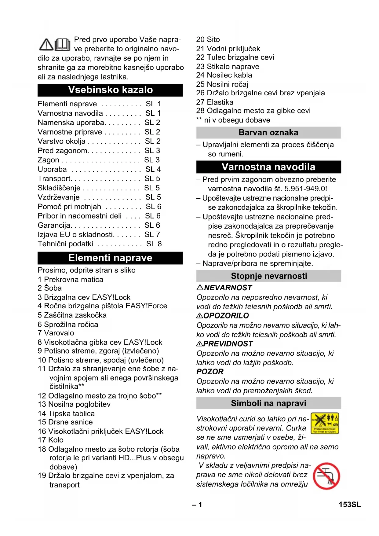 dB(A) 89 Rozměry a hmotnost Délka mm 351 Šířka mm 312 Výška mm 904 Typická provozní hmotnost kg 20,5 152 CS– 1 Pred prvo uporabo Vaše napra- ve preberite to originalno navo- dilo za uporabo, ravnajte se po njem in shranite ga za morebitno kasnejšo uporabo ali za naslednjega lastnika. Prosimo, odprite stran s sliko 1 Prekrovna matica 2 Šoba 3 Brizgalna cev EASY!Lock 4 Ročna brizgalna pištola EASY!Force 5 Zaščitna zaskočka 6 Sprožilna ročica 7 Varovalo 8 Visokotlačna gibka cev EASY!Lock 9 Potisno streme, zgoraj (izvlečeno) 10 Potisno streme, spodaj (uvlečeno) 11 Držalo za shranjevanje ene šobe z na- vojnim spojem ali enega površinskega čistilnika** 12 Odlagalno mesto za trojno šobo** 13 Nosilna poglobitev 14 Tipska tablica 15 Drsne sanice 16 Visokotlačni priključek EASY!Lock 17 Kolo 18 Odlagalno mesto za šobo rotorja (šoba rotorja le pri varianti HD...Plus v obsegu dobave) 19 Držalo brizgalne cevi z vpenjalom, za transport 20 Sito 21 Vodni priključek 22 Tulec brizgalne cevi 23 Stikalo naprave 24 Nosilec kabla 25 Nosilni ročaj 26 Držalo brizgalne cevi brez vpenjala 27 Elastika 28 Odlagalno mesto za gibke cevi ** ni v obsegu dobave – Upravljalni elementi za proces čiščenja so rumeni. – Pred prvim zagonom obvezno preberite varnostna navodila št. 5.951-949.0! – Upoštevajte ustrezne nacionalne predpi- se zakonodajalca za škropilnike tekočin. – Upoštevajte ustrezne nacionalne pred- pise zakonodajalca za preprečevanje nesreč. Škropilnik tekočin je potrebno redno pregledovati in o rezultatu pregle- da je potrebno podati pismeno izjavo. – Naprave/pribora ne spreminjajte. NEVARNOST Opozorilo na neposredno nevarnost, ki vodi do težkih telesnih poškodb ali smrti. 몇 OPOZORILO Opozorilo na možno nevarno situacijo, ki lah- ko vodi do težkih telesnih poškodb ali smrti. 몇 PREVIDNOST Opozorilo na možno nevarno situacijo, ki lahko vodi do lažjih poškodb. POZOR Opozorilo na možno nevarno situacijo, ki lahko vodi do premoženjskih škod. Visokotlačni curki so lahko pri ne- strokovni uporabi nevarni. Curka se ne sme usmerjati v osebe, ži- vali, aktivno električno opremo ali na samo napravo. V skladu z veljavnimi predpisi na- prava ne sme nikoli delovati brez sistemskega ločilnika na omrežju Vsebinsko kazalo Elementi naprave . . . . . . . . . . SL 1 Varnostna navodila . . . . . . . . . SL 1 Namenska uporaba. . . . . . . . . SL 2 Varnostne priprave . . . . . . . . . SL 2 Varstvo okolja . . . . . . . . . . . . . SL 2 Pred zagonom. . . . . . . . . . . . . SL 3 Zagon . . . . . . . . . . . . . . . . . . . SL 3 Uporaba . . . . . . . . . . . . . . . . . SL 4 Transport. . . . . . . . . . . . . . . . . SL 5 Skladiščenje . . . . . . . . . . . . . . SL 5 Vzdrževanje . . . . . . . . . . . . . . SL 5 Pomoč pri motnjah . . . . . . . . . SL 6 Pribor in nadomestni deli . . . . SL 6 Garancija. . . . . . . . . . . . . . . . . SL 6 Izjava EU o skladnosti. . . . . . . SL 7 Tehnični podatki . . . . . . . . . . . SL 8 Elementi naprave Barvan oznaka Varnostna navodila Stopnje nevarnosti Simboli na napravi 153SL– 2 pitne vode. Uporabiti je treba ustrezen sis- temski ločilnik podjetja KÄRCHER ali alter- nativno sistemski ločilnik v skladu z EN 12729 tipa BA. Voda, ki je tekla skozi sistemski ločevalnik, je klasificirana kot nepitna. Ta visokotlačni čistilnik uporabljajte izključno – za čiščenje z visokotlačnim curkom (npr. čiščenje fasad, teras, vrtnega orodja). Z opcijskim priborom se lahko doda čistilno sredstvo. Za trdovratno umazanijo priporočamo ro- torsko šobo (le pri varianti HD...Plus v ob- segu dobave) Zahteve za kakovost vode: POZOR Kot visokotlačni medij se sme uporabljati le čista voda. Umazanije vodijo do predčasne obrabe ali oblog v stroju. Če se uporabi reciklirana voda, se nasle- dnjih mejnih vrednsoti ne sme prekoračiti. Varnostne naprave so namenjene zaščiti uporabnika zato jih ne smete ustaviti ali se izogibati njihovi funkciji. Če sprožilno ročico na ročni brizgalni pištoli spustite, tlačno stikalo izklopi črpalko in vi- sokotlačni curek se ustavi. Če sprožilno ro- čico povlečete, se črpalka ponovno vklopi. Električne in elektronske naprave imajo po- gosto sestavne dele, ki pri nepravilnem rav- nanju ali odstranjevanju med odpadke lah- ko predstavljajo nevarnost za zdravje ljudi in okolje. Ti sestavni deli so kljub temu po- membni za pravilno delovanje naprav. Na- prav, označenih s tem simbolom, ne smete odvreči med gospodinjske odpadke. Opozorila k sestavinam (REACH) Aktualne informacije o sestavinah najdete na: www.kaercher.com/REACH Namenska uporaba pH vrednost 6,5...9,5 električna prevodnost * Prevodnost sveže vode +1200 μS/cm usedljive snovi ** < 0,5 mg/l filtrirane snovi *** < 50 mg/l Ogljikovodiki < 20 mg/l Klorid < 300 mg/l Sulfat < 240 mg/l kalcij < 200 mg/l Skupna trdota < 28 °dH < 50 °TH < 500 ppm (mg CaCO
