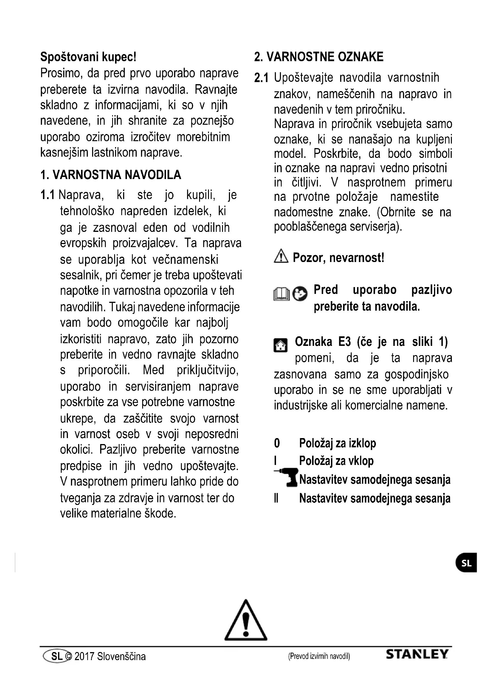 OPOzOriLO. NE uporabljajte naprave, če je napajalni kabel poškodovan. Če je napajalni kabel poškodovan, ga mora zamenjati proizvajalec, pooblaščeni servisni center ali podobno kvalificirana oseba, ki zna preprečiti nevarnost.196 197 (Prevod izvirnih navodil) SL © 2017 Slovenščina (Prevod izvirnih navodil) SL © 2017 Slovenščina