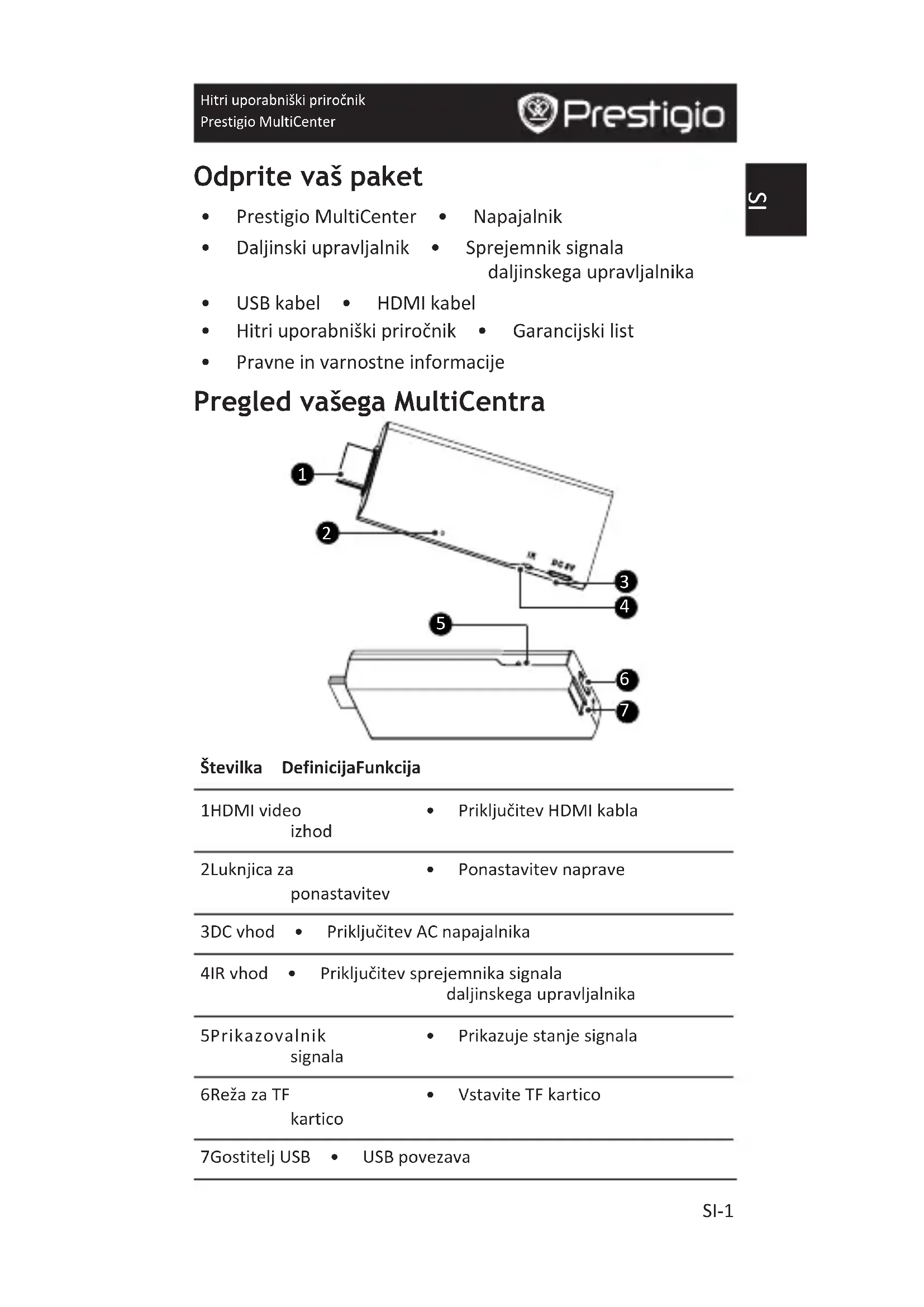 - VstaviteTFkartico 7 GostiteljUSB • USBpovezava PAD2411 QSG.indd 83 2013/12/16 15:35:21SI Hitri uporabniški priročnik Prestigio MultiCenter SI-2 Pregled daljinskega upravlalnika