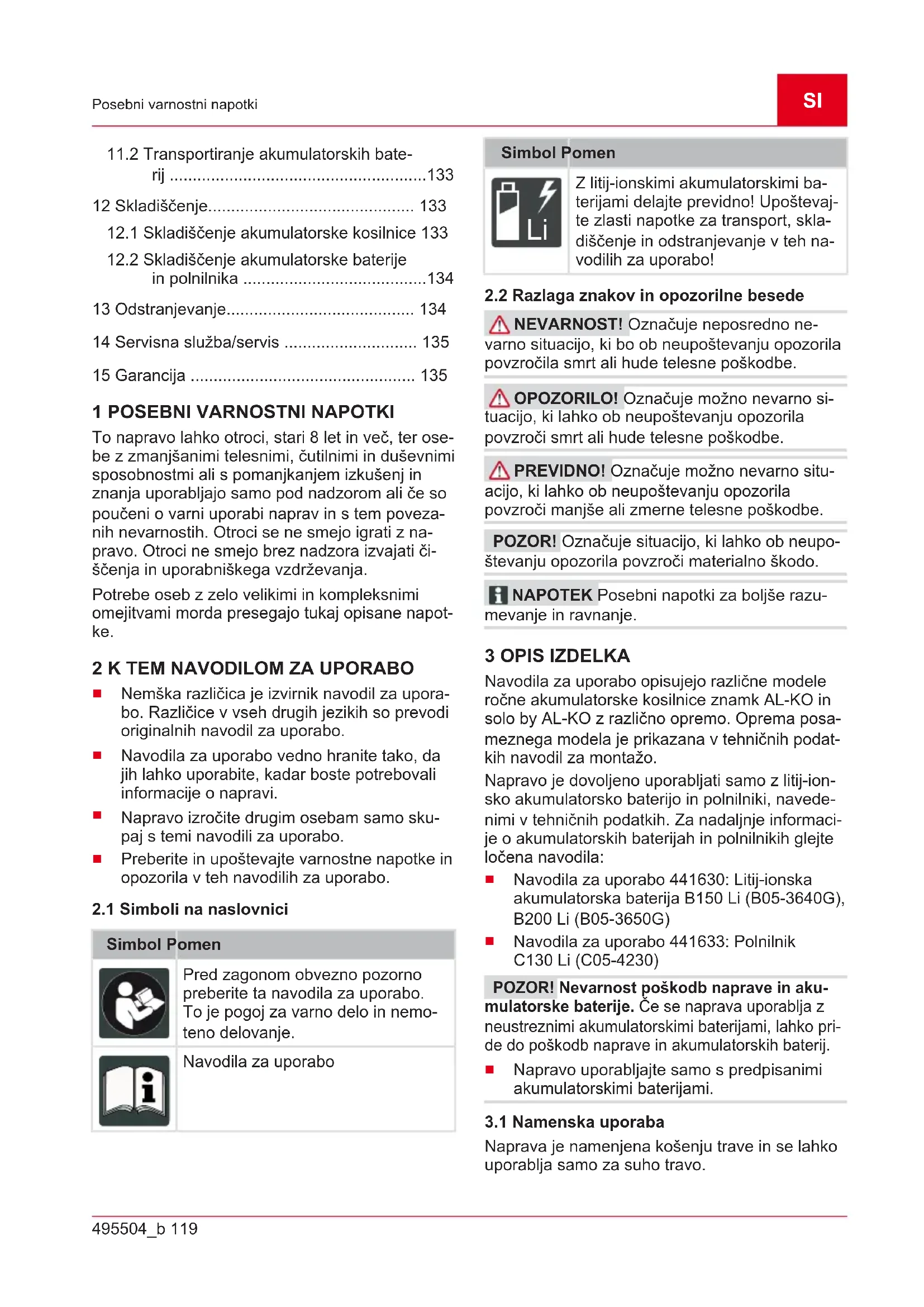 NEVARNOST! Označuje neposredno ne- varno situacijo, ki bo ob neupoštevanju opozorila povzročila smrt ali hude telesne poškodbe. OPOZORILO! Označuje možno nevarno si- tuacijo, ki lahko ob neupoštevanju opozorila povzroči smrt ali hude telesne poškodbe. PREVIDNO! Označuje možno nevarno situ- acijo, ki lahko ob neupoštevanju opozorila povzroči manjše ali zmerne telesne poškodbe. POZOR! Označuje situacijo, ki lahko ob neupo- števanju opozorila povzroči materialno škodo. NAPOTEK Posebni napotki za boljše razu- mevanje in ravnanje. 3 OPIS IZDELKA Navodila za uporabo opisujejo različne modele ročne akumulatorske kosilnice znamk AL-KO in solobyAL‑KO z različno opremo. Oprema posa- meznega modela je prikazana v tehničnih podat- kih navodil za montažo. Napravo je dovoljeno uporabljati samo z litij-ion- sko akumulatorsko baterijo in polnilniki, navede- nimi v tehničnih podatkih. Za nadaljnje informaci- je o akumulatorskih baterijah in polnilnikih glejte ločena navodila: