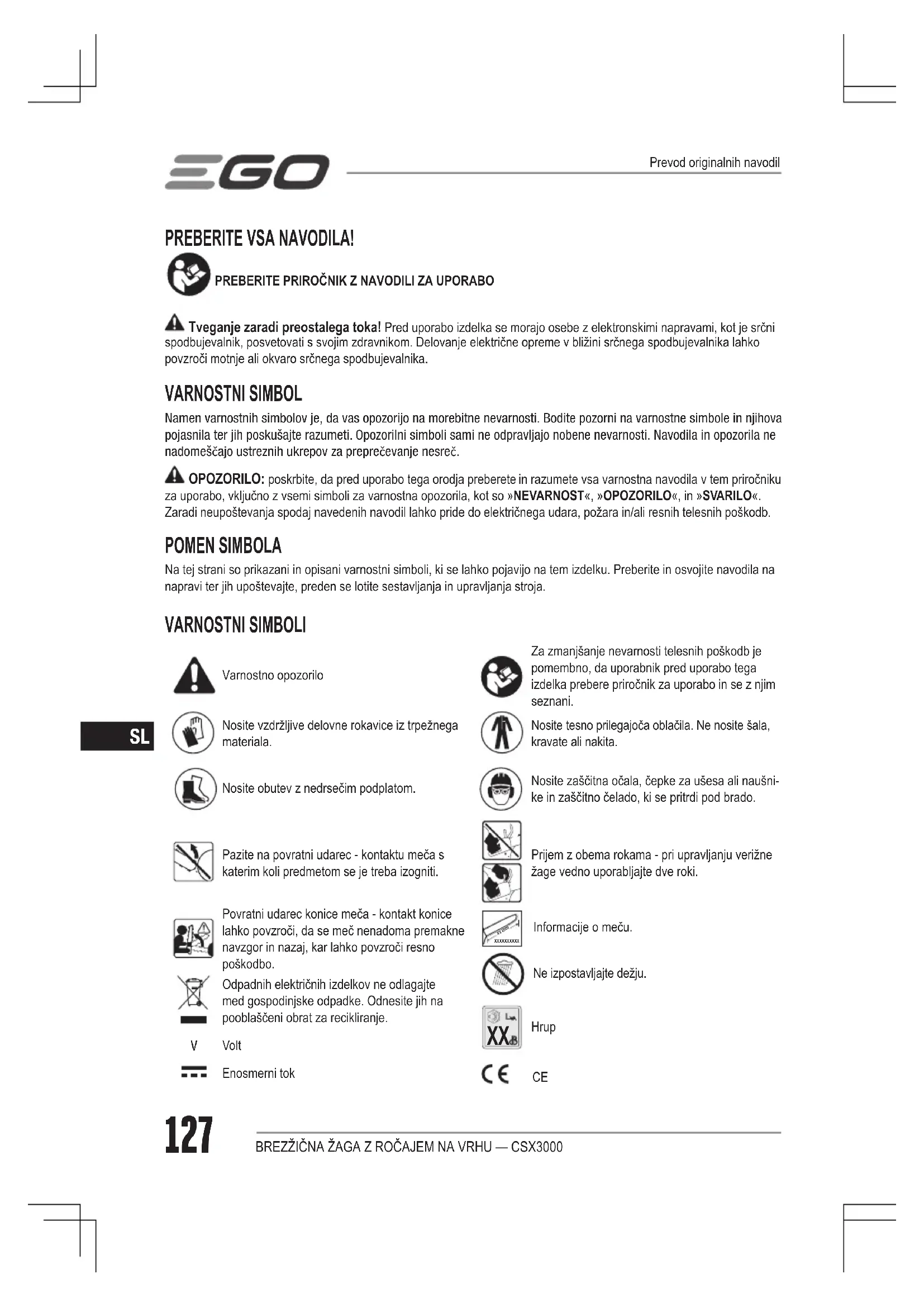 BREZŽIČNA ŽAGA Z ROČAJEM NA VRHU — CSX3000 PREBERITE VSA NAVODILA! PREBERITE PRIROČNIK Z NAVODILI ZA UPORABO Tveganje zaradi preostalega toka! Pred uporabo izdelka se morajo osebe z elektronskimi napravami, kot je srčni spodbujevalnik, posvetovati s svojim zdravnikom. Delovanje električne opreme v bližini srčnega spodbujevalnika lahko povzroči motnje ali okvaro srčnega spodbujevalnika. VARNOSTNI SIMBOL Namen varnostnih simbolov je, da vas opozorijo na morebitne nevarnosti. Bodite pozorni na varnostne simbole in njihova pojasnila ter jih poskušajte razumeti. Opozorilni simboli sami ne odpravljajo nobene nevarnosti. Navodila in opozorila ne nadomeščajo ustreznih ukrepov za preprečevanje nesreč. OPOZORILO: poskrbite, da pred uporabo tega orodja preberete in razumete vsa varnostna navodila v tem priročniku za uporabo, vključno z vsemi simboli za varnostna opozorila, kot so »NEVARNOST«, »OPOZORILO«, in »SVARILO«. Zaradi neupoštevanja spodaj navedenih navodil lahko pride do električnega udara, požara in/ali resnih telesnih poškodb. POMEN SIMBOLA Na tej strani so prikazani in opisani varnostni simboli, ki se lahko pojavijo na tem izdelku. Preberite in osvojite navodila na napravi ter jih upoštevajte, preden se lotite sestavljanja in upravljanja stroja. VARNOSTNI SIMBOLI Varnostno opozoriloZa zmanjšanje nevarnosti telesnih poškodb je pomembno, da uporabnik pred uporabo tega izdelka prebere priročnik za uporabo in se z njim seznani.Nosite vzdržljive delovne rokavice iz trpežnega materiala.Nosite tesno prilegajoča oblačila. Ne nosite šala, kravate ali nakita.Nosite obutev z nedrsečim podplatom.Nosite zaščitna očala, čepke za ušesa ali naušni-ke in zaščitno čelado, ki se pritrdi pod brado.Pazite na povratni udarec - kontaktu meča s katerim koli predmetom se je treba izogniti.Prijem z obema rokama - pri upravljanju verižne žage vedno uporabljajte dve roki.Povratni udarec konice meča - kontakt konice lahko povzroči, da se meč nenadoma premakne navzgor in nazaj, kar lahko povzroči resno poškodbo.Odpadnih električnih izdelkov ne odlagajte med gospodinjske odpadke. Odnesite jih na pooblaščeni obrat za recikliranje.