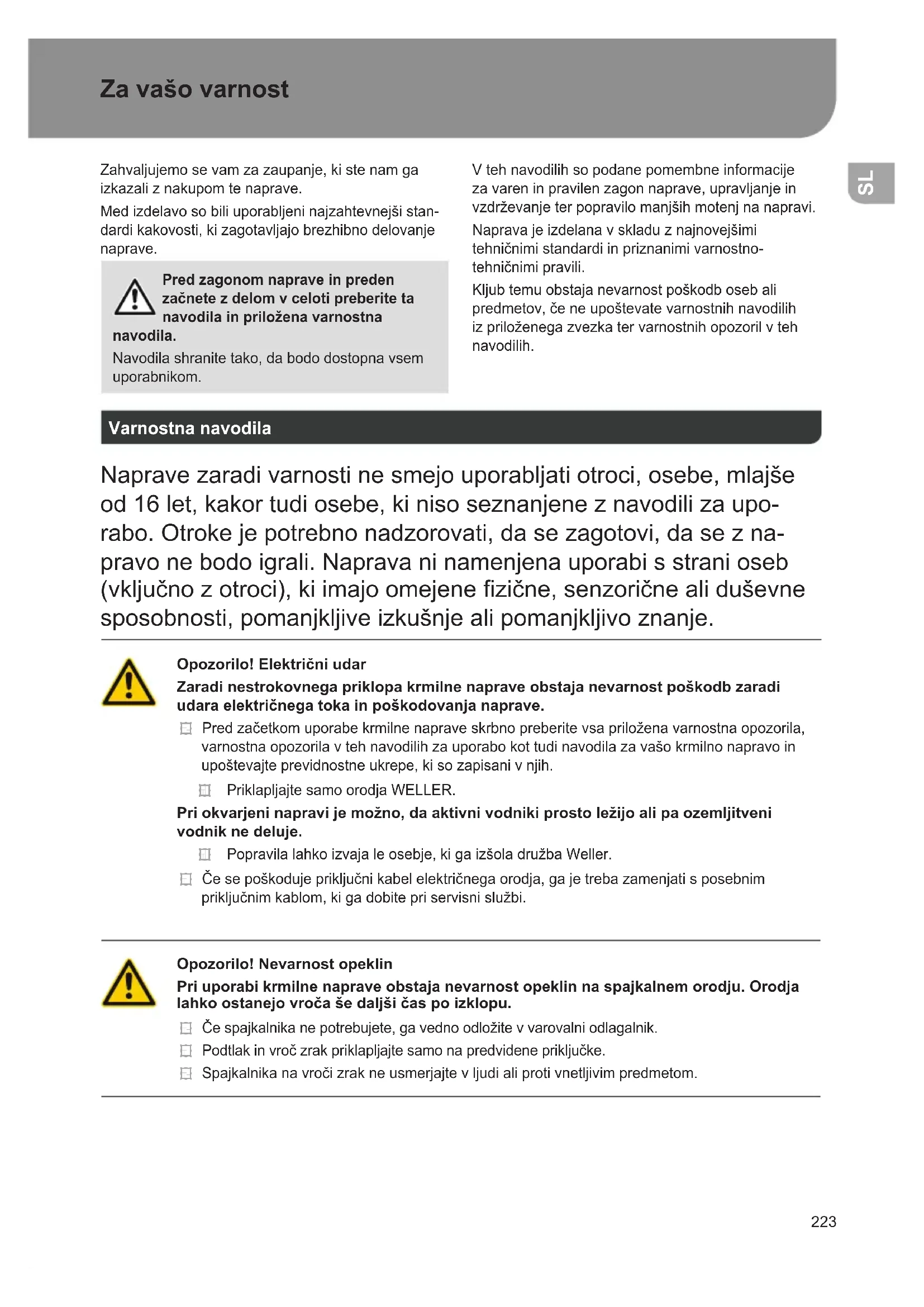 Za vašo varnost Zahvaljujemo se vam za zaupanje, ki ste nam ga izkazali z nakupom te naprave. Med izdelavo so bili uporabljeni najzahtevnejši stan- dardi kakovosti, ki zagotavljajo brezhibno delovanje naprave. Pred zagonom naprave in preden začnete z delom v celoti preberite ta navodila in priložena varnostna navodila. Navodila shranite tako, da bodo dostopna vsem uporabnikom. V teh navodilih so podane pomembne informacije za varen in pravilen zagon naprave, upravljanje in vzdrževanjeterpopravilomanjšihmotenjnanapravi. Naprava je izdelana v skladu z najnovejšimi tehničnimistandardiinpriznanimivarnostno- tehničnimipravili. Kljub temu obstaja nevarnost poškodb oseb ali predmetov,čeneupoštevatevarnostnihnavodilih izpriloženegazvezkatervarnostnihopozorilvteh navodilih. Varnostna navodila Naprave zaradi varnosti ne smejo uporabljati otroci, osebe, mlajše od 16 let, kakor tudi osebe, ki niso seznanjene z navodili za upo- rabo. Otroke je potrebno nadzorovati, da se zagotovi, da se z na- pravo ne bodo igrali. Naprava ni namenjena uporabi s strani oseb (vključnozotroci),kiimajoomejenezične,senzoričnealiduševne sposobnosti, pomanjkljive izkušnje ali pomanjkljivo znanje. Opozorilo! Električni udar Zaradi nestrokovnega priklopa krmilne naprave obstaja nevarnost poškodb zaradi udara električnega toka in poškodovanja naprave. Predzačetkomuporabekrmilnenapraveskrbnopreberitevsapriloženavarnostnaopozorila, varnostna opozorila v teh navodilih za uporabo kot tudi navodila za vašo krmilno napravo in upoštevajte previdnostne ukrepe, ki so zapisani v njih. Priklapljajte samo orodja WELLER. Pri okvarjeni napravi je možno, da aktivni vodniki prosto ležijo ali pa ozemljitveni vodnik ne deluje. Popravilalahkoizvajaleosebje,kigaizšoladružbaWeller. Česepoškodujepriključnikabelelektričnegaorodja,gajetrebazamenjatisposebnim priključnimkablom,kigadobitepriservisnislužbi. Opozorilo! Nevarnost opeklin Pri uporabi krmilne naprave obstaja nevarnost opeklin na spajkalnem orodju. Orodja lahko ostanejo vroča še daljši čas po izklopu. Čespajkalnikanepotrebujete,gavednoodložitevvarovalniodlagalnik. Podtlakinvročzrakpriklapljajtesamonapredvidenepriključke. Spajkalnikanavročizrakneusmerjajtevljudialiprotivnetljivimpredmetom. SL224