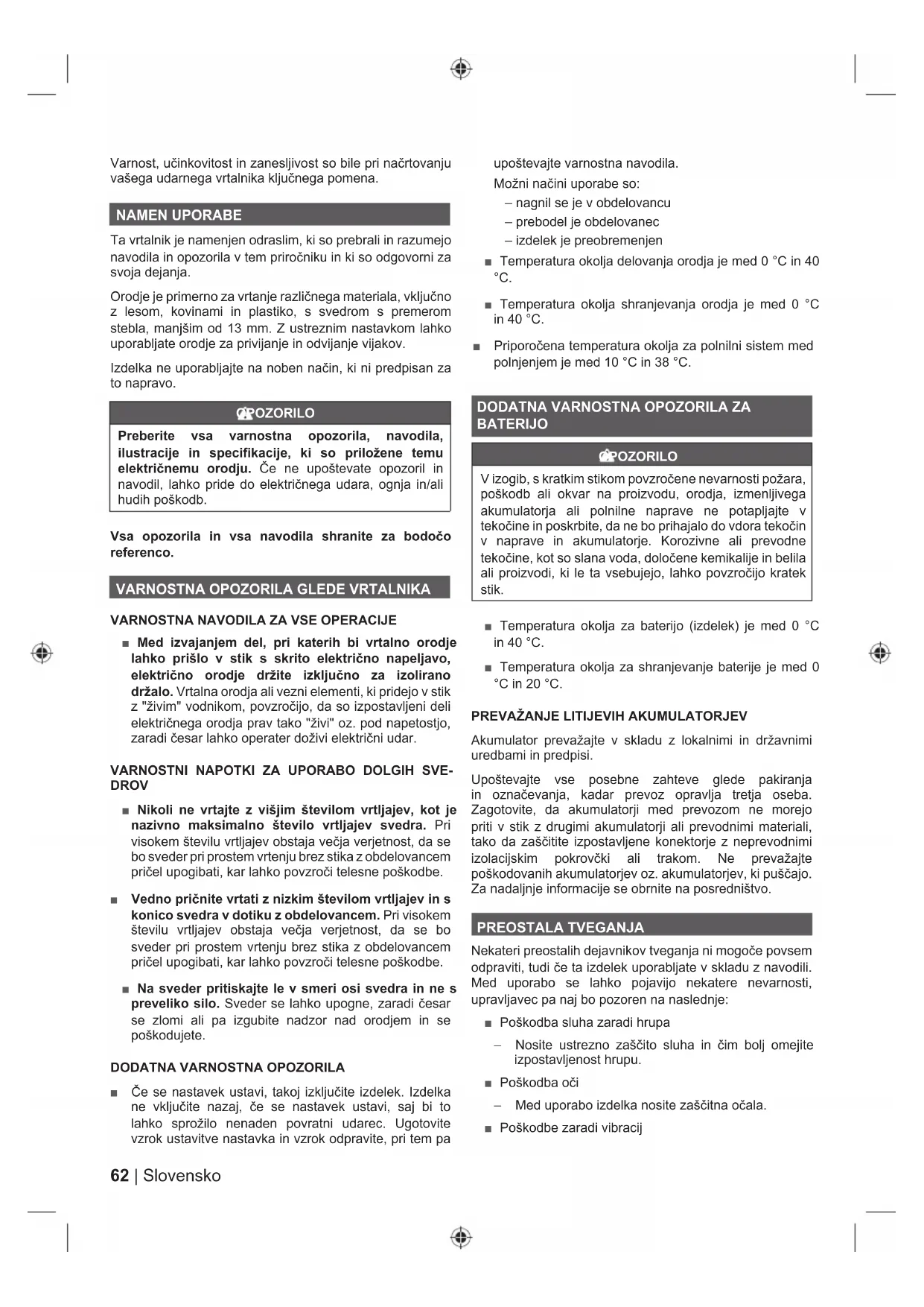 ■ Če se nastavek ustavi, takoj izključite izdelek. Izdelka ne vključite nazaj, če se nastavek ustavi, saj bi to lahko sprožilo nenaden povratni udarec. Ugotovite vzrok ustavitve nastavka in vzrok odpravite, pri tem pa upoštevajte varnostna navodila. Možni načini uporabe so: – nagnil se je v obdelovancu – prebodel je obdelovanec – izdelek je preobremenjen ■ Temperatura okolja delovanja orodja je med 0 °C in 40 °C. ■ Temperatura okolja shranjevanja orodja je med 0 °C in 40 °C. ■ Priporočena temperatura okolja za polnilni sistem med polnjenjem je med 10 °C in 38 °C.