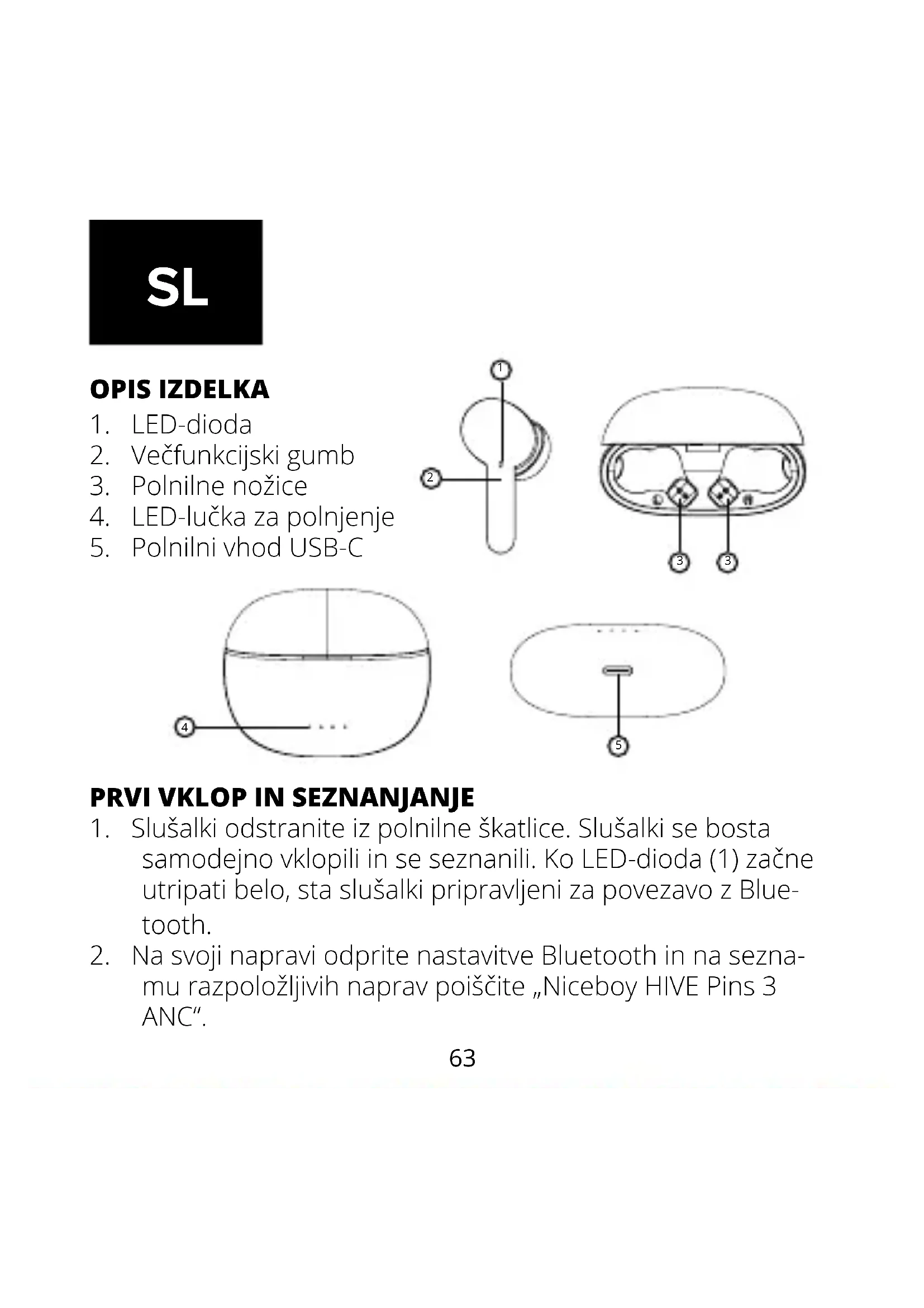 samodejno vklopili in seznanili med seboj. Postopek pona- stavitve je dokončan. SPECIFIKACIJE BT: 5.3 Frekvenčni pas: 2,4 GHz Moč radijske frekvence: ≤ 2,5mW Proli BT: HFP, A2DP, AVRCP68 Podprti kodeki: AAC, SBC Stopnja zaščite: IPX4 Doseg prenosa: 10m Zvočnik: 10mm Frekvenca: 20Hz–20kHz Občutljivost: 118±1,5dB Življenjska doba baterije (slušalki): do 10 ur Najdaljša življenjska doba baterije: do 40ur Zmogljivost baterije slušalk: 50mAh Zmogljivost baterije polnilne škatlice: 400mAh Glasovni pomočniki: Siri in Google Assistant Večtočkovno seznanjanje: DA VSEBINA EMBALAŽE: Slušalke Niceboy HIVE Pins 3 ANC Polnilna škatlica Nadomestni čepki za slušalke Kabel USB-C Priročnik VARNOSTNE INFORMACIJE Poslušanje zelo glasne glasbe lahko povzroči poškodbe sluha. Zaradi lastne varnosti ne uporabljajte funkcije ANC na nevarnih mestih (npr. v prometu). Naprave ne izpostavljajte tekočinam in69 vlagi. Naprave ne izpostavljajte ekstremnim temperaturam in je ne poskušajte razstaviti. Napravo zaščitite pred ostrimi predmeti in padci z višine. Baterije: nepravilno ravnanje (dolgotrajno polnjenje, kratek stik, poškodovanje z drugimi predmeti itd.) lahko povzroči požar, pregrevanje ali uhajanje baterije. Življenjska doba baterije ali akumulatorske baterije, ki je lahko priložena izdelku, je šest mesecev, saj gre za potrošni material. V primeru radijske opreme, ki namerno oddaja radijske valove, morajo navodila in varnostne informacije vključevati informacije o vseh frekvenčnih pasovih, v katerih radijska oprema deluje, in največji radiofrekvenčni moči, oddani v frekvenčnem pasu, v katerem deluje radijska oprema.