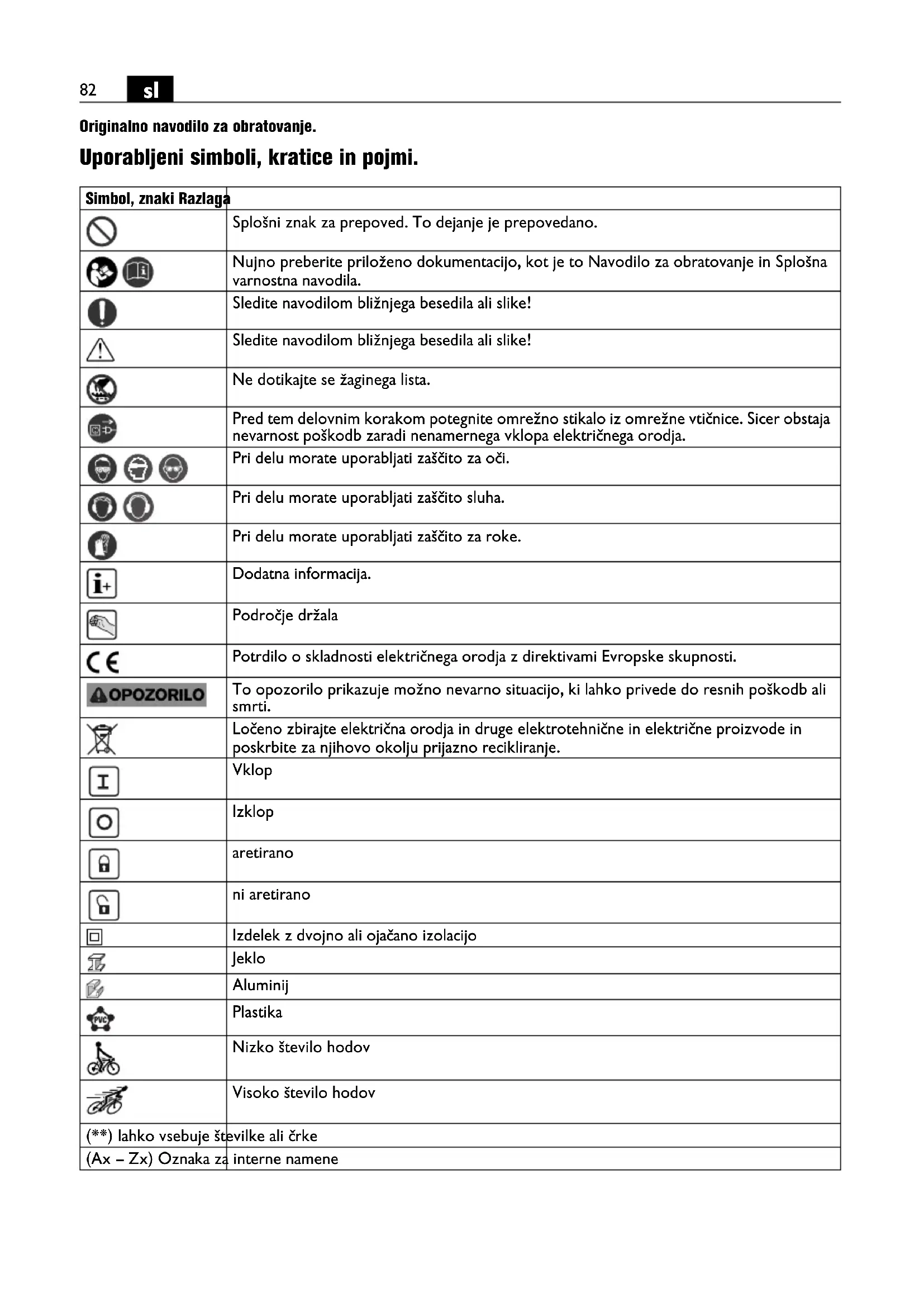 Originalno navodilo za obratovanje. Uporabljeni simboli, kratice in pojmi. Simbol, znaki Razlaga Splošni znak za prepoved. To dejanje je prepovedano. Nujno preberite priloženo dokumentacijo, kot je to Navodilo za obratovanje in Splošna varnostna navodila. Sledite navodilom bližnjega besedila ali slike! Sledite navodilom bližnjega besedila ali slike! Ne dotikajte se žaginega lista. Pred tem delovnim korakom potegnite omrežno stikalo iz omrežne vtičnice. Sicer obstaja nevarnost poškodb zaradi nenamernega vklopa električnega orodja. Pri delu morate uporabljati zaščito za oči. Pri delu morate uporabljati zaščito sluha. Pri delu morate uporabljati zaščito za roke. Dodatna informacija. Področje držala Potrdilo o skladnosti električnega orodja z direktivami Evropske skupnosti. To opozorilo prikazuje možno nevarno situacijo, ki lahko privede do resnih poškodb ali smrti. Ločeno zbirajte električna orodja in druge elektrotehnične in električne proizvode in poskrbite za njihovo okolju prijazno recikliranje. Vklop Izklop aretirano ni aretirano Izdelek z dvojno ali ojačano izolacijo Jeklo Aluminij Plastika Nizko število hodov Visoko število hodov (**) lahko vsebuje številke ali črke (Ax – Zx) Oznaka za interne namene OBJ_BUCH-0000000078-004.book Page 82 Wednesday, February 26, 2020 1:28 PM83