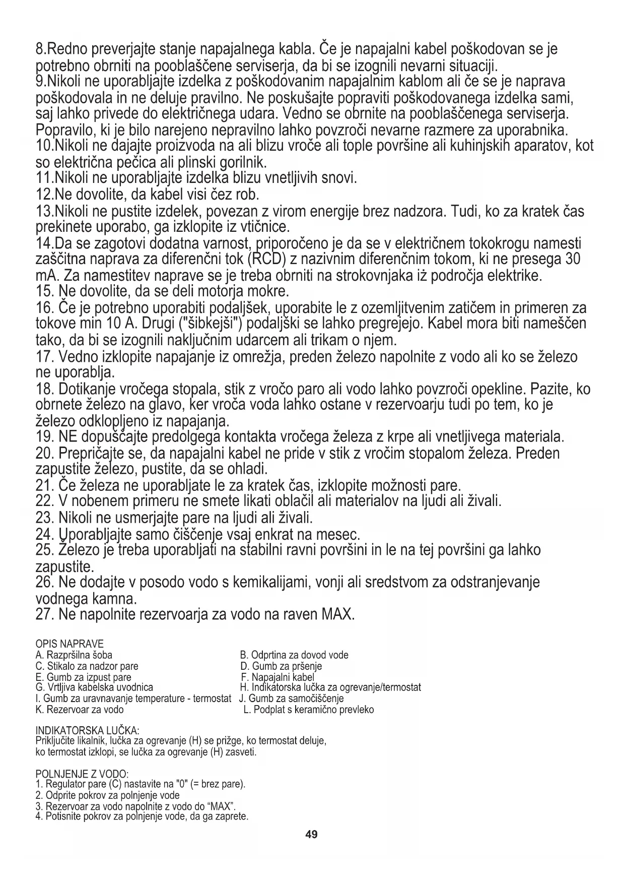 Irrota pistoke pistorasiasta. Tyhjennä silitysrauta avaamalla vesisäiliön kansi ja pitämällä sitä kärki alaspäin. Ravista sitä kevyesti pesualtaan yläpuolella ja sulje kansi. Kuivaa jäljellä oleva kosteus kääntämällä silitysrauta uudelleen päälle termostaatin säätönupin (I) ollessa MAX-asennossa ja höyryn ohjauskytkimen (C) ollessa MAX-asennossa, kunnes lämmityksen merkkivalo (H) sammuu. Irrota pistoke pistorasiasta ja anna jäähtyä. Puhdista pohja kuivalla liinalla, sillä siihen voi jäädä kosteusjäämät. Ennen puhdistamista irrota pistoke pistorasiasta ja anna silitysraudan jäähtyä riittävästi. Max teho: 3400W Suojellaksesi ympräristöäsi: hävitä pahvilaatikot ja muovipussit ja kierrätä ne niille tarkoitetuissa jäteastioissa. Käytetyt koneet tulee toimittaa niihin erioistuneisiin keräyspisteisiin ympäristölle vaarallisten aineiden takia. Älä hävitä laitteita sekajätteessä. SLOVENŠČINA 1.Pred uporabo izdelka preberite navodila za uporabo. Proizvajalec ni odgovoren za kakršnokoli škodo zaradi zlorabe izdelka. Zaradi pogojev v garanciji, če se naprava uporablja v komercialne namene. 4.Bodite previdni ko uporabljate izdelek v bližini otrok. Ne pustite, da se otroci igrajo z izdelkom. Ne pustite, da napravo uporabljajo otroci in ljudje, ki niso seznanjeni z navodili za uporabo izdelka. 6.Ko boste končali z uporabo izdelka, nežno odstranite vtič iz električne vtičnice. Nikoli ne potegnite za napajalni kabel! 2.Izdelek se uporablja samo v zaprtih prostorih. Ne uporabljajte izdelka za kakršenkoli namen, ki ni v skladu z njegovo uporabo. 7.Nikoli ne dajajte napajalnega kabla, vtikača ali celotne naprave v vodo. Nikoli ne izpostavljajte izdelka atmosferskim pogojem, kot je neposredna sončna svetloba ali dež, itd... Nikoli ne uporabljajte izdelka v vlažnih pogojih. 5.OPOZORILO: To napravo lahko uporabljajo samo otroci, stari nad 8 let, osebe z zmanjšanimi fizičnimi, čutnimi ali duševnimi sposobnostmi ali oseb brez izkušenj ali znanja naprave, lahko napravo uporabljajo samo pod nadzorom osebe, ki je odgovorna za njihovo varnost, ali če so jim podali navodila na varno uporabo naprave in se zavedajo nevarnosti, povezane z njenim delovanjem. Otroci se naj ne igrajo z napravo. Čiščenje in vzdrževanje naprave naj ne izvajajo otroci, razen če so starejši od 8 let in te dejavnosti izvajajo pod nadzorom osebe, ki je odgovorna za njihovo varnost. 3.Napetost naprave je 220-240V ~50/60Hz. Ne povezujte več naprav z eno vtičnico, zaradi varnostnih razlogov. VARNOSTNE RAZMERE. PREBERITE NAVODILA ZA UPORABO IN JIH SKRBNO SHRANITE ZA PRIHODNJO UPORABO. 4819. NE dopuščajte predolgega kontakta vročega železa z krpe ali vnetljivega materiala.