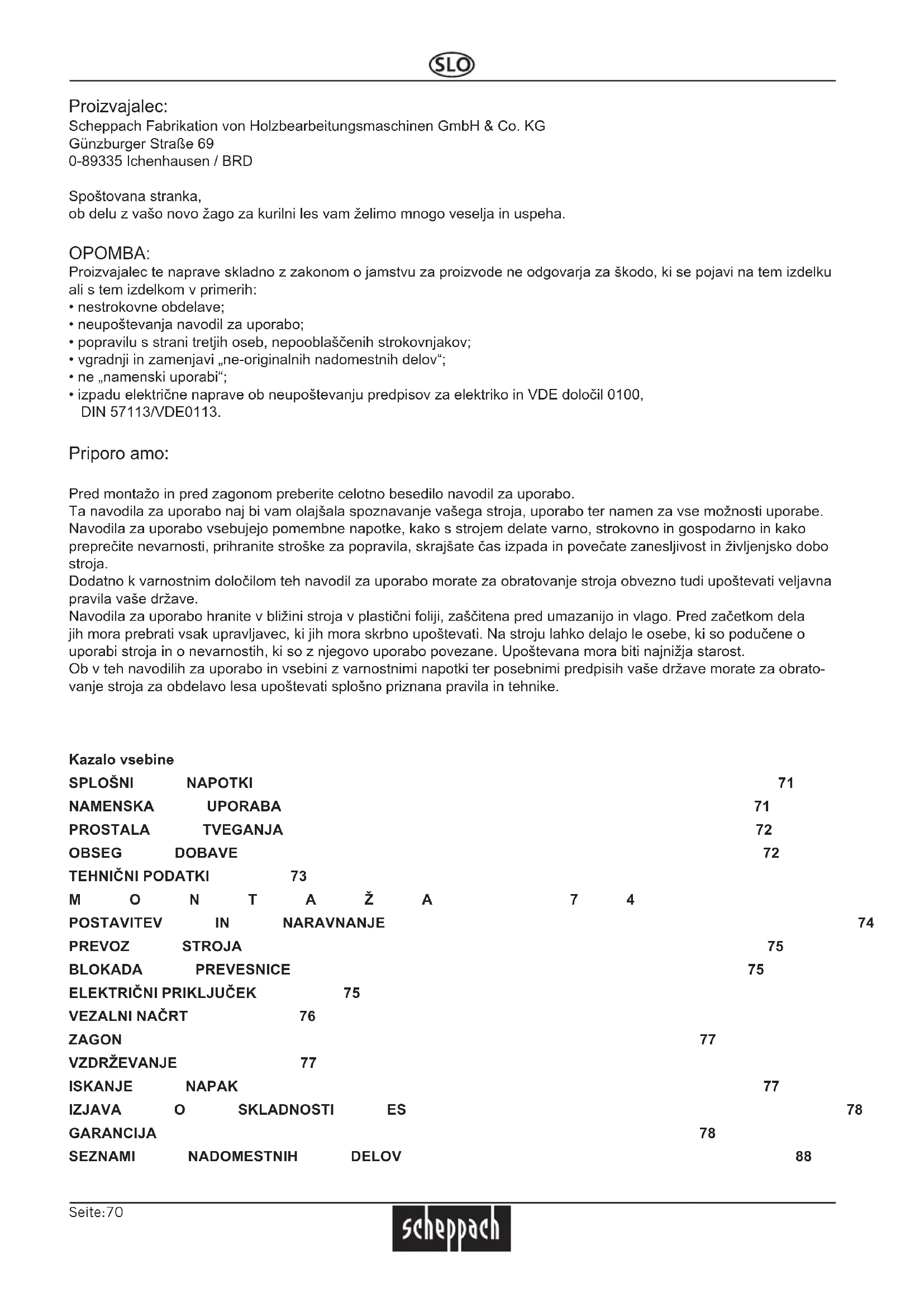 - izpadu električne naprave ob neupoštevanju predpisov za elektriko in VDE določil 0100, DIN 57113/VDE0113. Priporo amo: Pred montažo in pred zagonom preberite celotno besedilo navodil za uporabo. Ta navodila za uporabo naj bi vam olajšala spoznavanje vašega stroja, uporabo ter namen za vse možnosti uporabe. Navodila za uporabo vsebujejo pomembne napotke, kako s strojem delate varno, strokovno in gospodarno in kako preprečite nevarnosti, prihranite stroške za popravila, skrajšate čas izpada in povečate zanesljivost in življenjsko dobo stroja. Dodatno k varnostnim določilom teh navodil za uporabo morate za obratovanje stroja obvezno tudi upoštevati veljavna pravila vaše države. Navodila za uporabo hranite v bližini stroja v plastični foliji, zaščitena pred umazanijo in vlago. Pred začetkom dela jih mora prebrati vsak upravljavec, ki jih mora skrbno upoštevati. Na stroju lahko delajo le osebe, ki so podučene o uporabi stroja in o nevarnostih, ki so z njegovo uporabo povezane. Upoštevana mora biti najnižja starost. Ob v teh navodilih za uporabo in vsebini z varnostnimi napotki ter posebnimi predpisih vaše države morate za obrato- vanje stroja za obdelavo lesa upoštevati splošno priznana pravila in tehnike. Kazalo vsebine