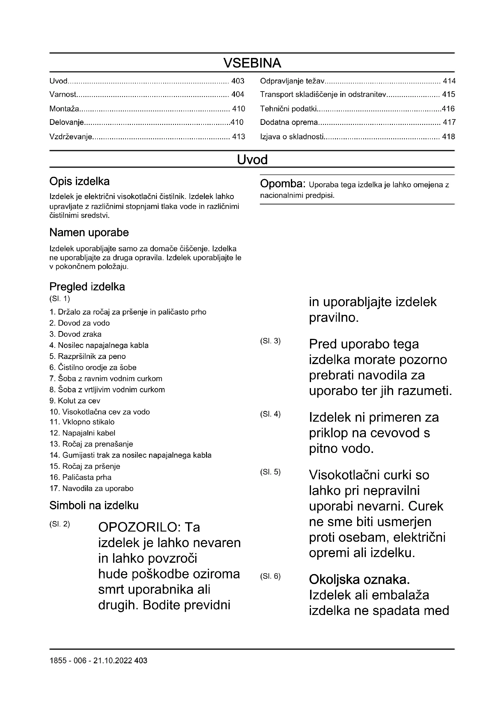 Simboli na izdelku (Sl. 2) OPOZORILO: Ta izdelek je lahko nevaren in lahko povzroči hude poškodbe oziroma smrt uporabnika ali drugih. Bodite previdni in uporabljajte izdelek pravilno. (Sl. 3) Pred uporabo tega izdelka morate pozorno prebrati navodila za uporabo ter jih razumeti. (Sl. 4) Izdelek ni primeren za priklop na cevovod s pitno vodo. (Sl. 5) Visokotlačni curki so lahko pri nepravilni uporabi nevarni. Curek ne sme biti usmerjen proti osebam, električni opremi ali izdelku. (Sl. 6) Okoljska oznaka. Izdelek ali embalaža izdelka ne spadata med 1855 - 006 - 21.10.2022 403gospodinjske odpadke. Treba ga je reciklirati v odobrenem zbirnem centru za električno in elektronsko opremo. (Sl. 7) Orodje Razreda II. (Sl. 8) Izdelek je skladen z veljavnimi direktivami ES. (Sl. 9) Izdelek je skladen z veljavnimi direktivami Evrazijske carinske unije. (Sl. 10) Izdelek je skladen z veljavnimi direktivami UkrSEPRO. (Sl. 11) Izdelek je skladen z veljavnimi direktivami RCM. Velja samo za AU/NZ. (Sl. 12) Emisija hrupa v okolje je skladna z direktivami in uredbami EU, ZK ter zakonodajo Novega južnega Walesa, in sicer z direktivo "Zaščita okolja pri delu (nadzor hrupa) iz 2017". Zajamčena raven zvočne moči izdelka je navedena na in