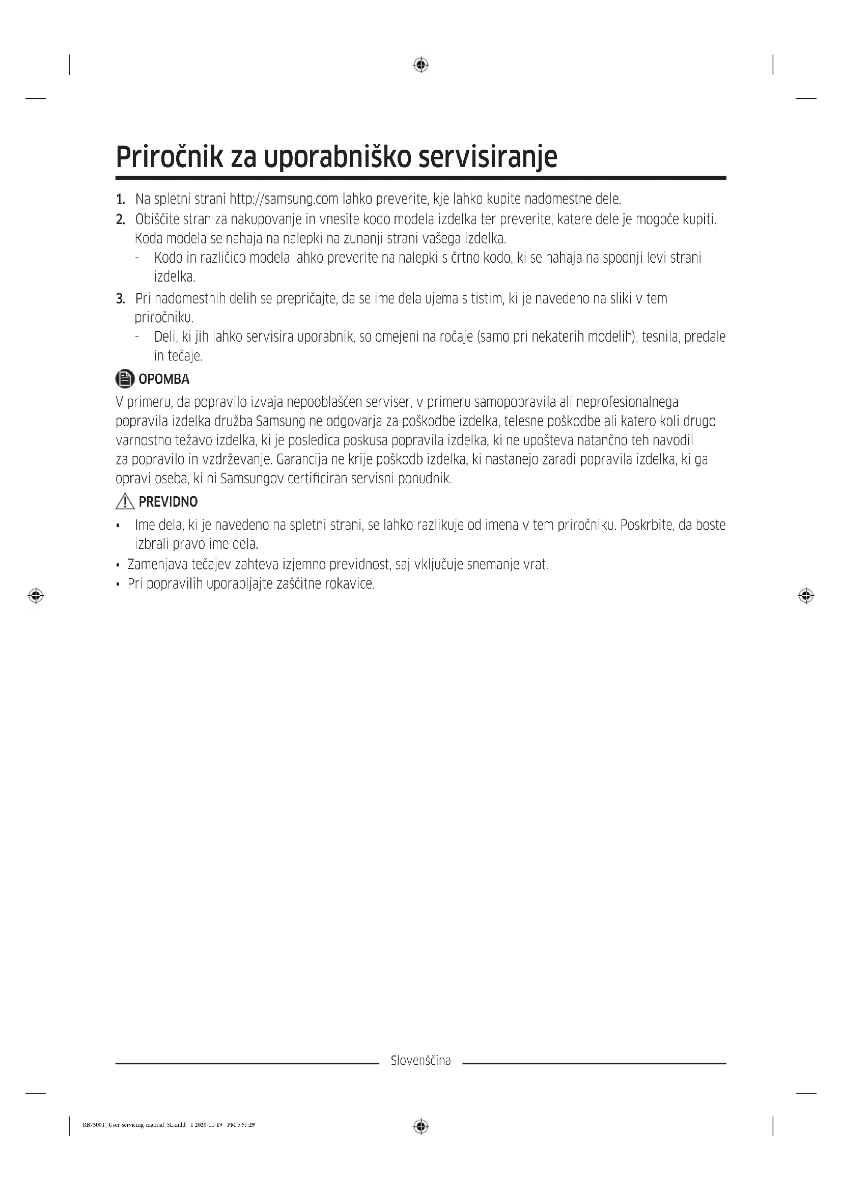 priročniku. - Deli, ki jih lahko servisira uporabnik, so omejeni na ročaje (samo pri nekaterih modelih), tesnila, predale in tečaje. OPOMBA V primeru, da popravilo izvaja nepooblaščen serviser, v primeru samopopravila ali neprofesionalnega popravila izdelka družba Samsung ne odgovarja za poškodbe izdelka, telesne poškodbe ali katero koli drugo varnostno težavo izdelka, ki je posledica poskusa popravila izdelka, ki ne upošteva natančno teh navodil za popravilo in vzdrževanje. Garancija ne krije poškodb izdelka, ki nastanejo zaradi popravila izdelka, ki ga opravi oseba, ki ni Samsungov certiciran servisni ponudnik. PREVIDNO