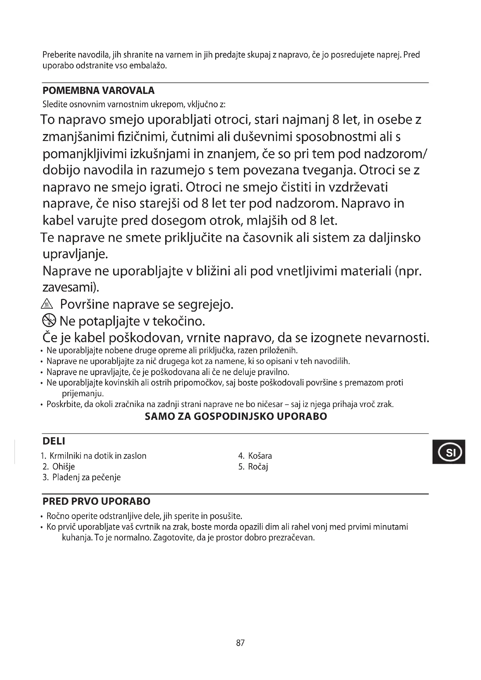 prilega znotraj ohišja vašega cvrtnika na zrak. Vaš cvrtnik na zrak ne bo deloval, če košara ni pravilno vstavljena.