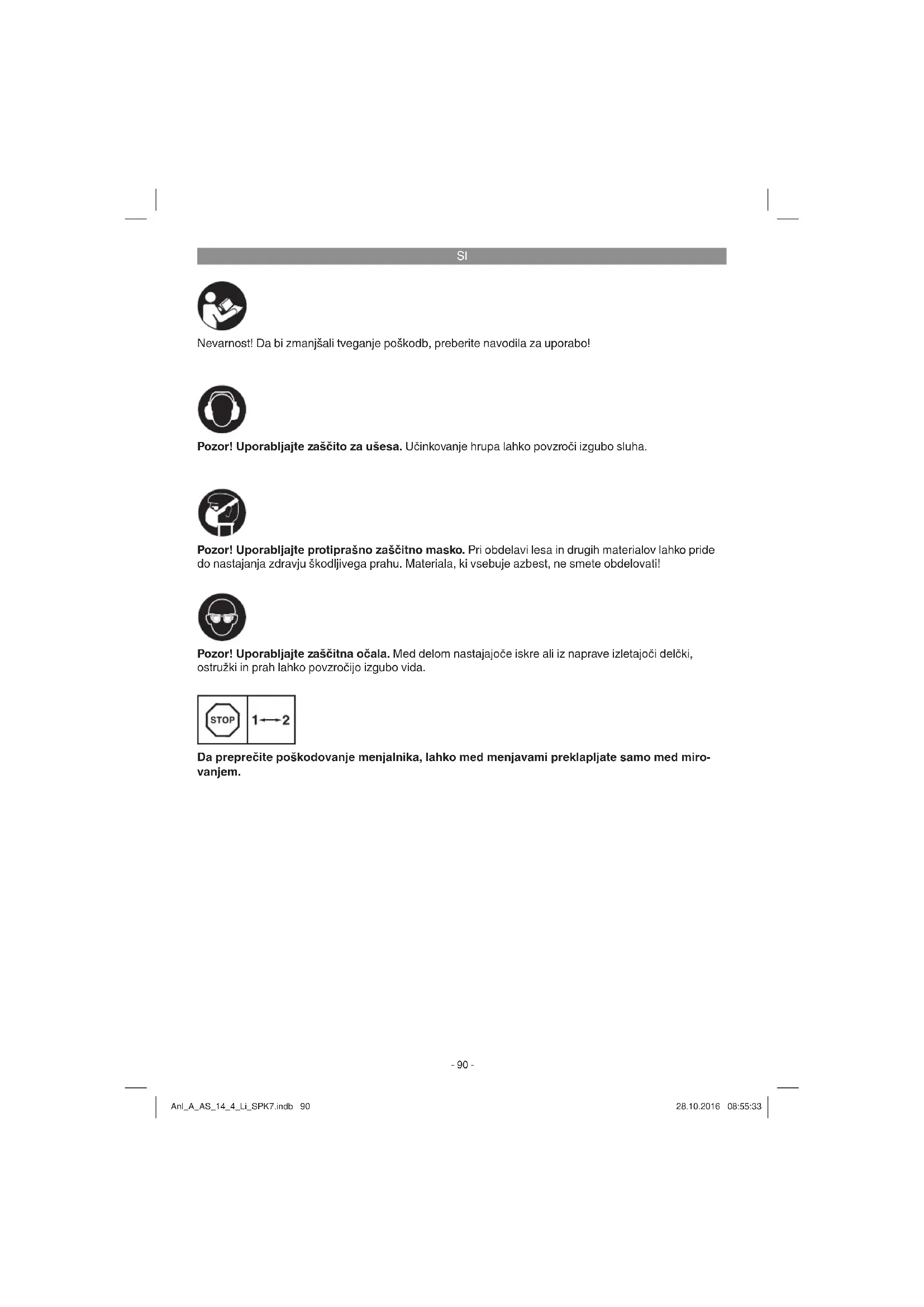 Nevarnost! Da bi zmanjšali tveganje poškodb, preberite navodila za uporabo! Pozor! Uporabljajte zaščito za ušesa. Učinkovanje hrupa lahko povzroči izgubo sluha. Pozor! Uporabljajte zaščitna očala. Med delom nastajajoče iskre ali iz naprave izletajoči delčki, ostružki in prah lahko povzročijo izgubo vida. Pozor! Uporabljajte protiprašno zaščitno masko. Pri obdelavi lesa in drugih materialov lahko pride do nastajanja zdravju škodljivega prahu. Materiala, ki vsebuje azbest, ne smete obdelovati! Da preprečite poškodovanje menjalnika, lahko med menjavami preklapljate samo med miro- vanjem. Anl_A_AS_14_4_Li_SPK7.indb 90Anl_A_AS_14_4_Li_SPK7.indb 90 28.10.2016 08:55:3328.10.2016 08:55:33SI