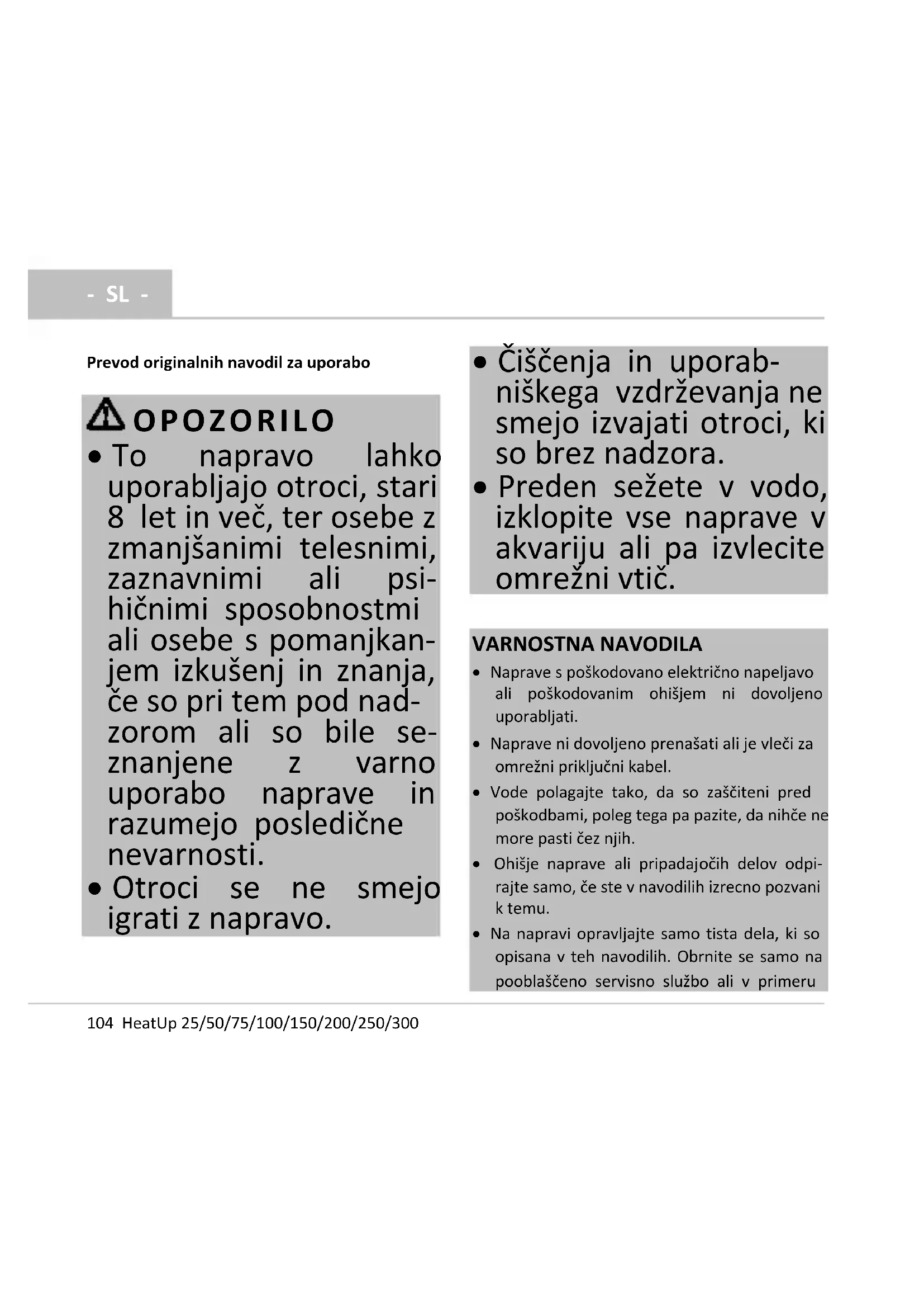 - Pri neupoštevanju lahko pride do lahkih ali majhnih telesnih poškodb. NAPOTEK Informacije, ki poskrbijo za boljše razumevanje. Dodatni napotki A Sklic na eno sliko, npr. sliko A. OPIS IZDELKA Pravilna uporaba HeatUp 25/50/75/100/150/200/250/300, v na- daljevanju imenovan »naprava«, je dovoljeno uporabljati samo, kot sledi: