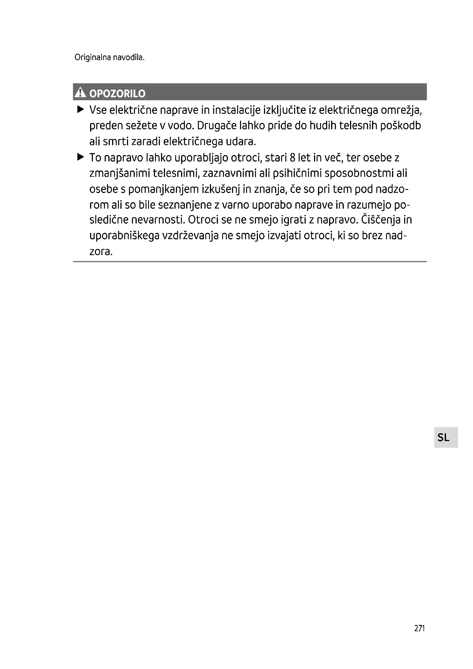 OPOZORI LO OPOZORILO Vse električne naprave in instalacije izključite iz električnega omrežja, preden sežete v vodo. Drugače lahko pride do hudih telesnih poškodb ali smrti zaradi električnega udara. To napravo lahko uporabljajo otroci, stari 8 let in več, ter osebe z zmanjšanimi telesnimi, zaznavnimi ali psihičnimi sposobnostmi ali osebe s pomanjkanjem izkušenj in znanja, če so pri tem pod nadzo- rom ali so bile seznanjene z varno uporabo naprave in razumejo po- sledične nevarnosti. Otroci se ne smejo igrati z napravo. Čiščenja in uporabniškega vzdrževanja ne smejo izvajati otroci, ki so brez nad- zora.272 Varnostna navodila Električna priključitev