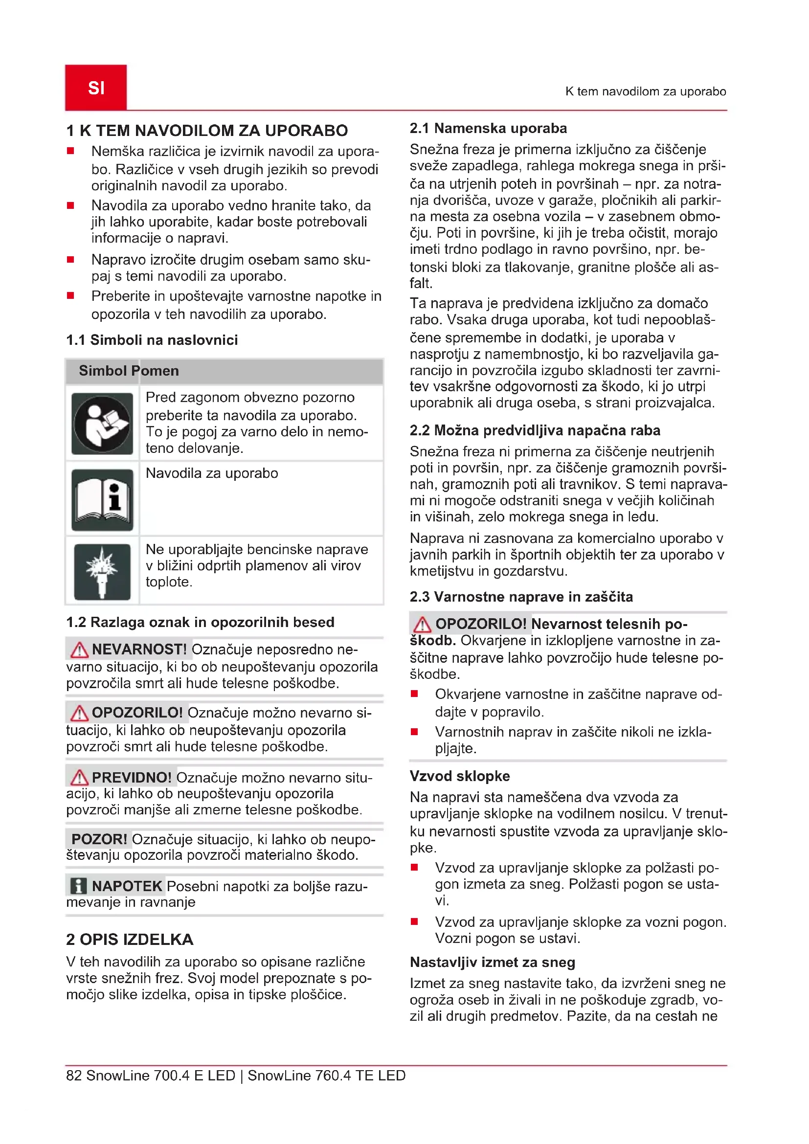"Packed Snow" (gost sneg) 16 Plošča Št. Sestavni del 17 Čistilno orodje (pritrjeno na plošči) 18 Izmetno kolesce 19 Transportni polž 20 Čistilna plošča 21 Po višini nastavljiva drsna tirnica 22 Vtič vžigalne svečke 3 VARNOSTNI NAPOTKI NEVARNOST! Smrtna nevarnost in ne- varnost hudih telesnih poškodb! Nepoznava- nje varnostnih napotkov in navodil za upravljanje lahko povzroči zelo hude telesne poškodbe in po- sledično smrt.