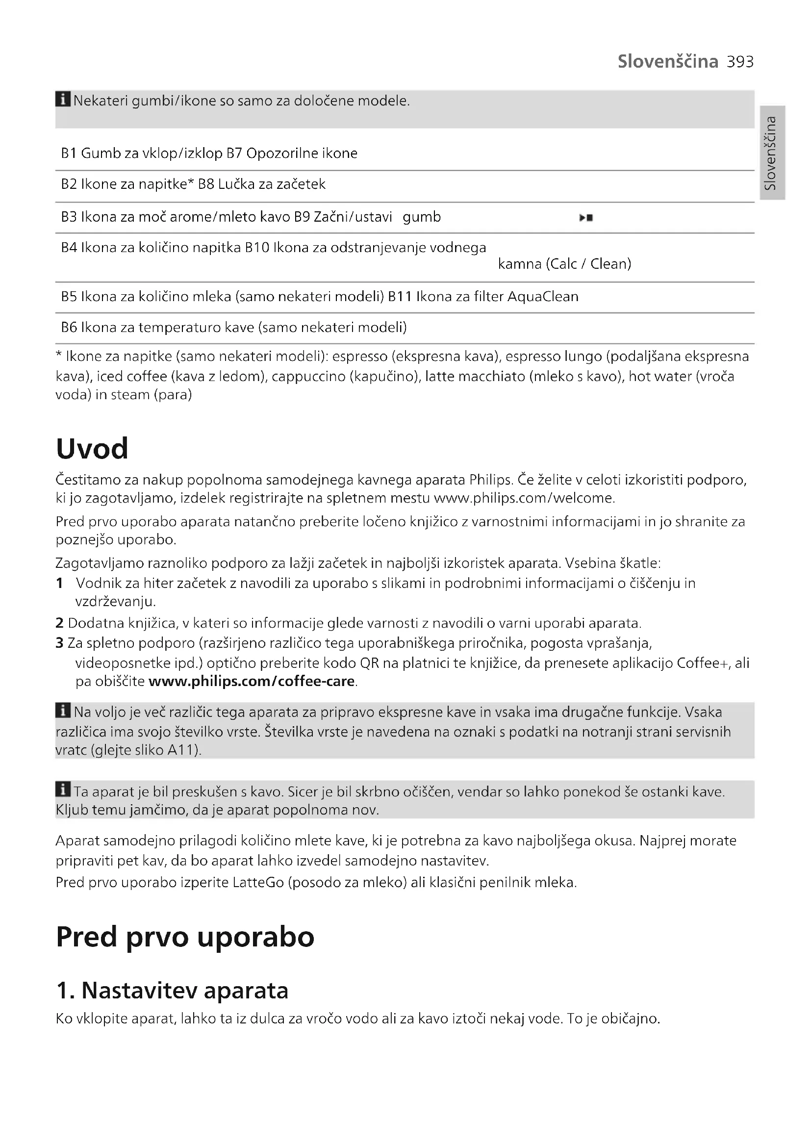 - Ikone za napitke (samo nekateri modeli): espresso (ekspresna kava), espresso lungo (podaljšana ekspresna kava), iced coffee (kava z ledom), cappuccino (kapučino), latte macchiato (mleko s kavo), hot water (vroča voda) in steam (para) Uvod Čestitamo za nakup popolnoma samodejnega kavnega aparata Philips. Če želite v celoti izkoristiti podporo, ki jo zagotavljamo, izdelek registrirajte na spletnem mestu www.philips.com/welcome. Pred prvo uporabo aparata natančno preberite ločeno knjižico z varnostnimi informacijami in jo shranite za poznejšo uporabo. Zagotavljamo raznoliko podporo za lažji začetek in najboljši izkoristek aparata. Vsebina škatle: 1 Vodnik za hiter začetek z navodili za uporabo s slikami in podrobnimi informacijami o čiščenju in vzdrževanju. 2 Dodatna knjižica, v kateri so informacije glede varnosti z navodili o varni uporabi aparata. 3 Za spletno podporo (razširjeno različico tega uporabniškega priročnika, pogosta vprašanja, videoposnetke ipd.) optično preberite kodo QR na platnici te knjižice, da prenesete aplikacijo Coffee+, ali pa obiščite www.philips.com/coffee-care. Na voljo je več različic tega aparata za pripravo ekspresne kave in vsaka ima drugačne funkcije. Vsaka različica ima svojo številko vrste. Številka vrste je navedena na oznaki s podatki na notranji strani servisnih vratc (glejte sliko A11). Ta aparat je bil preskušen s kavo. Sicer je bil skrbno očiščen, vendar so lahko ponekod še ostanki kave. Kljub temu jamčimo, da je aparat popolnoma nov. Aparat samodejno prilagodi količino mlete kave, ki je potrebna za kavo najboljšega okusa. Najprej morate pripraviti pet kav, da bo aparat lahko izvedel samodejno nastavitev. Pred prvo uporabo izperite LatteGo (posodo za mleko) ali klasični penilnik mleka. Pred prvo uporabo