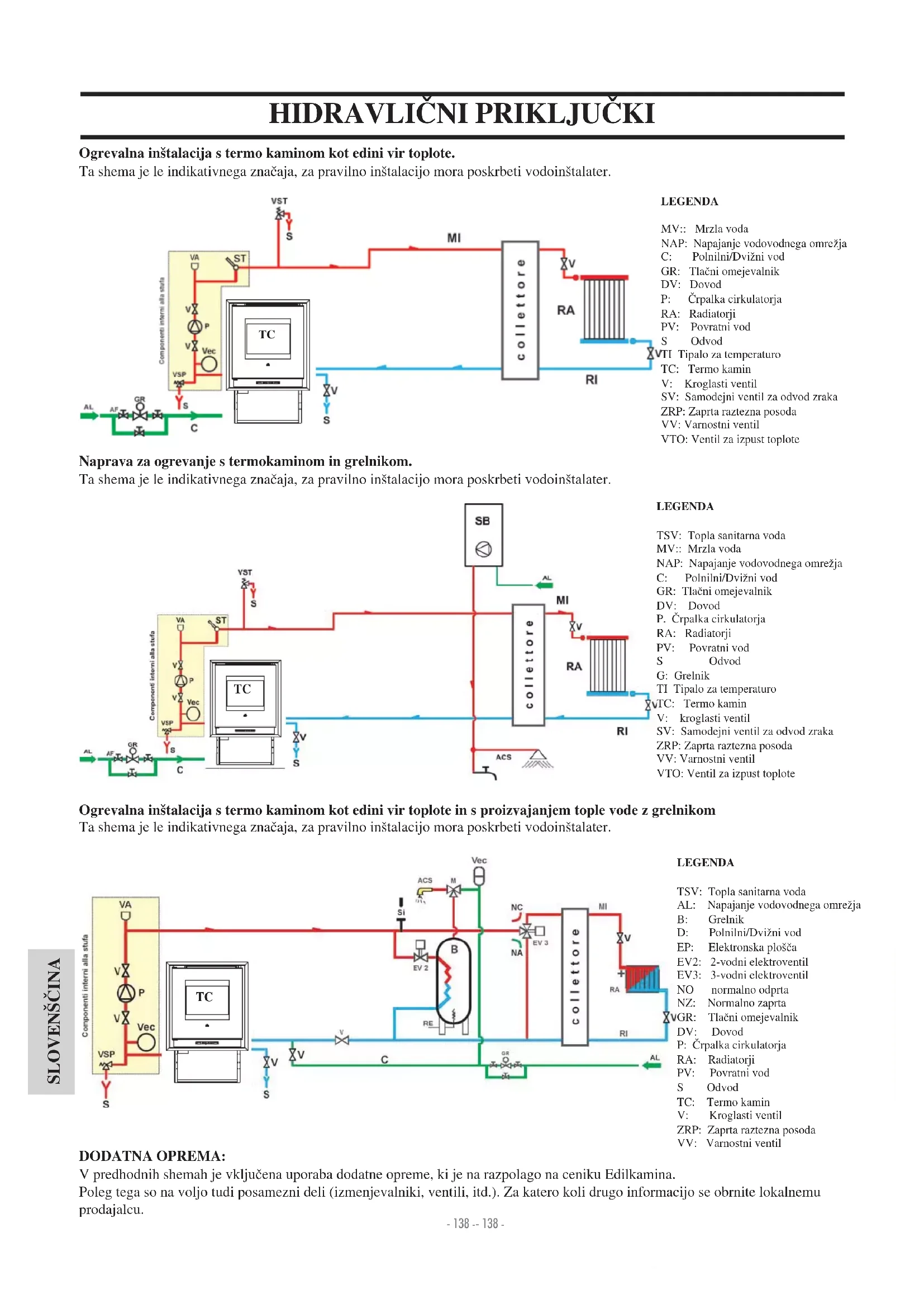 Ogrevalna inštalacija s termo kaminom kot edini vir toplote. Ta shema je le indikativnega znaÊaja, za pravilno inštalacijo mora poskrbeti vodoinštalater. Naprava za ogrevanje s termokaminom in grelnikom. Ta shema je le indikativnega znaÊaja, za pravilno inštalacijo mora poskrbeti vodoinštalater. LEGENDAMV:: Mrzla vodaNAP: Napajanje vodovodnega omrežjaC: Polnilni/Dvižni vodGR: TlaÊni omejevalnikDV: Dovod P: Érpalka cirkulatorja RA: RadiatorjiPV: Povratni vodS OdvodTI Tipalo za temperaturoTC: Termo kaminV: Kroglasti ventilSV: Samodejni ventil za odvod zrakaZRP: Zaprta raztezna posodaVV: Varnostni ventilVTO: Ventil za izpust toploteLEGENDATSV: Topla sanitarna vodaMV:: Mrzla vodaNAP: Napajanje vodovodnega omrežjaC: Polnilni/Dvižni vodGR: TlaÊni omejevalnikDV: Dovod P. Érpalka cirkulatorja RA: RadiatorjiPV: Povratni vodS OdvodG: GrelnikTI Tipalo za temperaturoTC: Termo kaminV: kroglasti ventilSV: Samodejni ventil za odvod zrakaZRP: Zaprta raztezna posodaVV: Varnostni ventilVTO: Ventil za izpust toplote