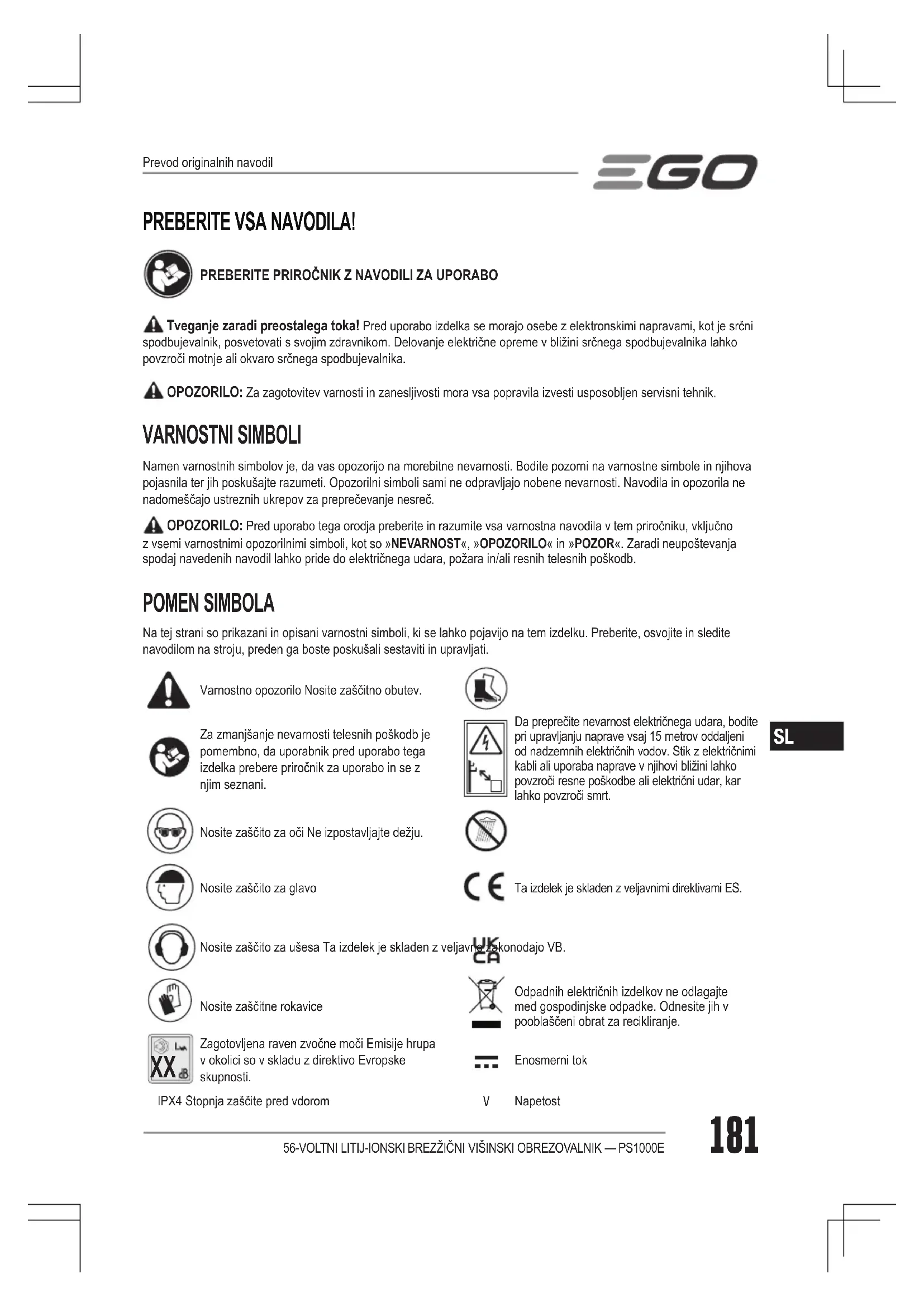 Za popolne pogoje garancijske politike družbe EGO obiščite spletno mesto egopowerplus.com.BELAIDĖ AUKŠTAPJOVĖ SU 56 VOLTŲ LIČIO JONŲ BATERIJA — PS1000E 191