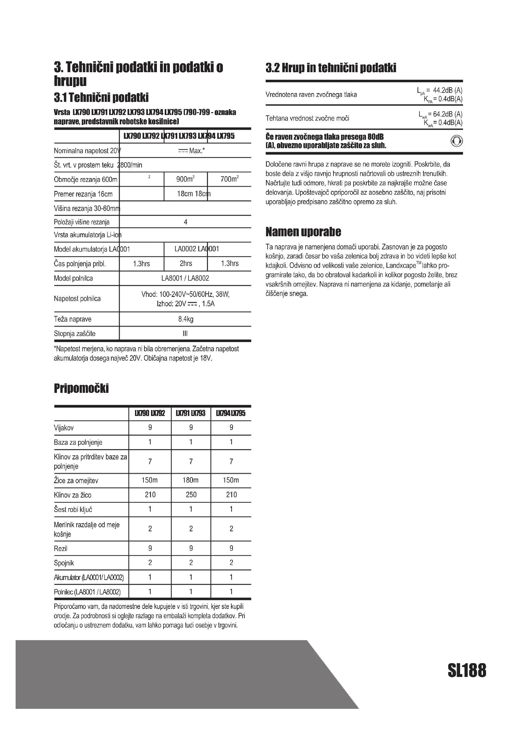 OPOZORILO – robotska kosilnica je ob napačni uporabi lahko nevarna. Preden uporabite robotsko kosilnico, si pazljivo preberite navodila za uporabo. OPOZORILO - Med obratovanjem naprave bodite od nje vedno oddaljeni. OPOZORILO – Pred dviganjem ali delom na napravi vedno aktivirajte enoto za blokado delovanja. OPOZORILO –Nikoli ne sedajte na robotsko kosilnico. Prepovedano sežiganje Ne izpostavljajte dežju ali vodi. Akumulatorjev ne zavrzite skupaj z ostalimi odpadki, temveč jih dostavite na mesto za ločeno zbiranje odpadkov. Naprave nikoli ne perite z visokotlačnim čistilnikom. Naprava razreda III Odpadnih električnih naprav ne smete zavreči skupaj z ostalimi gospodinjskimi odpadki. Dostavite jih na mesto za ločeno zbiranje odpadkov. Glede podrobnosti, se posvetujte z lokalno službo za ravnanje z odpadki.SL 187