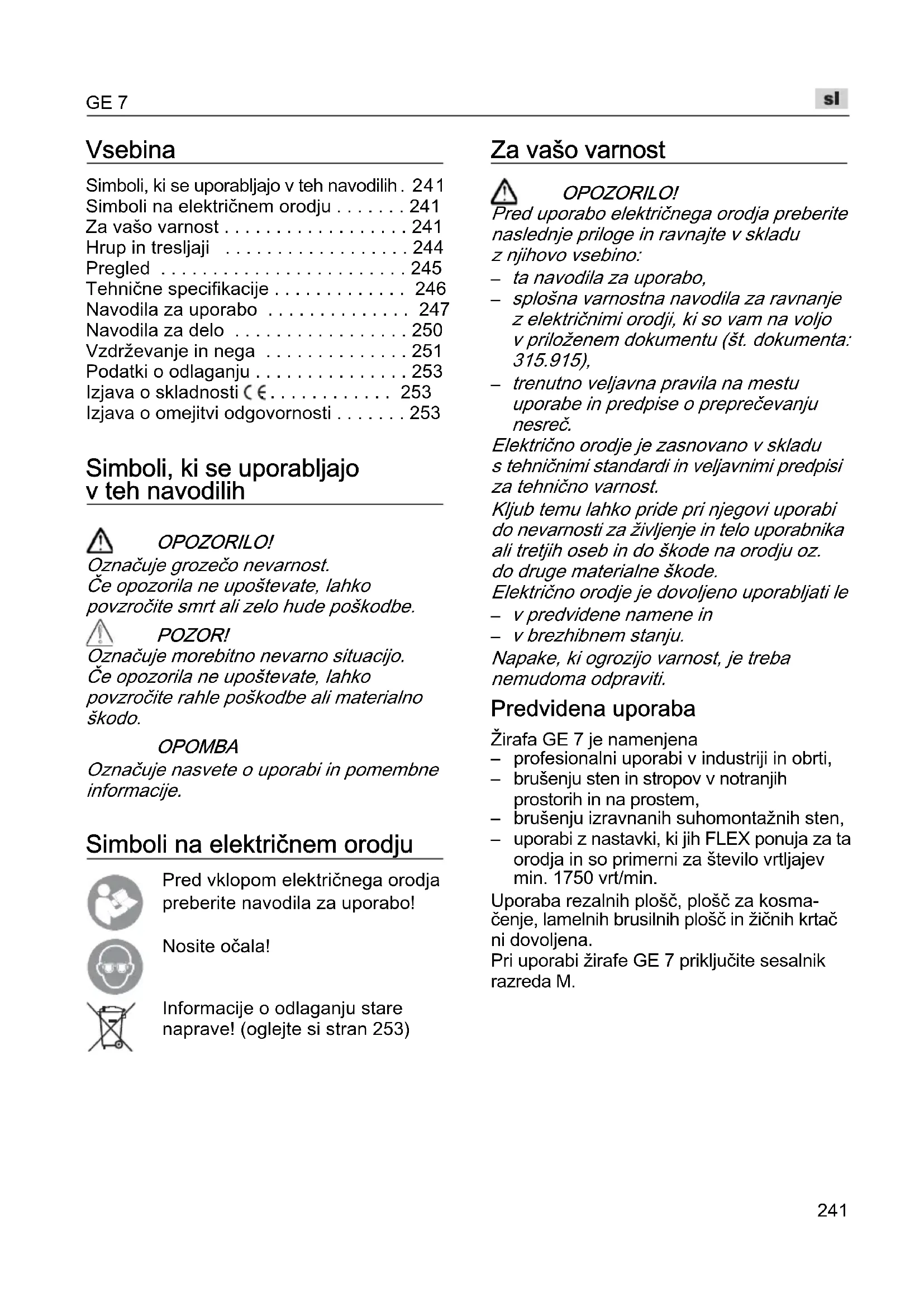 - Izjava o omejitvi odgovornosti Simboli, ki se uporabljajo v teh navodilih OPOZORILO! Označuje grozečo nevarnost. Če opozorila ne upoštevate, lahko povzročite smrt ali zelo hude poškodbe. POZOR! Označuje morebitno nevarno situacijo. Če opozorila ne upoštevate, lahko povzročite rahle poškodbe ali materialno škodo. OPOMBA Označuje nasvete o uporabi in pomembne informacije. Simboli na električnem orodju Pred vklopom električnega orodja preberite navodila za uporabo! Nosite očala! Informacije o odlaganju stare naprave! (oglejte si stran 253) Za vašo varnost OPOZORILO! Pred uporabo električnega orodja preberite naslednje priloge in ravnajte v skladu z njihovo vsebino: p. 253