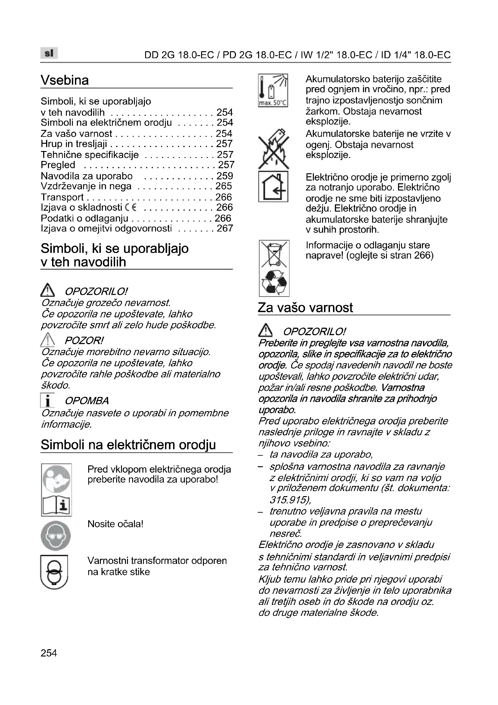 - Izjava o omejitvi odgovornosti Simboli, ki se uporabljajo v teh navodilih OPOZORILO! Označuje grozečo nevarnost. Če opozorila ne upoštevate, lahko povzročite smrt ali zelo hude poškodbe. POZOR! Označuje morebitno nevarno situacijo. Če opozorila ne upoštevate, lahko povzročite rahle poškodbe ali materialno škodo. OPOMBA Označuje nasvete o uporabi in pomembne informacije. Simboli na električnem orodju Pred vklopom električnega orodja preberite navodila za uporabo! Nosite očala! Varnostni transformator odporen na kratke stike Akumulatorsko baterijo zaščitite pred ognjem in vročino, npr.: pred trajno izpostavljenostjo sončnim žarkom. Obstaja nevarnost eksplozije. Akumulatorske baterije ne vrzite v ogenj. Obstaja nevarnost eksplozije. Električno orodje je primerno zgolj za notranjo uporabo. Električno orodje ne sme biti izpostavljeno dežju. Električno orodje in akumulatorske baterije shranjujte v suhih prostorih. Informacije o odlaganju stare naprave! (oglejte si stran 266) Za vašo varnost OPOZORILO! Preberite in preglejte vsa varnostna navodila, opozorila, slike in specifikacije za to električno orodje. Če spodaj navedenih navodil ne boste upoštevali, lahko povzročite električni udar, požar in/ali resne poškodbe. Varnostna opozorila in navodila shranite za prihodnjo uporabo. Pred uporabo električnega orodja preberite naslednje priloge in ravnajte v skladu z njihovo vsebino: p. 267