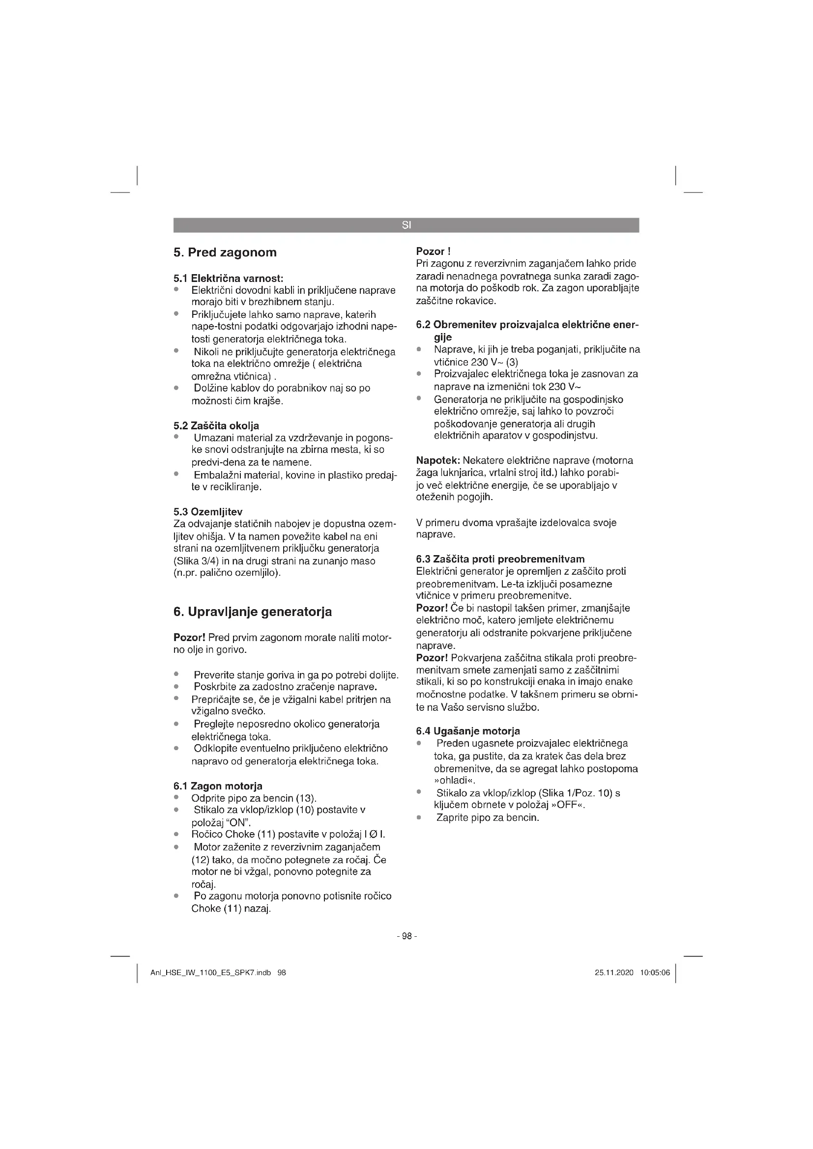 Odgovarjajoče varnostne napotke lahko prebere- te v priloženi knjižici! Nevarnost! Preberite varnostne napotke in navodila. Neupoštevanje varnostnih napotkov in navodil ima lahko za posledico električni udar, požar in/ali hude poškodbe. Shranite vse varnostne napot- ke in navodila za kasnejšo uporabo. Na generatorju električnega toka ne smete izvaja- ti nikakršnih sprememb.