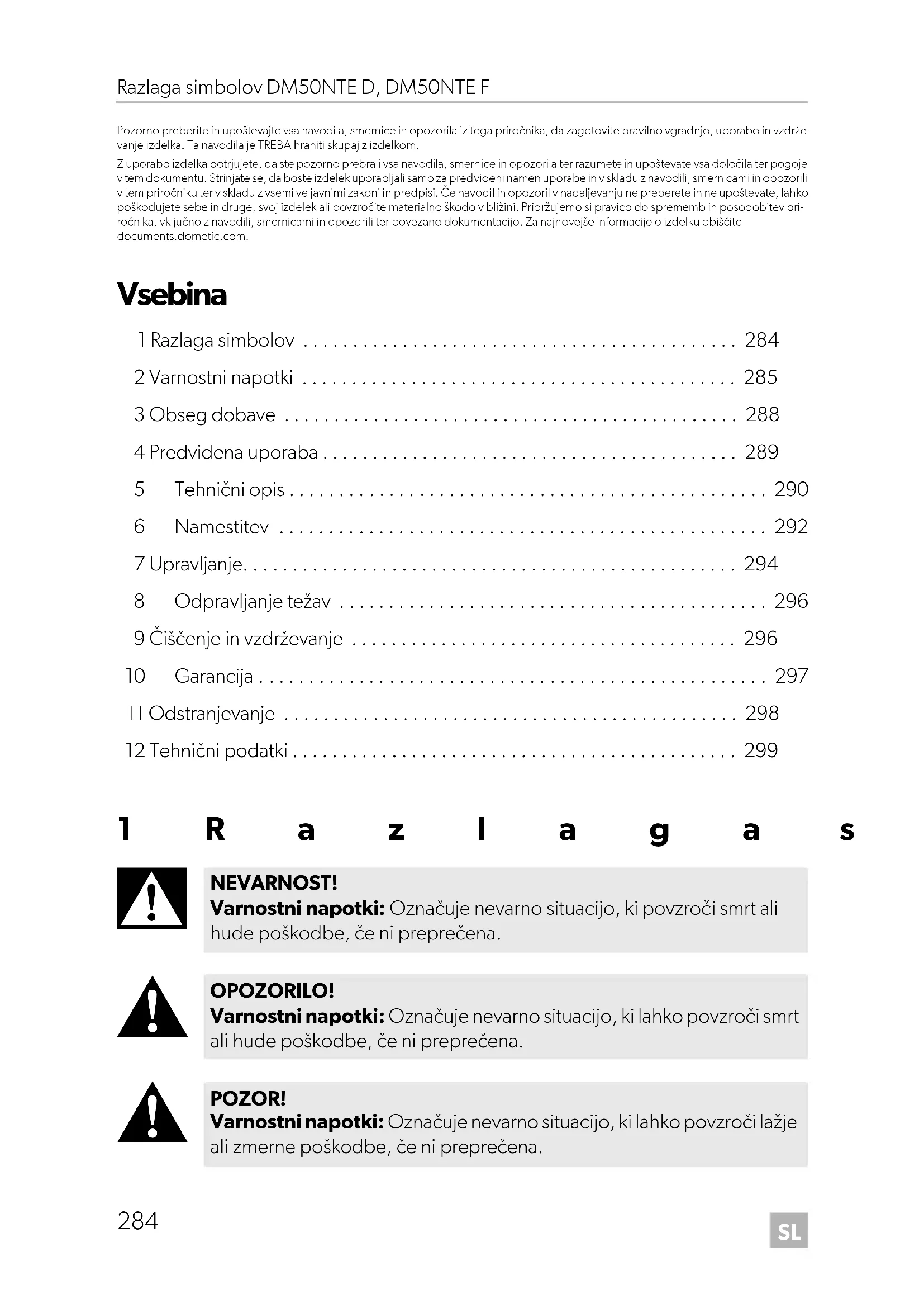 NEVARNOST! Varnostni napotki: Označuje nevarno situacijo, ki povzroči smrt ali hude poškodbe, če ni preprečena. OPOZORILO! Varnostni napotki: Označuje nevarno situacijo, ki lahko povzroči smrt ali hude poškodbe, če ni preprečena. POZOR! Varnostni napotki: Označuje nevarno situacijo, ki lahko povzroči lažje ali zmerne poškodbe, če ni preprečena.SL DM50NTE D, DM50NTE F Varnostni napotki