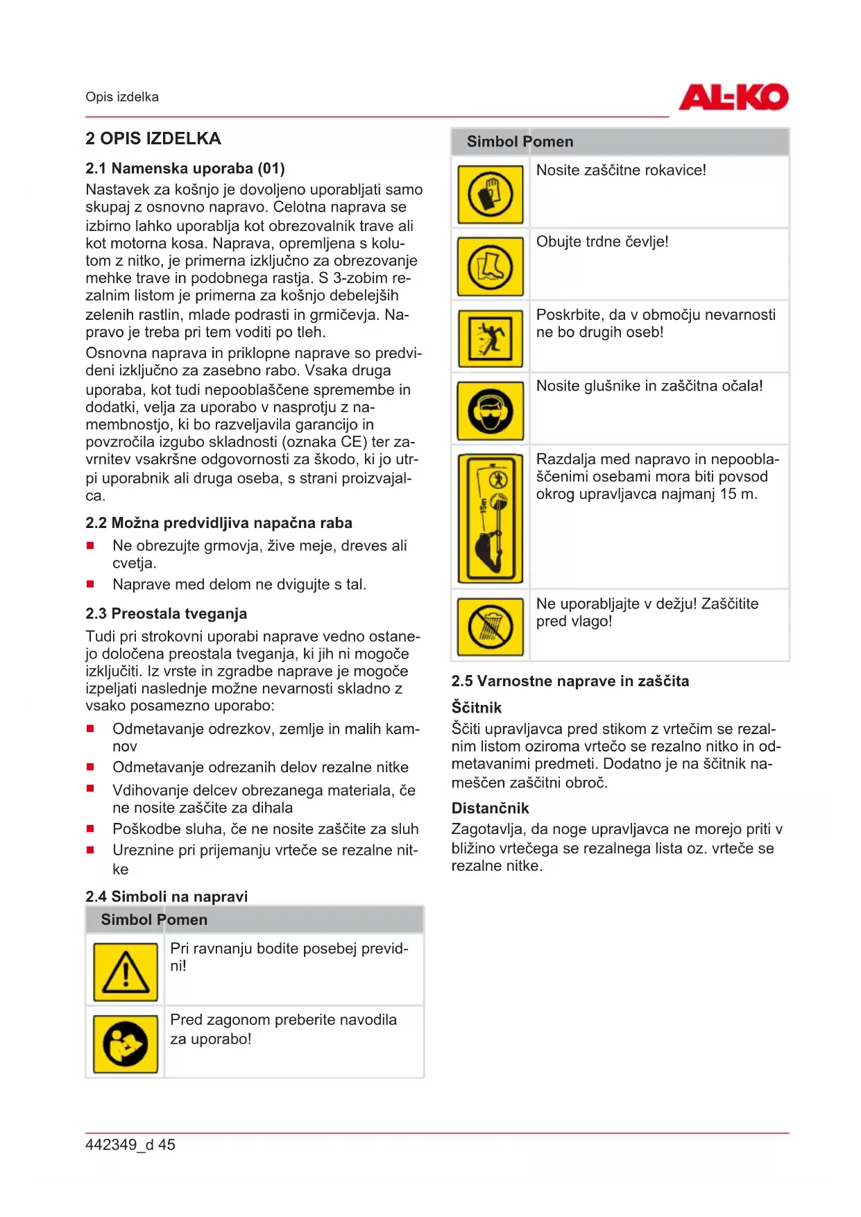 Simbol Pomen Pri ravnanju bodite posebej previd- ni! Pred zagonom preberite navodila za uporabo! Simbol Pomen Nosite zaščitne rokavice! Obujte trdne čevlje! Poskrbite, da v območju nevarnosti ne bo drugih oseb! Nosite glušnike in zaščitna očala! Razdalja med napravo in nepoobla- ščenimi osebami mora biti povsod okrog upravljavca najmanj 15m. Ne uporabljajte v dežju! Zaščitite pred vlago!