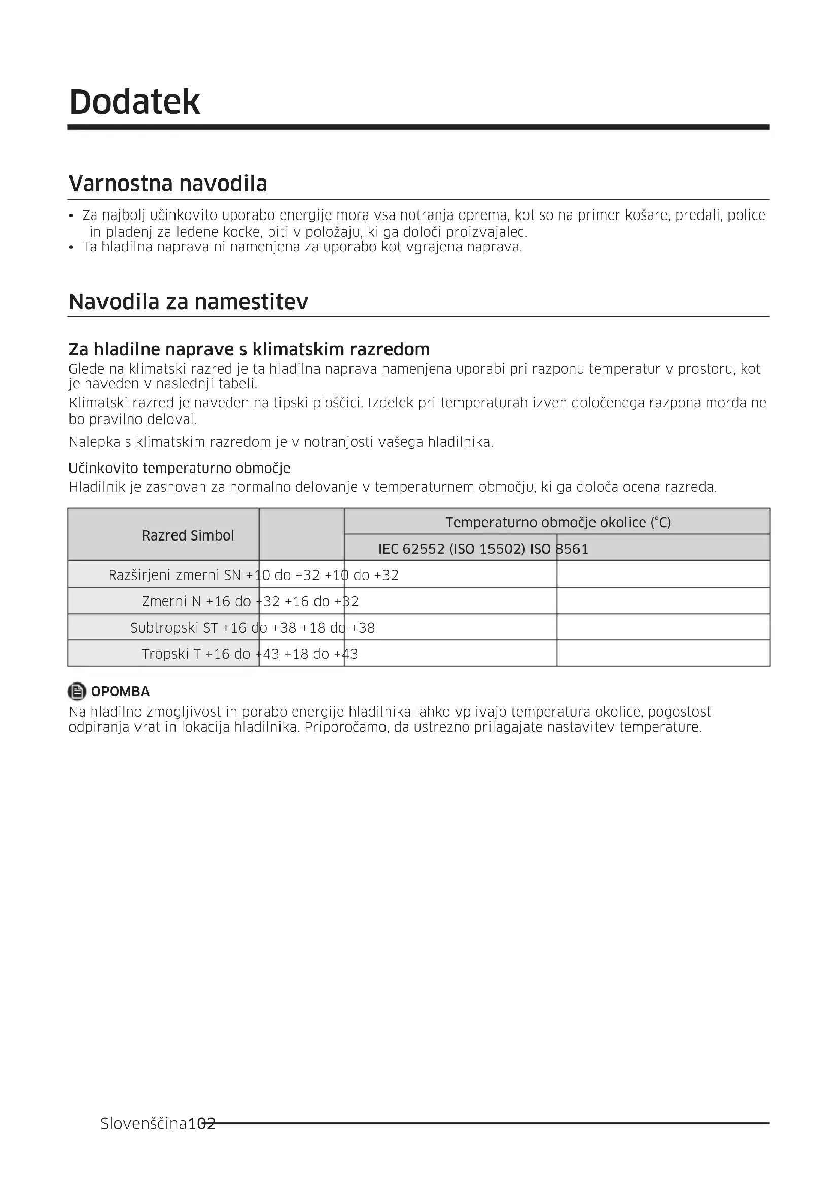 Razširjeni zmerni SN +10 do +32 +10 do +32 Zmerni N +16 do +32 +16 do +32 Subtropski ST +16 do +38 +18 do +38 Tropski T +16 do +43 +18 do +43 OPOMBA Na hladilno zmogljivost in porabo energije hladilnika lahko vplivajo temperatura okolice, pogostost odpiranja vrat in lokacija hladilnika. Priporočamo, da ustrezno prilagajate nastavitev temperature.Slovenščina 103 Navodila glede temperature Priporočena temperatura Optimalna nastavitev temperature za shranjevanje živil: