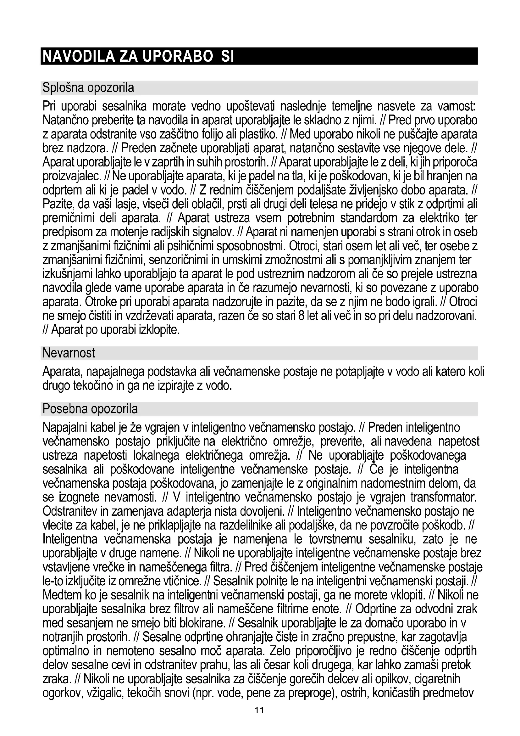 ODSTRANJEVANJE APARATA Če ugotovite, da želite aparat zamenjati oz. ga ne potrebujete več, mislite pri tem tudi na zaščito okolja. Preden odvržete sesalnik v smeti, je treba odstraniti baterijo. // Za varno odstranitev baterije poskrbite, da je baterija popolnoma prazna. Če aparat nima odstranljive baterije, upoštevajte navodila, ki so podana v slikovni knjižici.