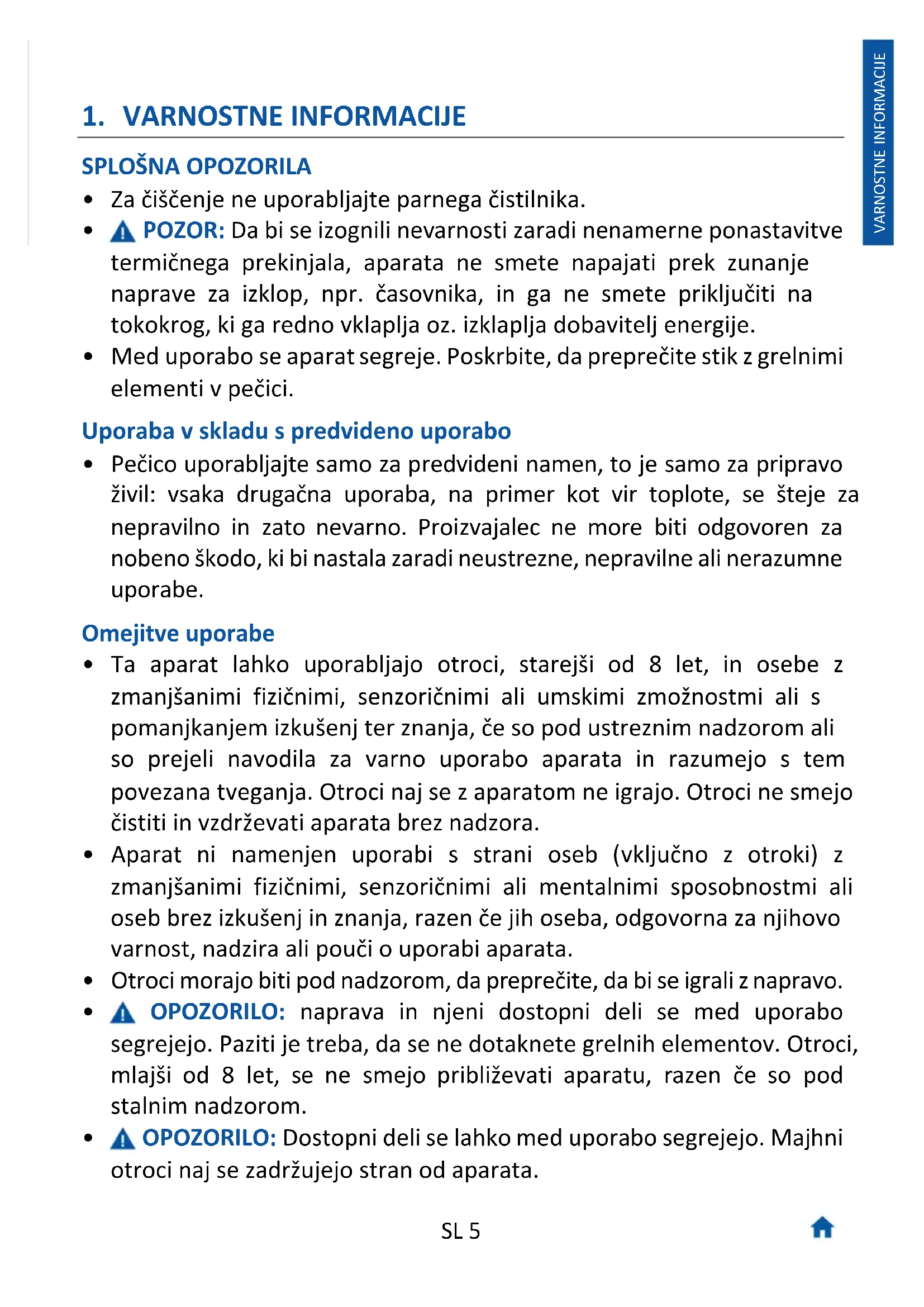 - Ta aparat lahko uporabljajo otroci, starejši od 8 let, in osebe z zmanjšanimi fizičnimi, senzoričnimi ali umskimi zmožnostmi ali s pomanjkanjem izkušenj ter znanja, če so pod ustreznim nadzorom ali so prejeli navodila za varno uporabo aparata in razumejo s tem povezana tveganja. Otroci naj se z aparatom ne igrajo. Otroci ne smejo čistiti in vzdrževati aparata brez nadzora.