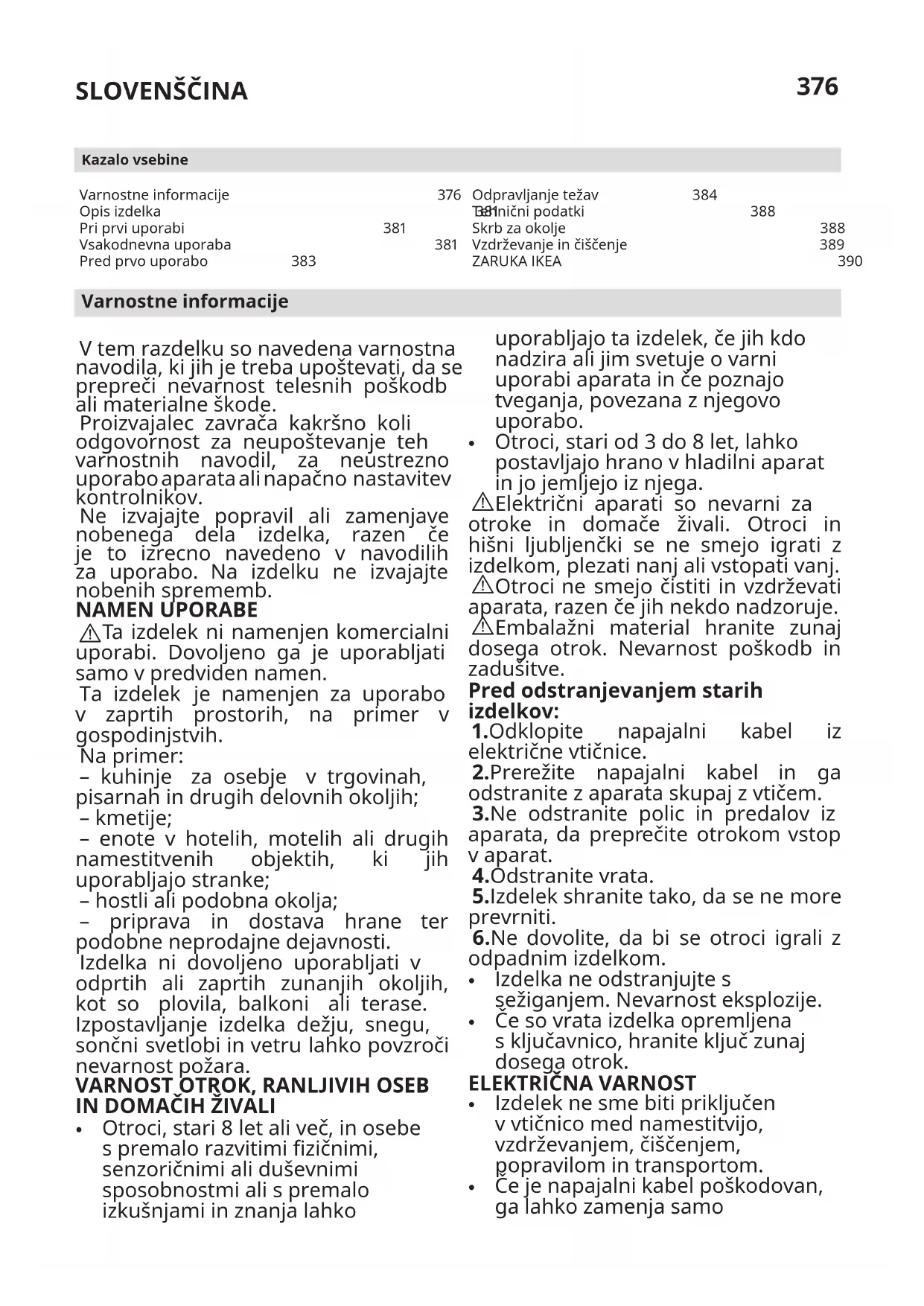 Varnostne informacije 376 Opis izdelka 381 Pri prvi uporabi 381 Vsakodnevna uporaba 381 Pred prvo uporabo 383 Kazalo vsebine Odpravljanje težav 384 Tehnični podatki 388 Skrb za okolje 388 Vzdrževanje in čiščenje 389 ZARUKA IKEA 390 Varnostne informacije V tem razdelku so navedena varnostna navodila, ki jih je treba upoštevati, da se prepreči nevarnost telesnih poškodb ali materialne škode. Proizvajalec zavrača kakršno koli odgovornost za neupoštevanje teh varnostnih navodil, za neustrezno uporabo aparata ali napačno nastavitev kontrolnikov. Ne izvajajte popravil ali zamenjave nobenega dela izdelka, razen če je to izrecno navedeno v navodilih za uporabo. Na izdelku ne izvajajte nobenih sprememb. NAMEN UPORABE