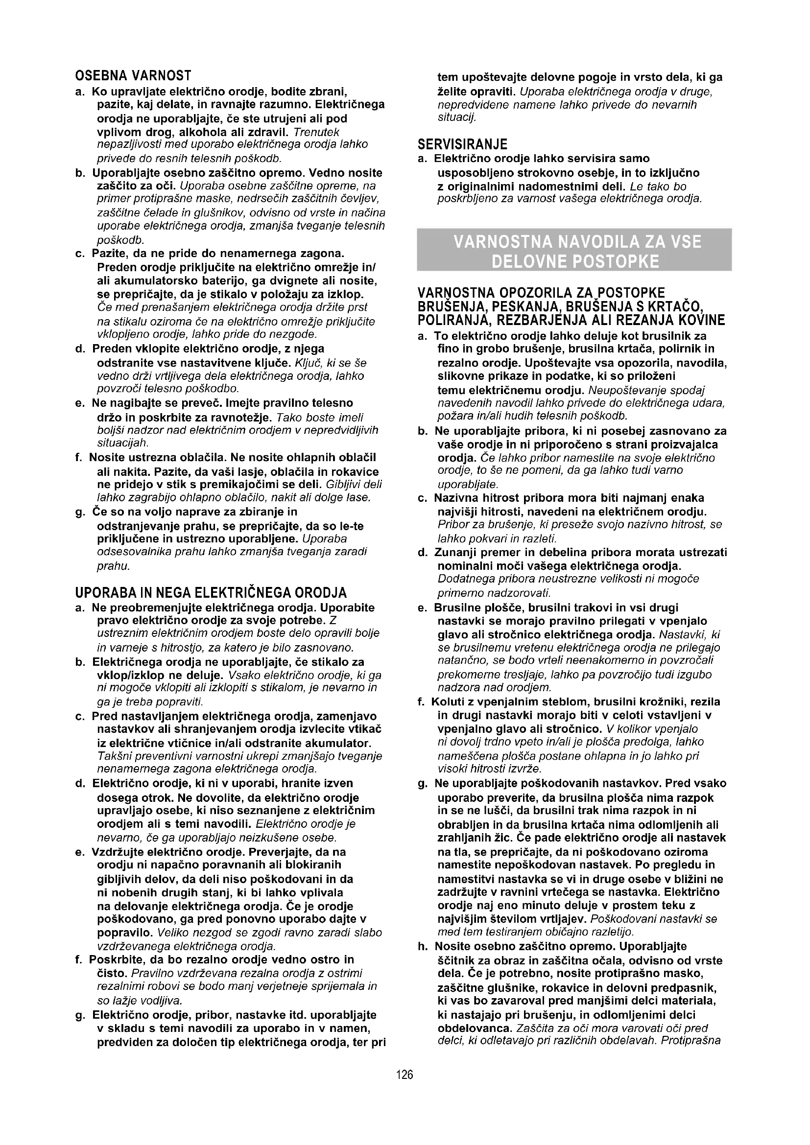 a. Vtič električnega orodja se mora ujemati z vtičnico. Vtiča nikoli ne spreminjajte na kakršenkoli način. Pri uporabi ozemljenega električnega orodja ne uporabljajte adapterskih vtičev. Z uporabo nespremenjenih vtičev in ustreznih vtičnic boste zmanjšali nevarnost električnega udara.b. Izogibajte se telesnemu stiku z ozemljenimi površinami, kot so cevi, grelci, štedilniki in hladilniki. Če je vaše telo ozemljeno, obstaja povečano tveganje električnega udara.c. Električno orodje zavarujte pred dežjem in vlago. Vdor vode v električno orodje poveča tveganje električnega udara.d. Z električnim kablom ravnajte primerno. Nikoli ne nosite orodja tako, da držite kabel, ne vlecite za kabel in ne odklapljajte vtiča tako, da vlečete za kabel. Kabel zavarujte pred vročino, oljem, ostrimi robovi in gibljivimi deli. Poškodovani in zavozlani kabli povečajo tveganje električnega udara.e. Kadar z električnim orodjem delate na prostem, uporabite podaljšek, ki je primeren za uporabo na prostem. Uporaba kabla, primernega za uporabo na prostem, zmanjša tveganje električnega udara.f. Če se uporabi električnega orodja na vlažni lokaciji ni mogoče izogniti, uporabite napajanje, zaščiteno s prekinjevalcem električnega tokokroga. Prekinjevalec električnega tokokroga zmanjšuje tveganje električnega udara. 125OSEBNA VARNOST a. Ko upravljate električno orodje, bodite zbrani, pazite, kaj delate, in ravnajte razumno. Električnega orodja ne uporabljajte, če ste utrujeni ali pod vplivom drog, alkohola ali zdravil. Trenutek nepazljivosti med uporabo električnega orodja lahko privede do resnih telesnih poškodb. b. Uporabljajte osebno zaščitno opremo. Vedno nosite zaščito za oči. Uporaba osebne zaščitne opreme, na primer protiprašne maske, nedrsečih zaščitnih čevljev, zaščitne čelade in glušnikov, odvisno od vrste in načina uporabe električnega orodja, zmanjša tveganje telesnih poškodb. c. Pazite, da ne pride do nenamernega zagona. Preden orodje priključite na električno omrežje in/ ali akumulatorsko baterijo, ga dvignete ali nosite, se prepričajte, da je stikalo v položaju za izklop. Če med prenašanjem električnega orodja držite prst na stikalu oziroma če na električno omrežje priključite vklopljeno orodje, lahko pride do nezgode. d. Preden vklopite električno orodje, z njega odstranite vse nastavitvene ključe. Ključ, ki se še vedno drži vrtljivega dela električnega orodja, lahko povzroči telesno poškodbo. e. Ne nagibajte se preveč. Imejte pravilno telesno držo in poskrbite za ravnotežje. Tako boste imeli boljši nadzor nad električnim orodjem v nepredvidljivih situacijah. f. Nosite ustrezna oblačila. Ne nosite ohlapnih oblačil ali nakita. Pazite, da vaši lasje, oblačila in rokavice ne pridejo v stik s premikajočimi se deli. Gibljivi deli lahko zagrabijo ohlapno oblačilo, nakit ali dolge lase. g. Če so na voljo naprave za zbiranje in odstranjevanje prahu, se prepričajte, da so le-te priključene in ustrezno uporabljene. Uporaba odsesovalnika prahu lahko zmanjša tveganja zaradi prahu.