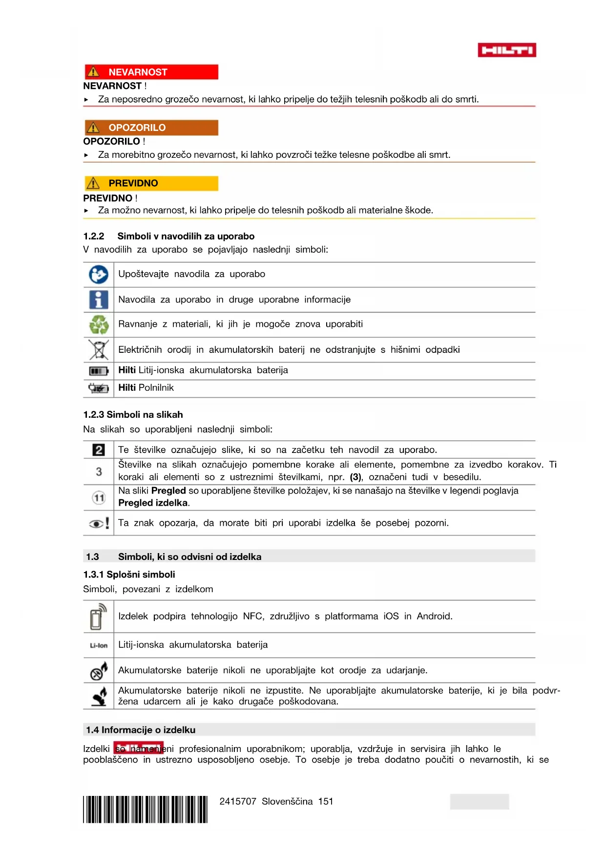 V navodilih za uporabo se pojavljajo naslednji simboli: Upoštevajte navodila za uporabo Navodila za uporabo in druge uporabne informacije Ravnanje z materiali, ki jih je mogoče znova uporabiti Električnih orodij in akumulatorskih baterij ne odstranjujte s hišnimi odpadki Hilti Litij-ionska akumulatorska baterija Hilti Polnilnik