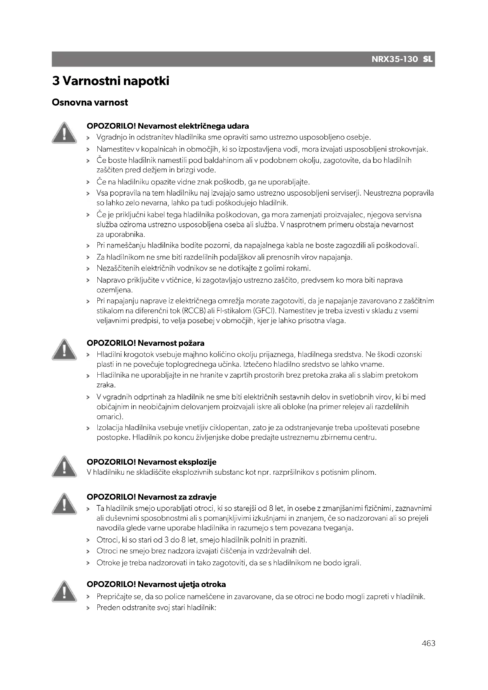 3 Varnostni napotki Osnovna varnost OPOZORILO! Nevarnost električnega udara Vgradnjo in odstranitev hladilnika sme opraviti samo ustrezno usposobljeno osebje. Namestitev v kopalnicah in območjih, ki so izpostavljena vodi, mora izvajati usposobljeni strokovnjak. Če boste hladilnik namestili pod baldahinom ali v podobnem okolju, zagotovite, da bo hladilnih zaščiten pred dežjem in brizgi vode. Če na hladilniku opazite vidne znak poškodb, ga ne uporabljajte. Vsa popravila na tem hladilniku naj izvajajo samo ustrezno usposobljeni serviserji. Neustrezna popravila so lahko zelo nevarna, lahko pa tudi poškodujejo hladilnik. Če jepriključni kabel tega hladilnika poškodovan, ga mora zamenjati proizvajalec, njegova servisna služba oziroma ustrezno usposobljena oseba ali služba. V nasprotnem primeru obstaja nevarnost zauporabnika. Pri nameščanju hladilnika bodite pozorni, da napajalnega kabla ne boste zagozdili ali poškodovali. Za hladilnikom ne sme biti razdelilnih podaljškov ali prenosnih virov napajanja. Nezaščitenih električnih vodnikov se ne dotikajte z golimi rokami. Napravo priključite v vtičnice, ki zagotavljajo ustrezno zaščito, predvsem ko mora biti naprava ozemljena. Pri napajanju naprave iz električnega omrežja morate zagotoviti, da je napajanje zavarovano z zaščitnim stikalom na diferenčni tok (RCCB) ali FI-stikalom (GFCI). Namestitev je treba izvesti v skladu z vsemi veljavnimi predpisi, to velja posebej v območjih, kjer je lahko prisotna vlaga. OPOZORILO! Nevarnost požara Hladilni krogotok vsebuje majhno količino okolju prijaznega, hladilnega sredstva. Ne škodi ozonski plasti in ne povečuje toplogrednega učinka. Iztečeno hladilno sredstvo se lahko vname. Hladilnika ne uporabljajte in ne hranite v zaprtih prostorih brez pretoka zraka ali s slabim pretokom zraka. V vgradnih odprtinah za hladilnik ne sme biti električnih sestavnih delov in svetlobnih virov, ki bi med običajnim in neobičajnim delovanjem proizvajali iskre ali obloke (na primer relejev ali razdelilnih omaric). Izolacija hladilnika vsebuje vnetljiv ciklopentan, zato jezaodstranjevanje treba upoštevati posebne postopke. Hladilnik pokoncu življenjske dobe predajte ustreznemu zbirnemu centru. OPOZORILO! Nevarnost eksplozije V hladilniku ne skladiščite eksplozivnih substanc kot npr. razpršilnikov s potisnim plinom. OPOZORILO! Nevarnost zazdravje Ta hladilnik smejo uporabljati otroci, ki so starejši od 8let, in osebe z zmanjšanimi fizičnimi, zaznavnimi ali duševnimi sposobnostmi ali s pomanjkljivimi izkušnjami in znanjem, če so nadzorovani ali so prejeli navodila glede varne uporabe hladilnika in razumejo s tem povezana tveganja. Otroci, ki so stari od 3 do 8let, smejo hladilnik polniti in prazniti. Otroci ne smejo brez nadzora izvajati čiščenja in vzdrževalnih del. Otroke je treba nadzorovati in tako zagotoviti, da se s hladilnikom ne bodo igrali. OPOZORILO! Nevarnost ujetja otroka Prepričajte se, da so police nameščene in zavarovane, da seotroci ne bodo mogli zapreti vhladilnik. Preden odstranite svoj stari hladilnik: 463SLNRX35-130