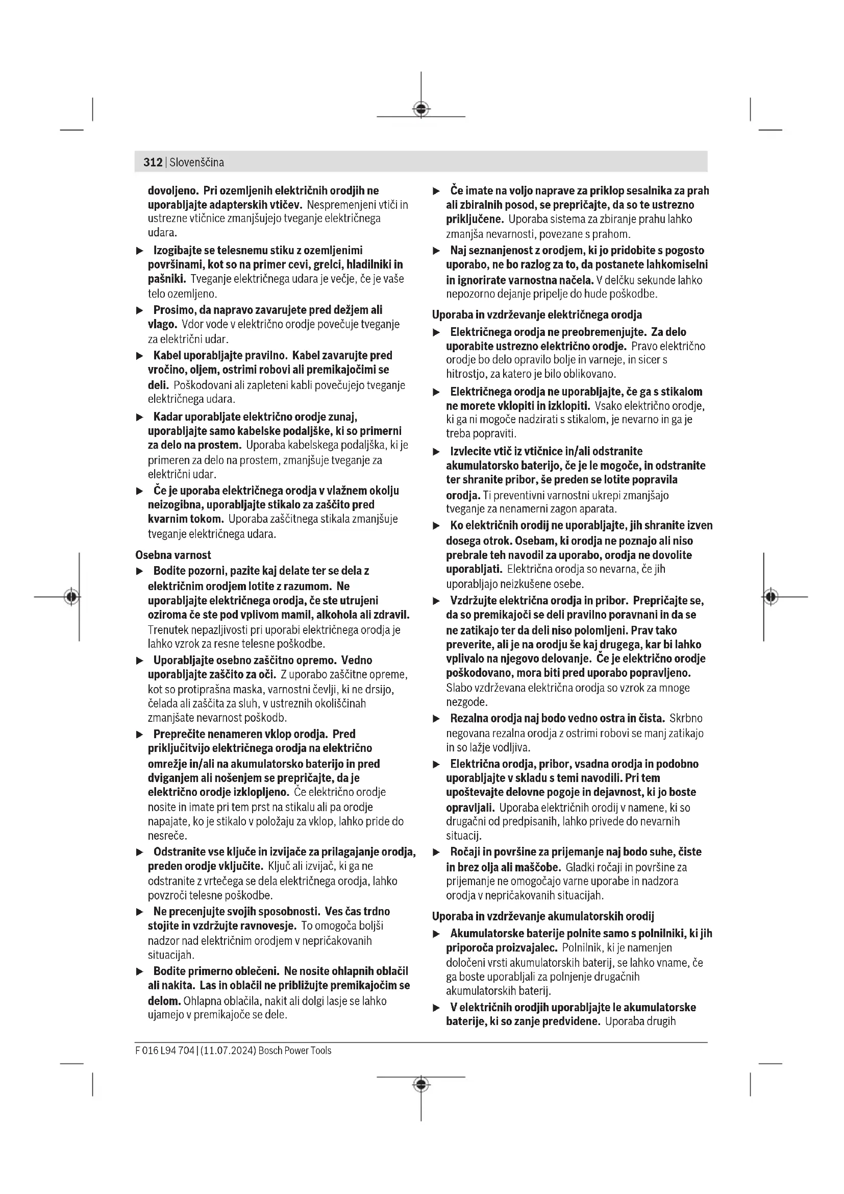 i na: www.bosch-pt.com/serviceaddresses Transport Sadržani litijum-jonski akumulatori podležu zahtevima zakona o opasnim materijalima. Korisnik može da transportuje akumulatore kopnenim putem bez dodatnih uslova. Kod slanja preko posrednika (npr.: vazdušnim transportom ili otpremom) treba poštovati posebne zahteve u pogledu pakovanja i označavanja. Pri tome je kod pripreme pošiljke potrebno angažovati stručnjaka za opasne materijale. Šaljite akumulatore samo ako je kućište neoštećeno. Otvorene kontakte odlepite i tako upakujte akumulator da se u pakovanju ne pokreće. Molimo da obratite pažnju i na eventualne dodatne nacionalne propise. Zbrinjavanje Proizvode, akumulatore, pribor i pakovanja treba odvesti na ekološki savesno recikliranje. Proizvode i akumulatore/baterije ne bacajte u kućni otpad! Samo za zemlje EU: Prema Evropskoj direktivi 2012/19/EU proizvodi koji nisu više upotrebljivi, a prema Evropskoj direktivi 2006/66/EZ akumulatori/baterije koje su neispravne ili istrošene moraju se odvojeno sakupiti i reciklirati na ekološki prihvatljiv način. Ako se nepravilno zbrine, otpadna električna i elektronska oprema može imati štetne posledice po životnu sredinu i zdravlje ljudi zbog moguceg prisustva opasnih materija. Akumulatori/baterije: Litijum-jonski: Molimo da obratite pažnju na uputstva u odeljku (videti „Transport“, Strana311). Slovenščina Varnostna navodila Razlaga slikovnih simbolov Preberite si to navodilo za obratovanje. Splošno opozorilo na nevarnost. Ne uporabljajte pri dežju. Držite verižno žago vedno z obema rokama. Pazite na povratni udarec verižne žage in preprečite stik s konico meča. Nosite svojo osebno zaščitno opremo (OZO) in uporabljajte zaščito za oči, sluh in glavo. Nosite zaščitne rokavice. OPOZORILO: Ločite akumulator pred začetkom vzdrževalnih del. Splošna varnostna navodila za električna orodja OPOZORILO Preberite vsa varnostna opozorila, navodila, ilustracije in specifikacije, ki so priložene temu električnemu orodju. Če spodaj navedenih napotkov ne upoštevate, lahko pride do električnega udara, požara in/ali težke poškodbe. Vsa opozorila in napotke shranite, ker jih boste v prihodnje še potrebovali. Pojem električno orodje, ki se pojavlja v nadaljnjem besedilu, se nanaša na električna orodja z električnim pogonom (z električnim kablom) in na akumulatorska električna orodja (brez električnega kabla). Varnost na delovnem mestu u Delovno mesto naj bo vedno čisto in dobro osvetljeno. Nered in neosvetljena delovna mesta povečajo možnost nezgod. u Električnega orodja ne uporabljajte v okolju, v katerem lahko pride do eksplozij (prisotnost vnetljivih tekočin, plinov ali prahu). Električna orodja povzročajo iskrenje, zaradi katerega se lahko prah ali hlapi vnamejo. u Ko uporabljate električno orodje, poskrbite, da v bližini ni otrok ali drugih oseb. Odvračanje pozornosti lahko povzroči izgubo nadzora nad orodjem. Električna varnost u Priključni vtič električnega orodja se mora prilegati vtičnici. Spreminjanje vtiča na kakršen koli način ni Bosch Power Tools F 016 L94 704 | (11.07.2024)312 | Slovenščina dovoljeno. Pri ozemljenih električnih orodjih ne uporabljajte adapterskih vtičev. Nespremenjeni vtiči in ustrezne vtičnice zmanjšujejo tveganje električnega udara. u Izogibajte se telesnemu stiku z ozemljenimi površinami, kot so na primer cevi, grelci, hladilniki in pašniki. Tveganje električnega udara je večje, če je vaše telo ozemljeno. u Prosimo, da napravo zavarujete pred dežjem ali vlago. Vdor vode v električno orodje povečuje tveganje za električni udar. u Kabel uporabljajte pravilno. Kabel zavarujte pred vročino, oljem, ostrimi robovi ali premikajočimi se deli. Poškodovani ali zapleteni kabli povečujejo tveganje električnega udara. u Kadar uporabljate električno orodje zunaj, uporabljajte samo kabelske podaljške, ki so primerni za delo na prostem. Uporaba kabelskega podaljška, ki je primeren za delo na prostem, zmanjšuje tveganje za električni udar. u Če je uporaba električnega orodja v vlažnem okolju neizogibna, uporabljajte stikalo za zaščito pred kvarnim tokom. Uporaba zaščitnega stikala zmanjšuje tveganje električnega udara. Osebna varnost u Bodite pozorni, pazite kaj delate ter se dela z električnim orodjem lotite z razumom. Ne uporabljajte električnega orodja, če ste utrujeni oziroma če ste pod vplivom mamil, alkohola ali zdravil. Trenutek nepazljivosti pri uporabi električnega orodja je lahko vzrok za resne telesne poškodbe. u Uporabljajte osebno zaščitno opremo. Vedno uporabljajte zaščito za oči. Z uporabo zaščitne opreme, kot so protiprašna maska, varnostni čevlji, ki ne drsijo, čelada ali zaščita za sluh, v ustreznih okoliščinah zmanjšate nevarnost poškodb. u Preprečite nenameren vklop orodja. Pred priključitvijo električnega orodja na električno omrežje in/ali na akumulatorsko baterijo in pred dviganjem ali nošenjem se prepričajte, da je električno orodje izklopljeno. Če električno orodje nosite in imate pri tem prst na stikalu ali pa orodje napajate, ko je stikalo v položaju za vklop, lahko pride do nesreče. u Odstranite vse ključe in izvijače za prilagajanje orodja, preden orodje vključite. Ključ ali izvijač, ki ga ne odstranite z vrtečega se dela električnega orodja, lahko povzroči telesne poškodbe. u Ne precenjujte svojih sposobnosti. Ves čas trdno stojite in vzdržujte ravnovesje. To omogoča boljši nadzor nad električnim orodjem v nepričakovanih situacijah. u Bodite primerno oblečeni. Ne nosite ohlapnih oblačil ali nakita. Las in oblačil ne približujte premikajočim se delom. Ohlapna oblačila, nakit ali dolgi lasje se lahko ujamejo v premikajoče se dele. u Če imate na voljo naprave za priklop sesalnika za prah ali zbiralnih posod, se prepričajte, da so te ustrezno priključene. Uporaba sistema za zbiranje prahu lahko zmanjša nevarnosti, povezane s prahom. u Naj sez