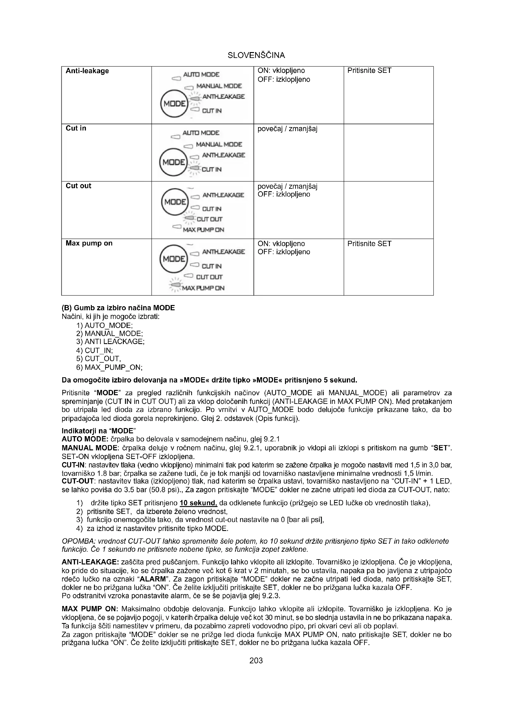 Da omogočite izbiro delovanja na »MODE« držite tipko »MODE« pritisnjeno 5 sekund. Pritisnite “MODE” za pregled različnih funkcijskih načinov (AUTO_MODE ali MANUAL_MODE) ali parametrov za spreminjanje (CUT IN in CUT OUT) ali za vklop določenih funkcij (ANTI-LEAKAGE in MAX PUMP ON). Med pretakanjem bo utripala led dioda za izbrano funkcijo. Po vrnitvi v AUTO_MODE bodo delujoče funkcije prikazane tako, da bo pripadajoča led dioda gorela neprekinjeno. Glej 2. odstavek (Opis funkcij). Indikatorji na “MODE” AUTO MODE: črpalka bo delovala v samodejnem načinu, glej 9.2.1 MANUAL MODE: črpalka deluje v ročnem načinu, glej 9.2.1, uporabnik jo vklopi ali izklopi s pritiskom na gumb “SET”. SET-ON vklopljena SET-OFF izklopljena. CUT-IN: nastavitev tlaka (vedno vklopljeno) minimalni tlak pod katerim se zažene črpalka je mogoče nastaviti med 1,5 in 3,0 bar, tovarniško 1.8 bar; črpalka se zažene tudi, če je tok manjši od tovarniško nastavljene minimalne vrednosti 1,5 l/min. CUT-OUT: nastavitev tlaka (izklopljeno) tlak, nad katerim se črpalka ustavi, tovarniško nastavljeno na “CUT-IN” + 1 LED, se lahko poviša do 3.5 bar (50.8 psi)., Za zagon pritiskajte “MODE” dokler ne začne utripati led dioda za CUT-OUT, nato: