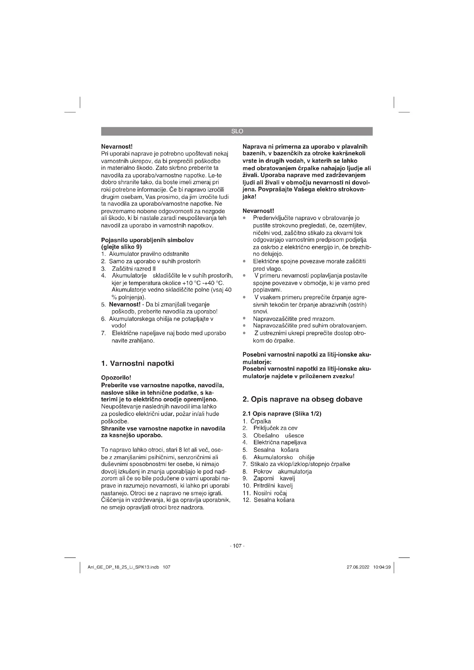 Z ustreznimi ukrepi preprečite dostop otro- kom do črpalke. Posebni varnostni napotki za litij-ionske aku- mulatorje: Posebni varnostni napotki za litij-ionske aku- mulatorje najdete v priloženem zvezku!
