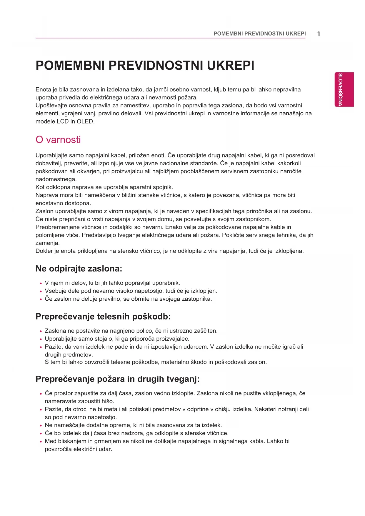 Enota je bila zasnovana in izdelana tako, da jamči osebno varnost, kljub temu pa bi lahko nepravilna uporaba privedla do električnega udara ali nevarnosti požara.Upoštevajte osnovna pravila za namestitev, uporabo in popravila tega zaslona, da bodo vsi varnostni elementi, vgrajeni vanj, pravilno delovali. Vsi previdnostni ukrepi in varnostne informacije se nanašajo na modele LCD in OLED. O varnosti Uporabljajte samo napajalni kabel, priložen enoti. Če uporabljate drug napajalni kabel, ki ga ni posredoval dobavitelj, preverite, ali izpolnjuje vse veljavne nacionalne standarde. Če je napajalni kabel kakorkoli poškodovan ali okvarjen, pri proizvajalcu ali najbližjem pooblaščenem servisnem zastopniku naročite nadomestnega.Kot odklopna naprava se uporablja aparatni spojnik. Naprava mora biti nameščena v bližini stenske vtičnice, s katero je povezana, vtičnica pa mora biti enostavno dostopna.Zaslon uporabljajte samo z virom napajanja, ki je naveden v specifikacijah tega priročnika ali na zaslonu.Če niste prepričani o vrsti napajanja v svojem domu, se posvetujte s svojim zastopnikom.Preobremenjene vtičnice in podaljški so nevarni. Enako velja za poškodovane napajalne kable in polomljene vtiče. Predstavljajo tveganje električnega udara ali požara. Pokličite servisnega tehnika, da jih zamenja.Dokler je enota priklopljena na stensko vtičnico, je ne odklopite z vira napajanja, tudi če je izklopljena. Ne odpirajte zaslona: