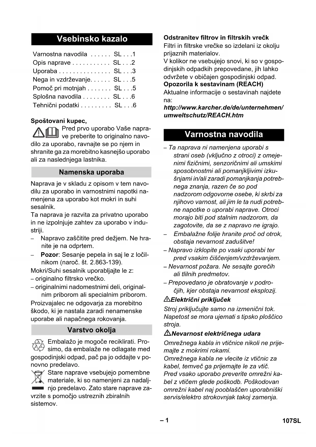 - Pomoc při poruchách Kabelový naviják nefunguje Vytéká voda. Snížení sacího výkonu J 1 105CS– 6 Filtrační sáček je plný: Nasaďte nový fil- trační sáček (objednací č. viz seznam náhradních dílů na konci tohoto návodu). 몇 Pozor! Prosíme nevyhazujte úchyt filtračního sáčku! V každé zemi platí záruční podmínky vyda- né naší příslušnou distribuční společností. Eventuální poruchy vzniklé na přístroji odstraníme během záruční doby bezplatně v případě, je-li příčinou poruchy chyba materiálu nebo výrobce. V případě záruky se prosím obraťte i s příslušenstvím a pro- dejním účtem na Vašeho obchodníka nebo na nejbližší autorizovanou servisní službu. (Adresy poboček najdete na zadní straně) Budete-li mít otázky nebo v případě poru- chy Vám naše zastoupení KÄRCHER rádo pomůže. (Adresy poboček najdete na zadní straně) Výběr nejčastěji vyžadovaných náhradních díků najdete na konci návodu k obsluze. Náhradní díly a příslušenství dostanete u Vašeho prodejce nebo na pobočce KÄR- CHER. (Adresy poboček najdete na zadní straně) Technické údaje naleznete na výklopné straně. Zde jsou vysvětleny použité symbo- ly. Technické změny vyhrazeny. Obecná upozornění Záruka Oddělení služeb zákazníkům Objednávka náhradních dílů a zvláštního příslušenství Technické údaje Napětí Výkon P jmen Výkon P max Max. přikon přístrojové zástrčky Síťová pojistka (pomalá) Objem sběrné nádoby Nasávání vody pomocí rukojeti Nasávání vody pomocí podlaho- vé trysky Sít'ový kabel Hladina akustického tlaku (EN 60704-2-1) Hmotnost (bez příslušenství) 106 CS– 1 Spoštovani kupec, Pred prvo uporabo Vaše napra- ve preberite to originalno navo- dilo za uporabo, ravnajte se po njem in shranite ga za morebitno kasnejšo uporabo ali za naslednjega lastnika. Naprava je v skladu z opisom v tem navo- dilu za uporabo in varnostnimi napotki na- menjena za uporabo kot mokri in suhi sesalnik. Ta naprava je razvita za privatno uporabo in ne izpolnjuje zahtev za uporabo v indu- striji. – Napravo zaščitite pred dežjem. Ne hra- nite je na odprtem. – Pozor: Sesanje pepela in saj le z ločil- nikom (naroč. št. 2.863-139). Mokri/Suhi sesalnik uporabljajte le z: – originalno filtrsko vrečko. – originalnimi nadomestnimi deli, original- nim priborom ali specialnim priborom. Proizvajalec ne odgovarja za morebitno škodo, ki je nastala zaradi nenamenske uporabe ali napačnega rokovanja. Embalažo je mogoče reciklirati. Pro- simo, da embalaže ne odlagate med gospodinjski odpad, pač pa jo oddajte v po- novno predelavo. Stare naprave vsebujejo pomembne materiale, ki so namenjeni za nadalj- njo predelavo. Zato stare naprave za- vrzite s pomočjo ustreznih zbiralnih sistemov. Filtri in filtrske vrečke so izdelani iz okolju prijaznih materialov. V kolikor ne vsebujejo snovi, ki so v gospo- dinjskih odpadkih prepovedane, jih lahko odvržete v običajen gospodinjski odpad. Opozorila k sestavinam (REACH) Aktualne informacije o sestavinah najdete na: http://www.karcher.de/de/unternehmen/ umweltschutz/REACH.htm – Ta naprava ni namenjena uporabi s strani oseb (vključno z otroci) z omeje- nimi fizičnimi, senzoričnimi ali umskimi sposobnostmi ali pomanjkljivimi izku- šnjami in/ali zaradi pomanjkanja potreb- nega znanja, razen če so pod nadzorom odgovorne osebe, ki skrbi za njihovo varnost, ali jim le ta nudi potreb- ne napotke o uporabi naprave. Otroci morajo biti pod stalnim nadzorom, da zagotovite, da se z napravo ne igrajo. – Embalažne folije hranite proč od otrok, obstaja nevarnost zadušitve! – Napravo izklopite po vsaki uporabi ter pred vsakim čiščenjem/vzdrževanjem. – Nevarnost požara. Ne sesajte gorečih ali tlilnih predmetov. – Prepovedano je obratovanje v podro- čjih, kjer obstaja nevarnost eksplozij. 몇 Električni priključek Stroj priključujte samo na izmenični tok. Napetost se mora ujemati s tipsko ploščico stroja. Nevarnost električnega udara Omrežnega kabla in vtičnice nikoli ne prije- majte z mokrimi rokami. Omrežnega kabla ne vlecite iz vtičnic za kabel, temveč ga prijemajte le za vtič. Pred vsako uporabo preverite omrežni ka- bel z vtičem glede poškodb. Poškodovan omrežni kabel naj pooblaščen uporabniški servis/elektro strokovnjak takoj zamenja. Vsebinsko kazalo Varnostna navodila