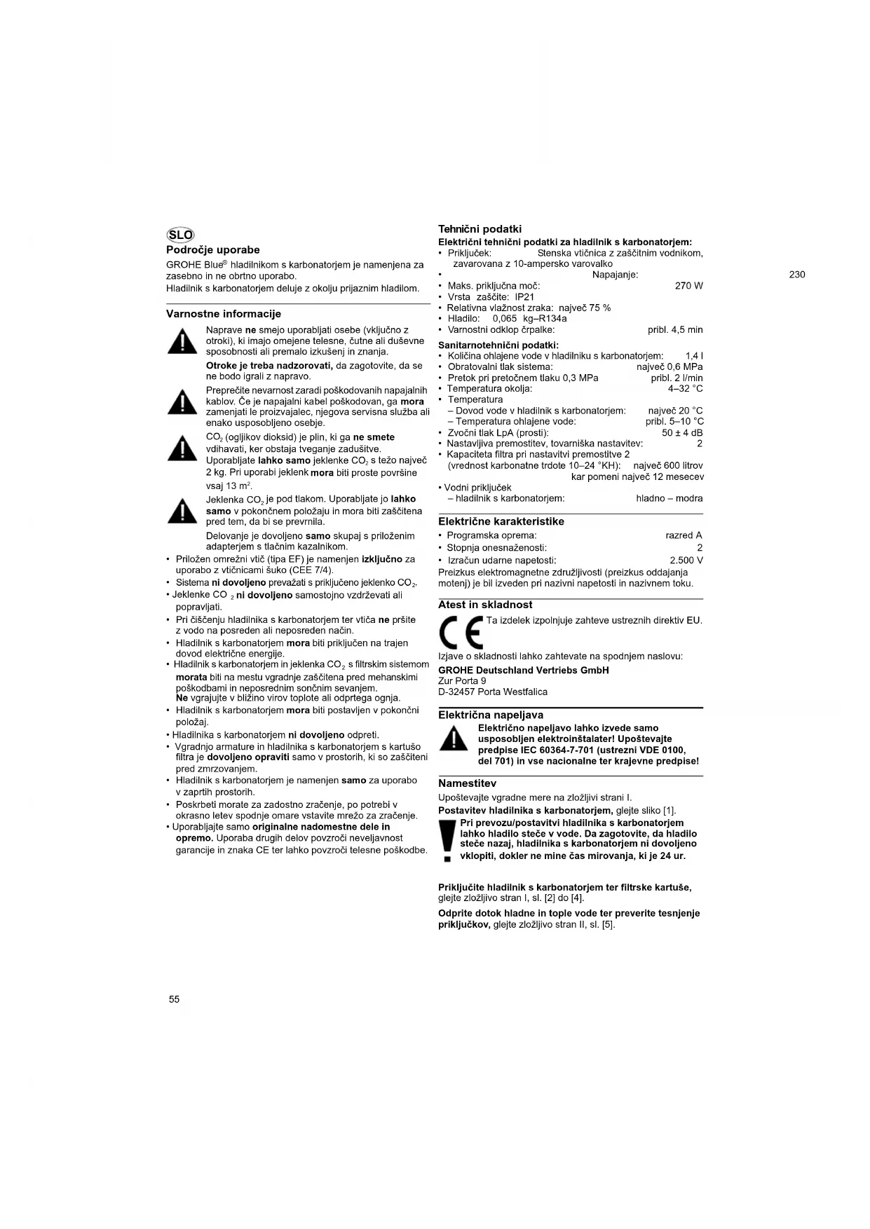 - Izračun udarne napetosti: 2.500 V Preizkus elektromagnetne združljivosti (preizkus oddajanja motenj) je bil izveden pri nazivni napetosti in nazivnem toku. Atest in skladnost Izjave o skladnosti lahko zahtevate na spodnjem naslovu: GROHE Deutschland Vertriebs GmbH Zur Porta 9 D-32457 Porta Westfalica Električna napeljava Električno napeljavo lahko izvede samo usposobljen elektroinštalater! Upoštevajte predpise IEC 60364-7-701 (ustrezni VDE 0100, del 701) in vse nacionalne ter krajevne predpise! Namestitev Upoštevajte vgradne mere na zložljivi strani I. Postavitev hladilnika s karbonatorjem, glejte sliko [1]. Pri prevozu/postavitvi hladilnika s karbonatorjem lahko hladilo steče v vode. Da zagotovite, da hladilo steče nazaj, hladilnika s karbonatorjem ni dovoljeno vklopiti, dokler ne mine čas mirovanja, ki je 24 ur. Priključite hladilnik s karbonatorjem ter filtrske kartuše, glejte zložljivo stran I, sl. [2] do [4]. Odprite dotok hladne in tople vode ter preverite tesnjenje priključkov, glejte zložljivo stran II, sl. [5]. Ta izdelek izpolnjuje zahteve ustreznih direktiv EU.56 Vzpostavite vtično povezavo med armaturo in hladilnikom, glejte sl. [6]. Vzpostavite dovod električne energije prek omrežnega vtiča, glejte sliko [7]. Prikaz na zaslonu zasveti, ostanek kapacitete filtra pa je prikazan v odstotkih. Priključite jeklenko CO