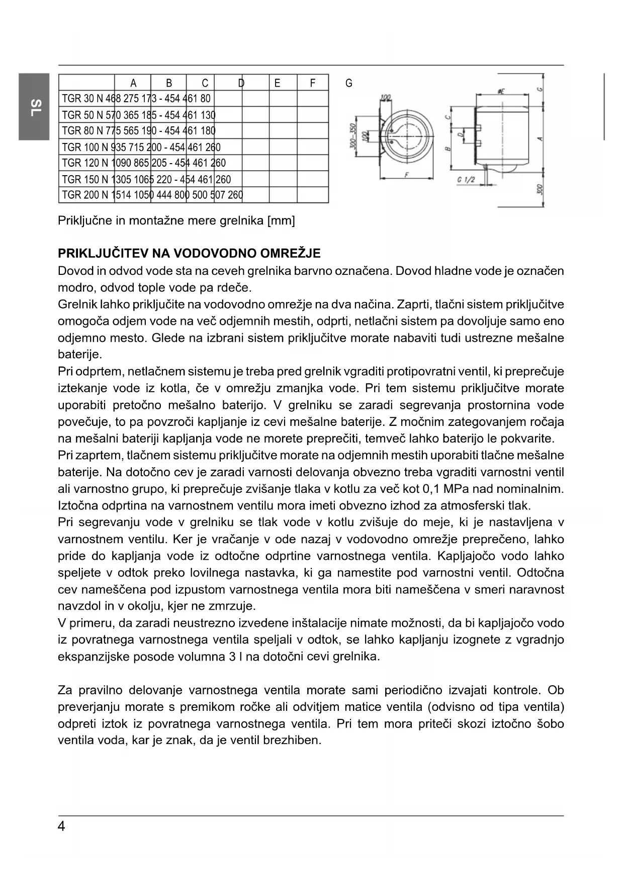 Dovod in odvod vode sta na ceveh grelnika barvno označena. Dovod hladne vode je označen modro, odvod tople vode pa rdeče. Grelnik lahko priključite na vodovodno omrežje na dva načina. Zaprti, tlačni sistem priključitve omogoča odjem vode na več odjemnih mestih, odprti, netlačni sistem pa dovoljuje samo eno odjemno mesto. Glede na izbrani sistem priključitve morate nabaviti tudi ustrezne mešalne baterije. Pri odprtem, netlačnem sistemu je treba pred grelnik vgraditi protipovratni ventil, ki preprečuje iztekanje vode iz kotla, če v omrežju zmanjka vode. Pri tem sistemu priključitve morate uporabiti pretočno mešalno baterijo. V grelniku se zaradi segrevanja prostornina vode povečuje, to pa povzroči kapljanje iz cevi mešalne baterije. Z močnim zategovanjem ročaja na mešalni bateriji kapljanja vode ne morete preprečiti, temveč lahko baterijo le pokvarite. Pri zaprtem, tlačnem sistemu priključitve morate na odjemnih mestih uporabiti tlačne mešalne baterije. Na dotočno cev je zaradi varnosti delovanja obvezno treba vgraditi varnostni ventil ali varnostno grupo, ki preprečuje zvišanje tlaka v kotlu za več kot 0,1 MPa nad nominalnim. Iztočna odprtina na varnostnem ventilu mora imeti obvezno izhod za atmosferski tlak. Pri segrevanju vode v grelniku se tlak vode v kotlu zvišuje do meje, ki je nastavljena v varnostnem ventilu. Ker je vračanje v ode nazaj v vodovodno omrežje preprečeno, lahko pride do kapljanja vode iz odtočne odprtine varnostnega ventila. Kapljajočo vodo lahko speljete v odtok preko lovilnega nastavka, ki ga namestite pod varnostni ventil. Odtočna cev nameščena pod izpustom varnostnega ventila mora biti nameščena v smeri naravnost navzdol in v okolju, kjer ne zmrzuje. V primeru, da zaradi neustrezno izvedene inštalacije nimate možnosti, da bi kapljajočo vodo iz povratnega varnostnega ventila speljali v odtok, se lahko kapljanju izognete z vgradnjo ekspanzijske posode volumna 3 l na dotoč ni cevi grelnika. Za pravilno delovanje varnostnega ventila morate sami periodično izvajati kontrole. Ob preverjanju morate s premikom ročke ali odvitjem matice ventila (odvisno od tipa ventila) odpreti iztok iz povratnega varnostnega ventila. Pri tem mora priteči skozi iztočno šobo ventila voda, kar je znak, da je ventil brezhiben.SL