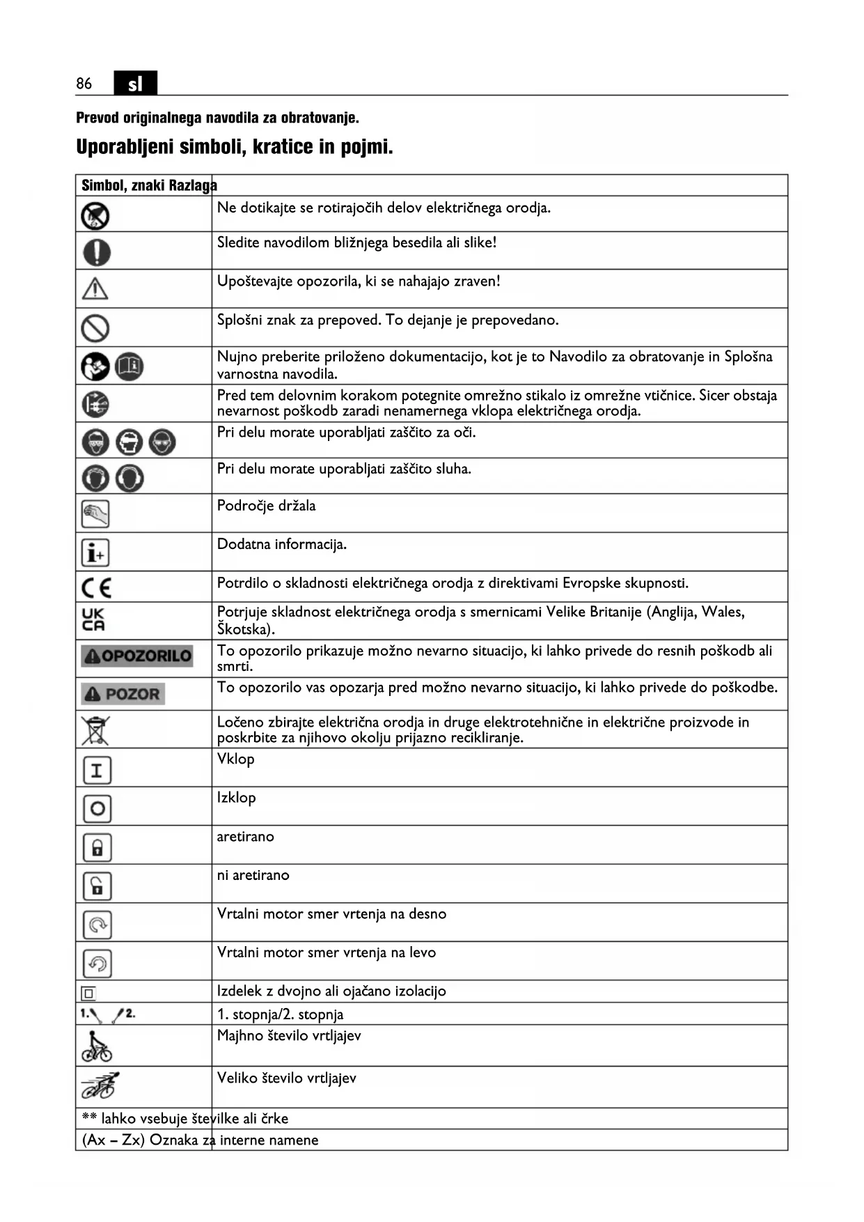 Prevod originalnega navodila za obratovanje. Uporabljeni simboli, kratice in pojmi. Simbol, znaki Razlaga Ne dotikajte se rotirajočih delov električnega orodja. Sledite navodilom bližnjega besedila ali slike! Upoštevajte opozorila, ki se nahajajo zraven! Splošni znak za prepoved. To dejanje je prepovedano. Nujno preberite priloženo dokumentacijo, kot je to Navodilo za obratovanje in Splošna varnostna navodila. Pred tem delovnim korakom potegnite omrežno stikalo iz omrežne vtičnice. Sicer obstaja nevarnost poškodb zaradi nenamernega vklopa električnega orodja. Pri delu morate uporabljati zaščito za oči. Pri delu morate uporabljati zaščito sluha. Področje držala Dodatna informacija. Potrdilo o skladnosti električnega orodja z direktivami Evropske skupnosti. Potrjuje skladnost električnega orodja s smernicami Velike Britanije (Anglija, Wales, Škotska). To opozorilo prikazuje možno nevarno situacijo, ki lahko privede do resnih poškodb ali smrti. To opozorilo vas opozarja pred možno nevarno situacijo, ki lahko privede do poškodbe. Ločeno zbirajte električna orodja in druge elektrotehnične in električne proizvode in poskrbite za njihovo okolju prijazno recikliranje. Vklop Izklop aretirano ni aretirano Vrtalni motor smer vrtenja na desno Vrtalni motor smer vrtenja na levo Izdelek z dvojno ali ojačano izolacijo