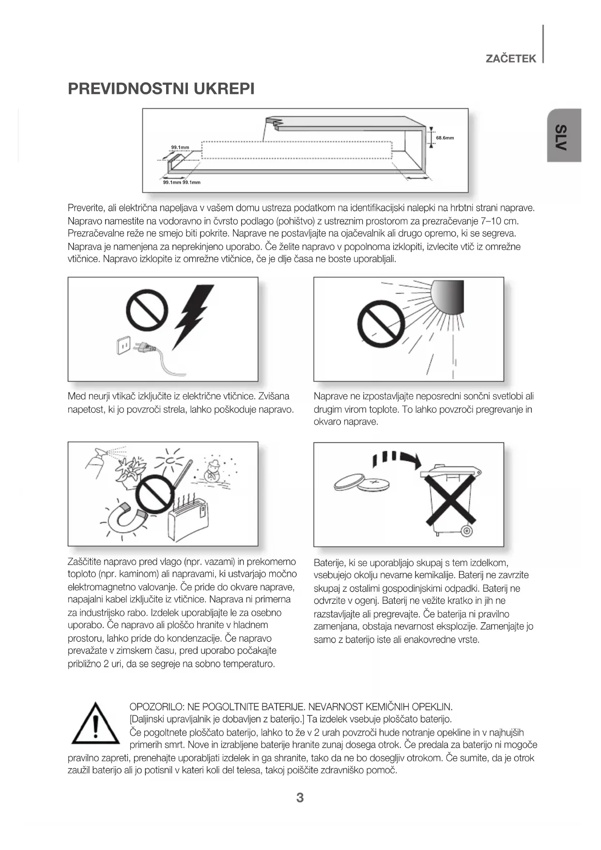 28 Odpravljanje težav 29 DODATEK 29 Tehnične lastnosti VSEBINA ● Slike in ilustracije v tem uporabniškem priročniku so samo informativne in se lahko razlikujejo od dejanskega videza izdelka. ● V naslednjih primerih vam lahko zaračunamo administrativne stroške: (a) če na dom pokličete serviserja in se izkaže, da izdelek ni pokvarjen (kar pomeni, da niste prebrali tega uporabniškega priročnika); (b) če napravo prinesete na servis in se izkaže, da ni pokvarjena (kar pomeni, da niste prebrali tega uporabniškega priročnika). ● O znesku administrativnih stroškov vas bomo obvestili pred začetkom dela na izdelku oz. pred obiskom na domu.5 SLV ZAČETEK