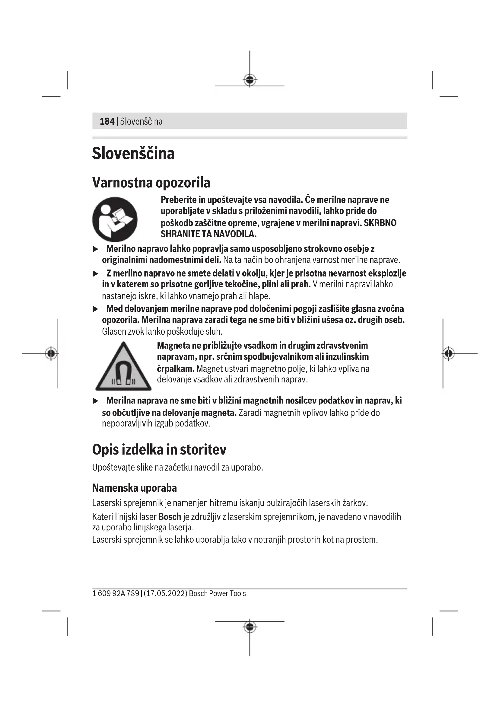 Baterije 2×1,5V LR3(AAA) Čas delovanja pribl. 30h Teža v skladu z EPTA-Procedure01:2014 0,12kg Dimenzije (dolžina × širina × višina) 69×28×123mm Vrsta zaščite IP54 (zaščita pred prahom in škropljenjem vode) A) Delovno območje se lahko zaradi neugodnih pogojev v okolici (na primer zaradi neposrednega sončnega sevanja) zmanjša. B) X: največje delovno območje za delovanje z laserskim sprejemnikom v skladu z navodili za uporabo uporabljenega linijskega laserjaBosch C) Odvisno od razdalje med laserskim sprejemnikom in linijskim laserjem D) Nastane samo neprevodna umazanija, vendar lahko kljub temu občasno pride do prevodnosti, ki jo povzroči kondenzat. Nedvoumna identifikacija vašega laserskega sprejemnika je možna s serijsko številko (13) na tipski tablici. Podatki o hrupu A-vrednotena raven zvočnega tlaka za zvočni signal na razdalji enega metra znaša80dB(A). Laserskega sprejemnika ne držite blizu ušesa! 1 609 92A 7S9 | (17.05.2022) Bosch Power ToolsSlovenščina | 187 Namestitev Namestitev/menjava baterij Pri uporabi laserskega sprejemnika priporočamo uporabo alkalnih manganskih baterij. Zapah (15) pokrova predala za bateriji povlecite navzven in pokrov (14) odprite. Vstavite bateriji. Pri tem pazite na pravilnost polov, ki je prikazana na pokrovu predala za baterije. Ko se baterije praznijo, začne prikaz stanja(3) utripati. Laserski sprejemnik je mogoče uporabljati še okoli 2h. Bateriji vedno zamenjajte sočasno. Uporabljajte zgolj baterije istega proizvajalca z enako zmogljivostjo. u Če laserskega sprejemnika dalj časa ne boste uporabljali, iz njega odstranite baterije. Pri daljšem skladiščenju laserskega sprejemnika lahko baterije korodirajo in se samodejno izpraznijo. Delovanje Uporaba u Laserski sprejemnik zaščitite pred vlago in neposredno sončno svetlobo. u Ne izpostavljajte laserskega sprejemnika ekstremnim temperaturam ali ekstremnemu nihanju temperature. Poskrbite za to, da npr. ne bo ležal dalj časa v avtomobilu. Če je bil laserski sprejemnik izpostavljen večjim temperaturnim nihanjem, najprej pustite, da se temperatura pred uporabo uravna. Pri ekstremnih temperaturah ali temperaturnih nihanjih se lahko poškoduje natančnost delovanja laserskega sprejemnika. Postavitev laserskega sprejemnika (glejteslikoA) Laserski sprejemnik postavite vsaj5m stran od linijskega laserja. Prepričajte se, da je na linijskem laserju vklopljen način dela s sprejemnikom. Izberite način delovanja, kjer se ustvari samo ena vodoravna ali samo ena navpična laserska ravnina. Opomba: ne izberite vrste delovanja, ki sočasno omogoča vodoravno in navpično lasersko ravnino (križno linijsko delovanje), ker bi se lahko prikazali napačni podatki o višini laserskega žarka. Laserski sprejemnik namestite tako, da lahko laserski žarek doseže sprejemno polje(9). Namestite ga tako, da laserski žarek prečno preide sprejemno polje (kot je prikazano na sliki). Bosch Power Tools 1 609 92A 7S9 | (17.05.2022)188 | Slovenščina Vklop/izklop u Pri vkopu laserskega sprejemnika se zasliši glasen zvočni signal. Laserski sprejemnik se zaradi tega pri vklopu ne sme nahajati v bližini ušesa oz. drugih oseb. Glasen zvok lahko poškoduje sluh. Za vklop laserskega sprejemnika pritisnite tipko za vklop/izklop(2). Vse LED-diode za kratek čas zasvetijo in zasliši se zvočni signal. Po vklopu laserskega sprejemnika sta vedno nastavljeni nizka glasnost in „fina“ natančnost sprejema. Za izklop laserskega sprejemnika ponovno pritisnite tipko za vklop/izklop(2). Pred izklopom vse LED-diode na kratko zasvetijo, poleg tega pa se zaslišijo trije zvočni signali. Prikaz stanja(3) se izklopi. Če približno 20min ne pritisnete nobene tipke na laserskem sprejemniku in če na sprejemno polje(9) 20min ne pade noben laserski žarek, se laserski sprejemnik zaradi varčevanja z baterijami samodejno izklopi. Izbira nastavitve prikaza srednje linije S tipko za nastavitev natančnosti sprejema(1) lahko določite, s kakšno natančnostjo bo položaj laserskega žarka na sprejemnem polju prikazan kot „sredinski“: – Natančnost sprejema „fino“ (LED srednje linije(7) utripa), – Natančnost sprejema „grobo“ (utripata LED-prikaza smeri „laserski žarek nad srednjo linijo“(6) in „laserski žarek pod srednjo linijo“(8)). Smerokazi Položaj laserskega žarka na sprejemnem polju(9) se prikaže: – z LED-prikazoma smeri „laserski žarek nad srednjo linijo“(6), „laserski žarek nad srednjo linijo“(8) oz. srednjo linijo(7) na sprednji in zadnji strani laserskega sprejemnika, – po izbiri z zvočnim signalom. Laserski sprejemnik prenizko: če preide laserski žarek skozi spodnjo polovico sprejemnega polja(9), zasveti LED-prikaz smeri „laserski žarek nad srednjo linijo“(6). Če je vklopljen zvočni signal, se zasliši signal z višjo frekvenco. Premaknite laserski sprejemnik v smeri puščice navzgor. Laserski sprejemnik previsoko: če preide laserski žarek skozi spodnjo polovico sprejemnega polja(9), zasveti LED-prikaz smeri „laserski žarek pod srednjo linijo“(8). Če je vklopljen zvočni signal, se zasliši signal z nižjo frekvenco. Premaknite laserski sprejemnik v smeri puščice navzdol. 1 609 92A 7S9 | (17.05.2022) Bosch Power ToolsSlovenščina | 189 Laserski sprejemnik je v srednjem položaju: če laserski žarek prečka sprejemno polje(9) v višini oznake sredine(12), sveti LED-dioda srednje linije(7). Če je vklopljen zvočni signal, se zasliši neprekinjen zvočni signal. Zvočno opozorilo za prikaz laserskega žarka Položaj laserskega žarka na sprejemnem polju(9) lahko označuje tudi zvočno opozorilo. Glasnost lahko spremenite ali pa izklopite zvočni signal. Za spremembo oz. izklop zvočnega signala pritisnite tipko za zvočni signal(4). Pri nizki glasnosti se zasliši kratek zvočni signal, poleg tega zasveti LED srednje linije(7), pri visoki glasnosti se zasliši kratek zvočni signal, poleg tega zasvetijo LED-prikazi smeri(6), (7) in(8
